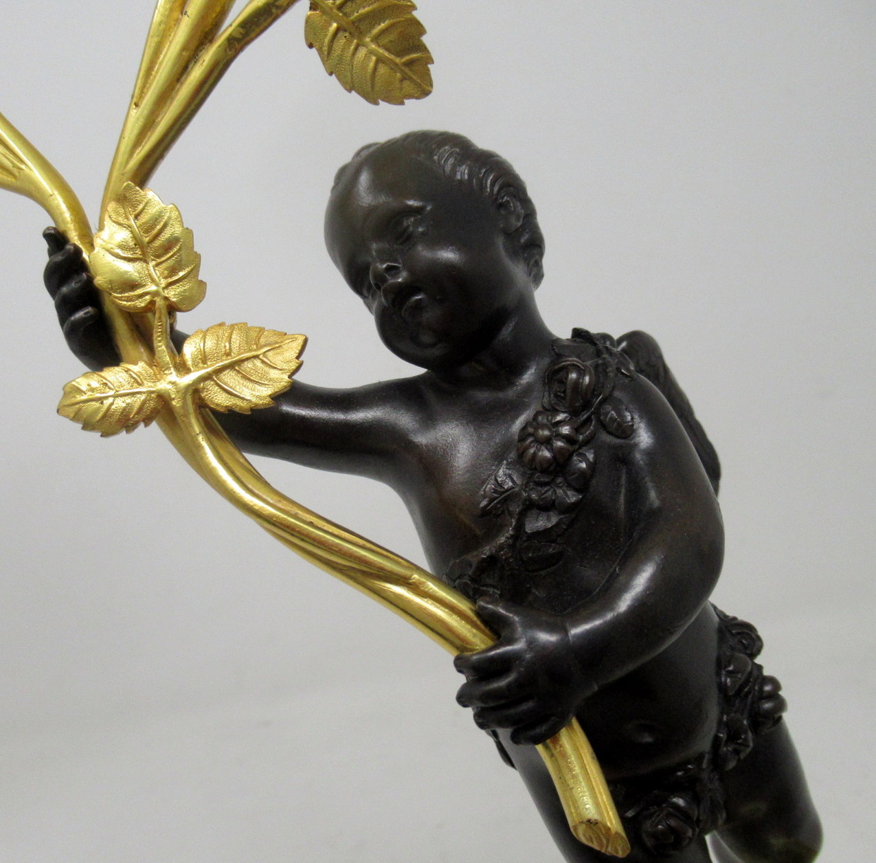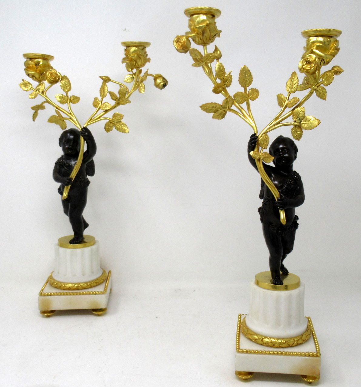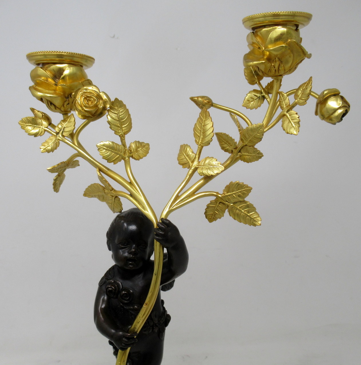 A Very Fine Quality Pair of French Louis XV inspired Patinated and Gilt Bronze Figural Twin Branch Candelabra of good size proportions (see last image in-situ) depicting Bacchanal Figures of standing Winged Cherubs or Putto. Both with finely sculped features and mounted atop a circular reeded statutory marble socle ending on a square platform base raised on four decorative toupie ormolu supports, made during the first half of the Nineteenth Century, after a model by Claude Michel Clodion French 1738-1814.