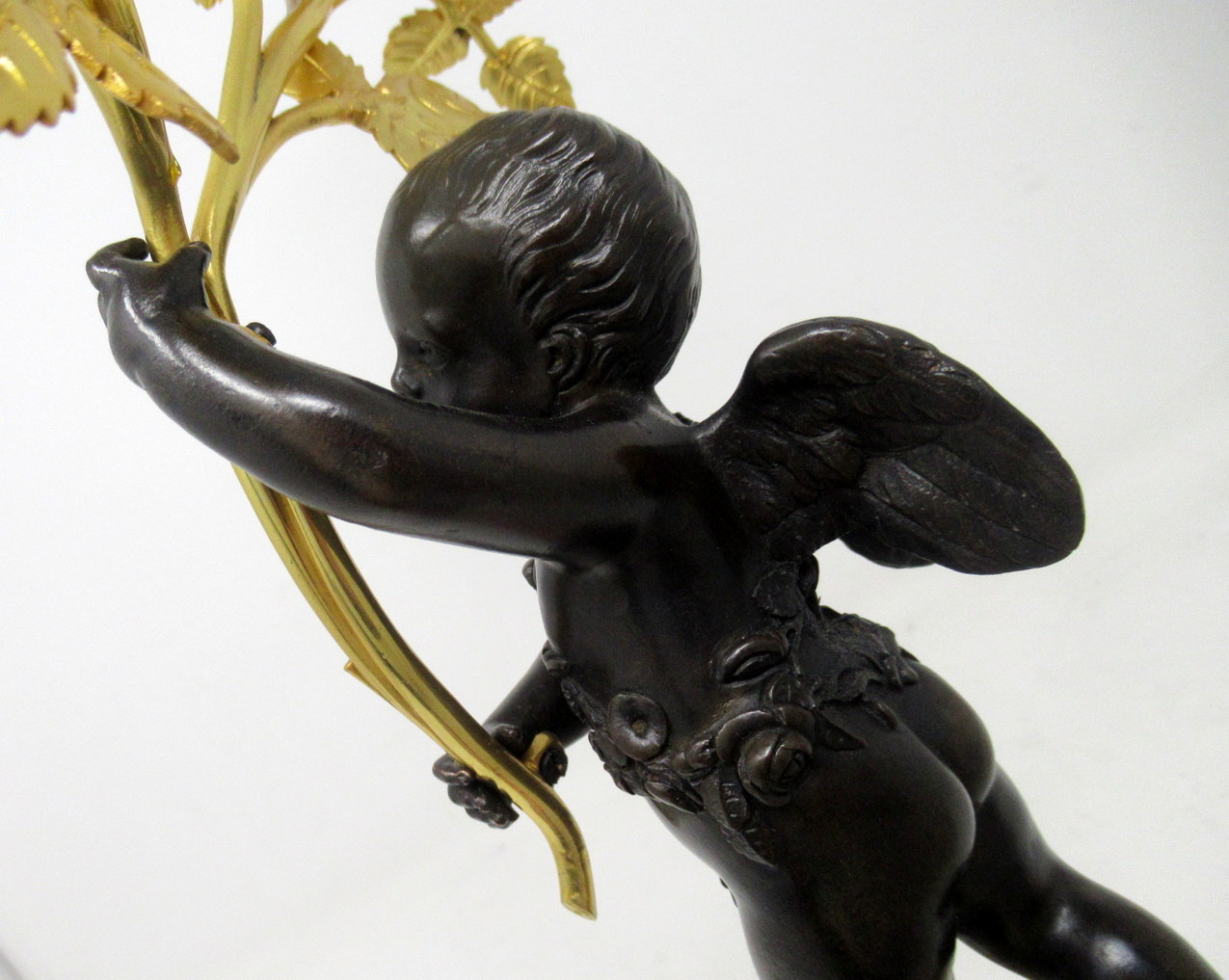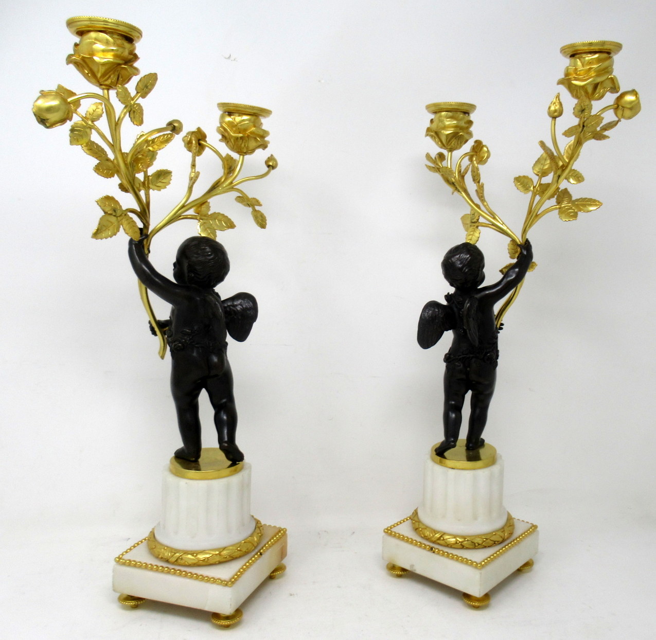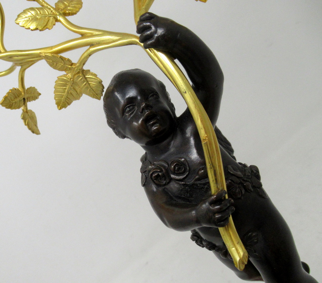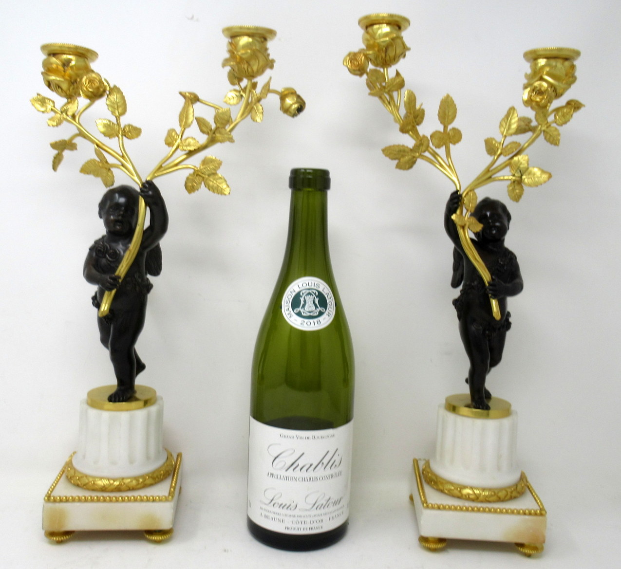 A Very Fine Quality Pair of French Louis XV inspired Patinated and Gilt Bronze Figural Twin Branch Candelabra of good size proportions (see last image in-situ) depicting Bacchanal Figures of standing Winged Cherubs or Putto. Both with finely sculped features and mounted atop a circular reeded statutory marble socle ending on a square platform base raised on four decorative toupie ormolu supports, made during the first half of the Nineteenth Century, after a model by Claude Michel Clodion French 1738-1814.