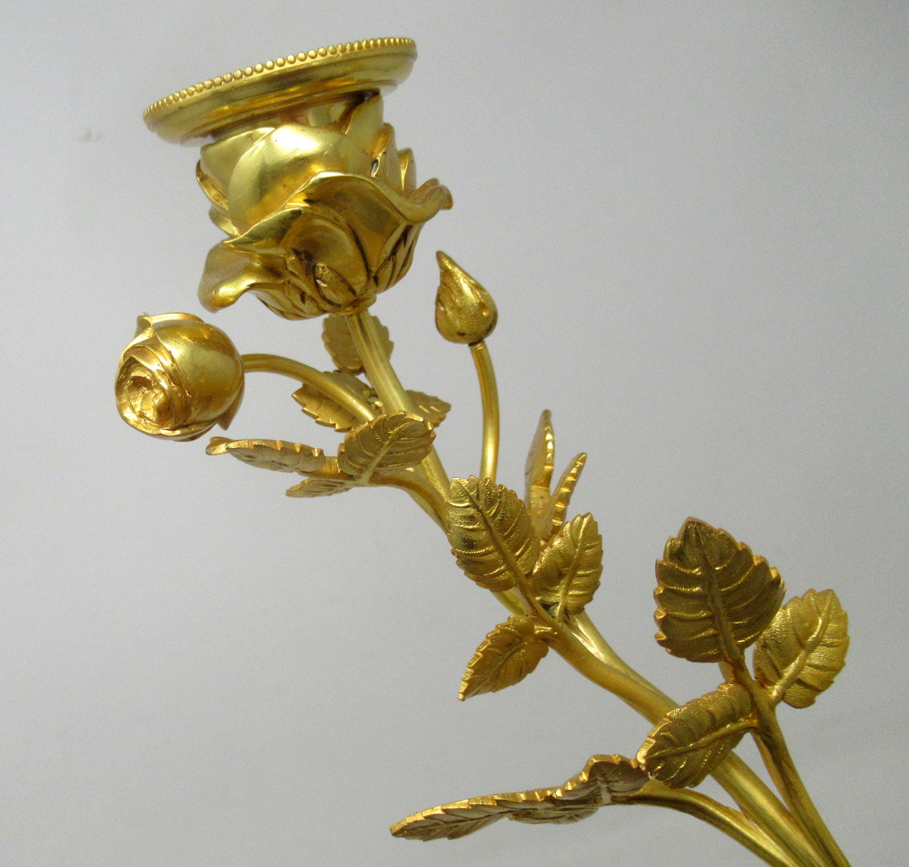 Both supporting twin branches decorated with applied veined leaves and rose buds topped with original firm fitting drip pans