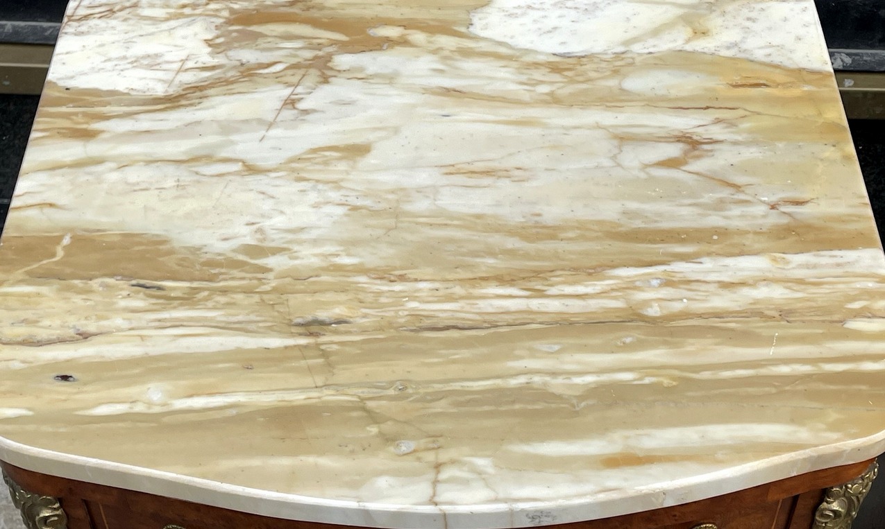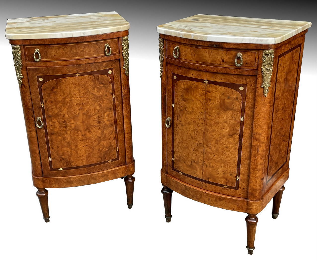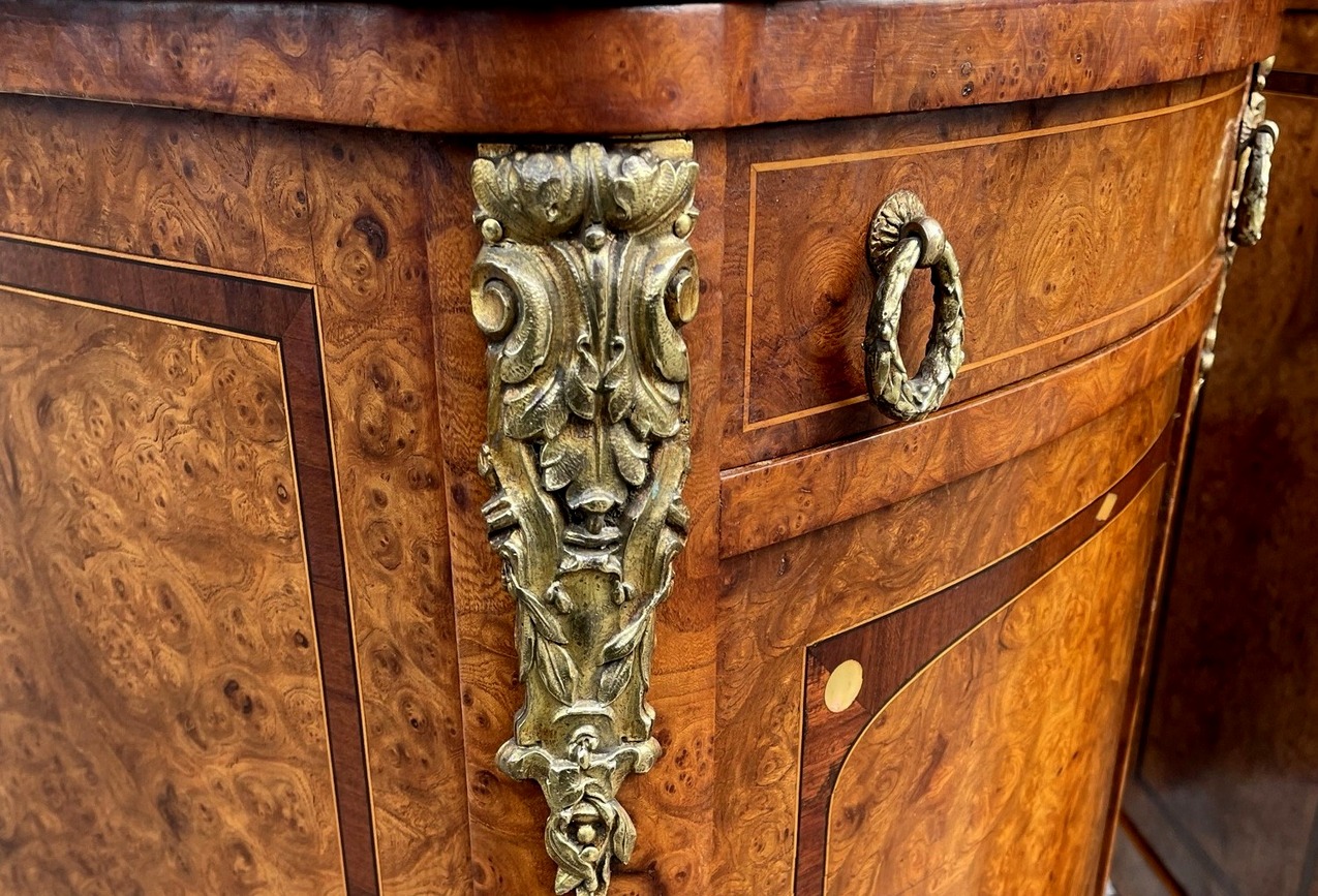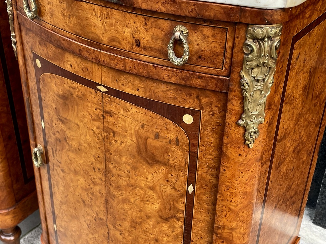 872. Antique French Ormolu Marble Top Burl Walnut Bedside Cabinets Locker Nightstands