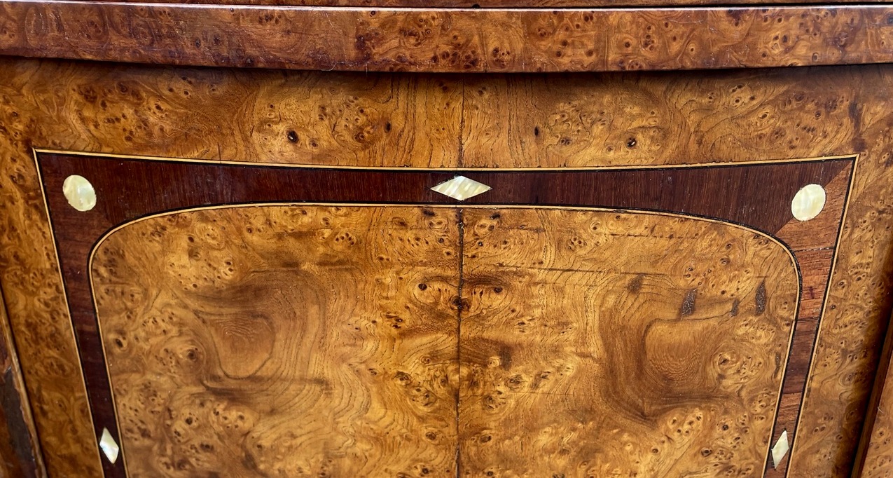 Stunning Identical Pair of French bow front Burr Walnut well veined marble topped Bedside Lockers Nightstands of outstanding quality, last quarter of the Nineteenth Century, made by Edinburgh Cabinet Makers J & T Scott 10 George Street.