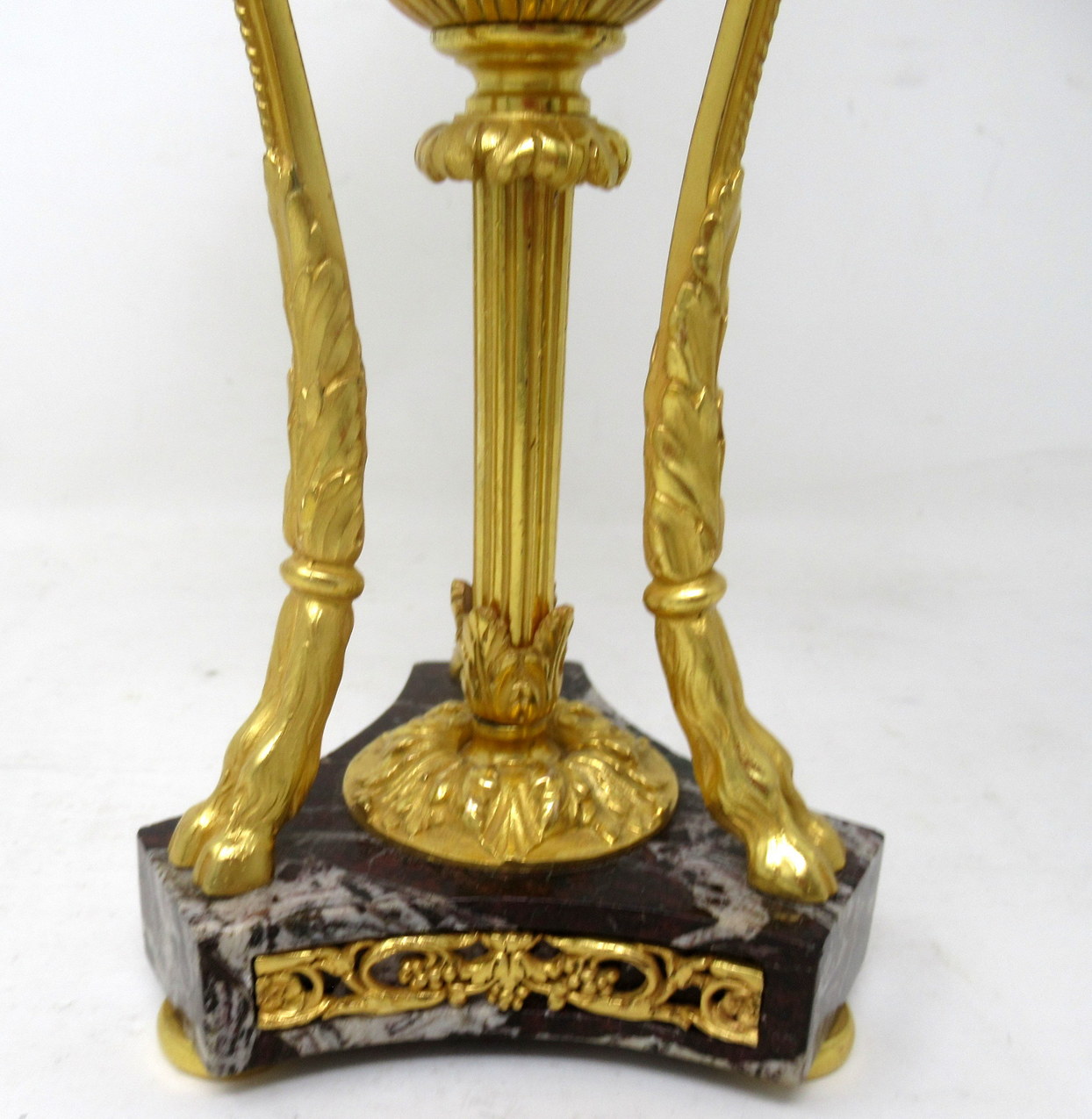 The main ovoid marble body with a central decorative ormolu band mounted with three female faces each below an upright lavish cast decorative crown, ending on three claw supports on a dark burgundy white veined marble tripod inverted triangular base resting on three ormolu toupie feet.