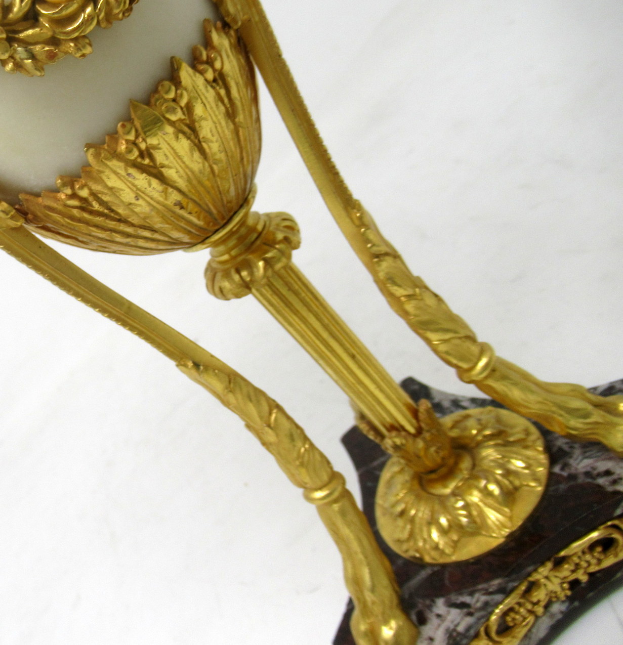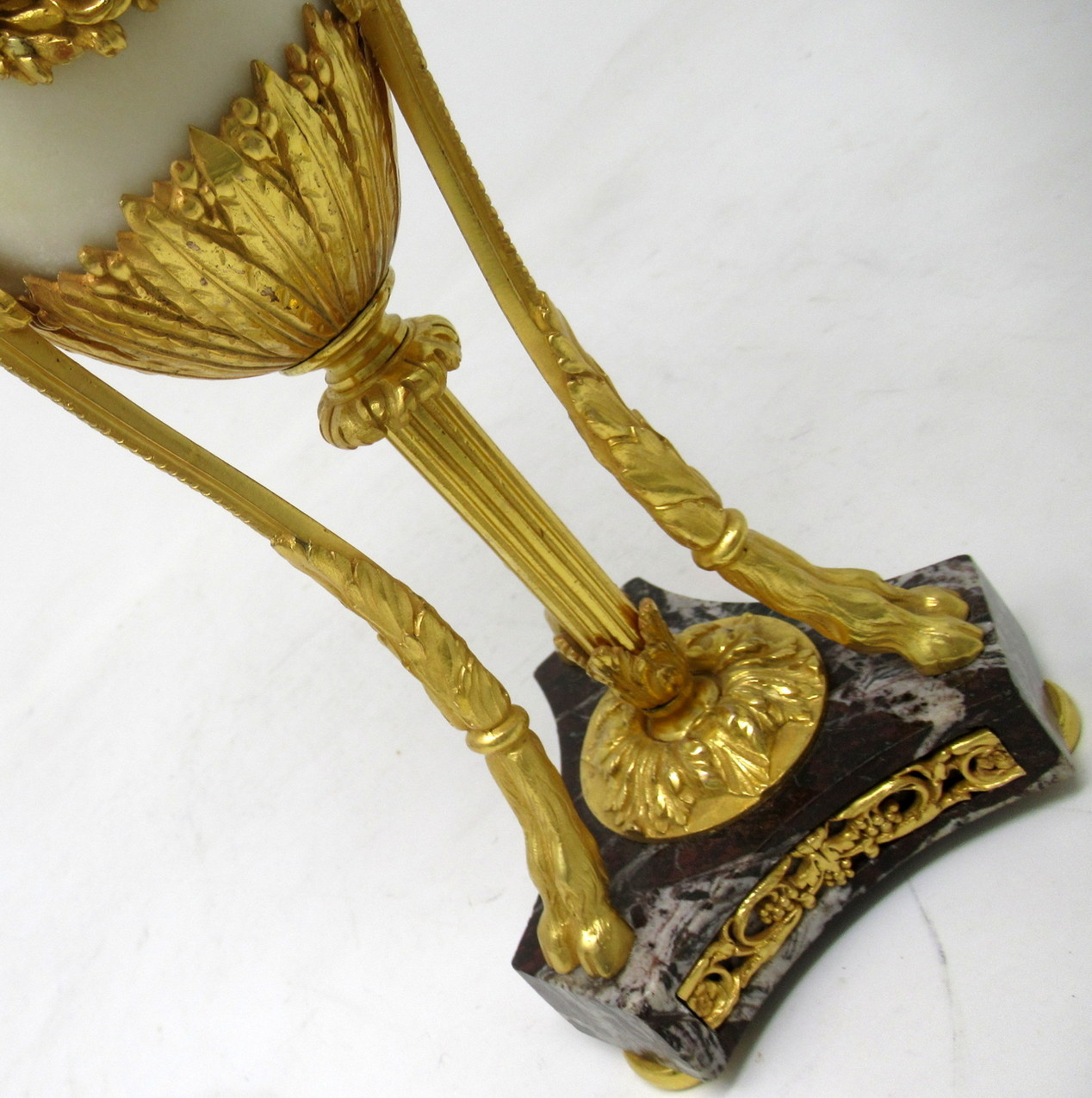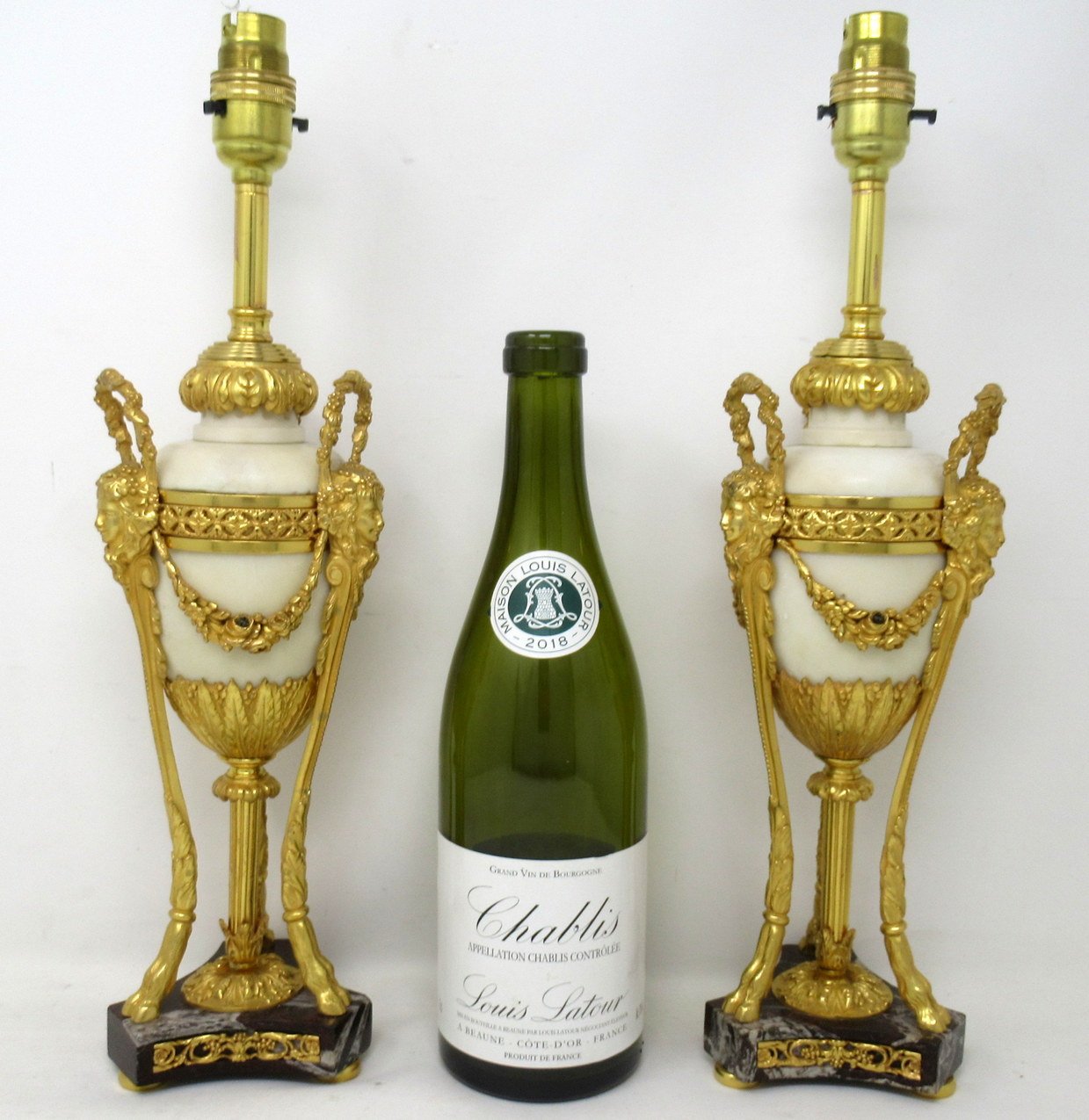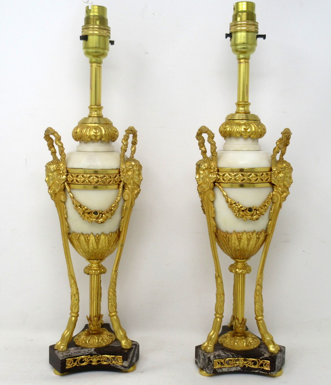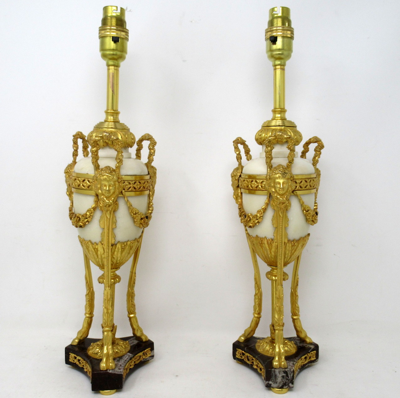 An Exceptionally Fine Quality Pair of French Heavy Gauge Chisel Cast Ormolu-Mounted Statutory Cream Marble Garniture Urns, of elegant tall proportions, of French origin, now professionally converted to a Pair Electrical Table Lamps. First quarter of the Nineteenth Century, Regency Period.