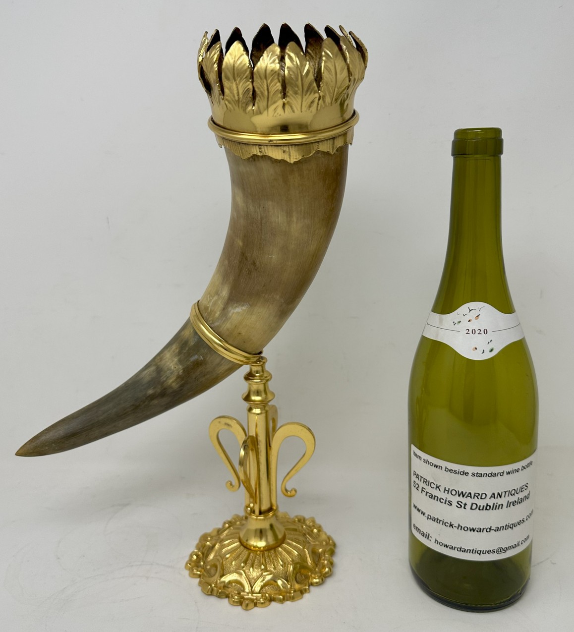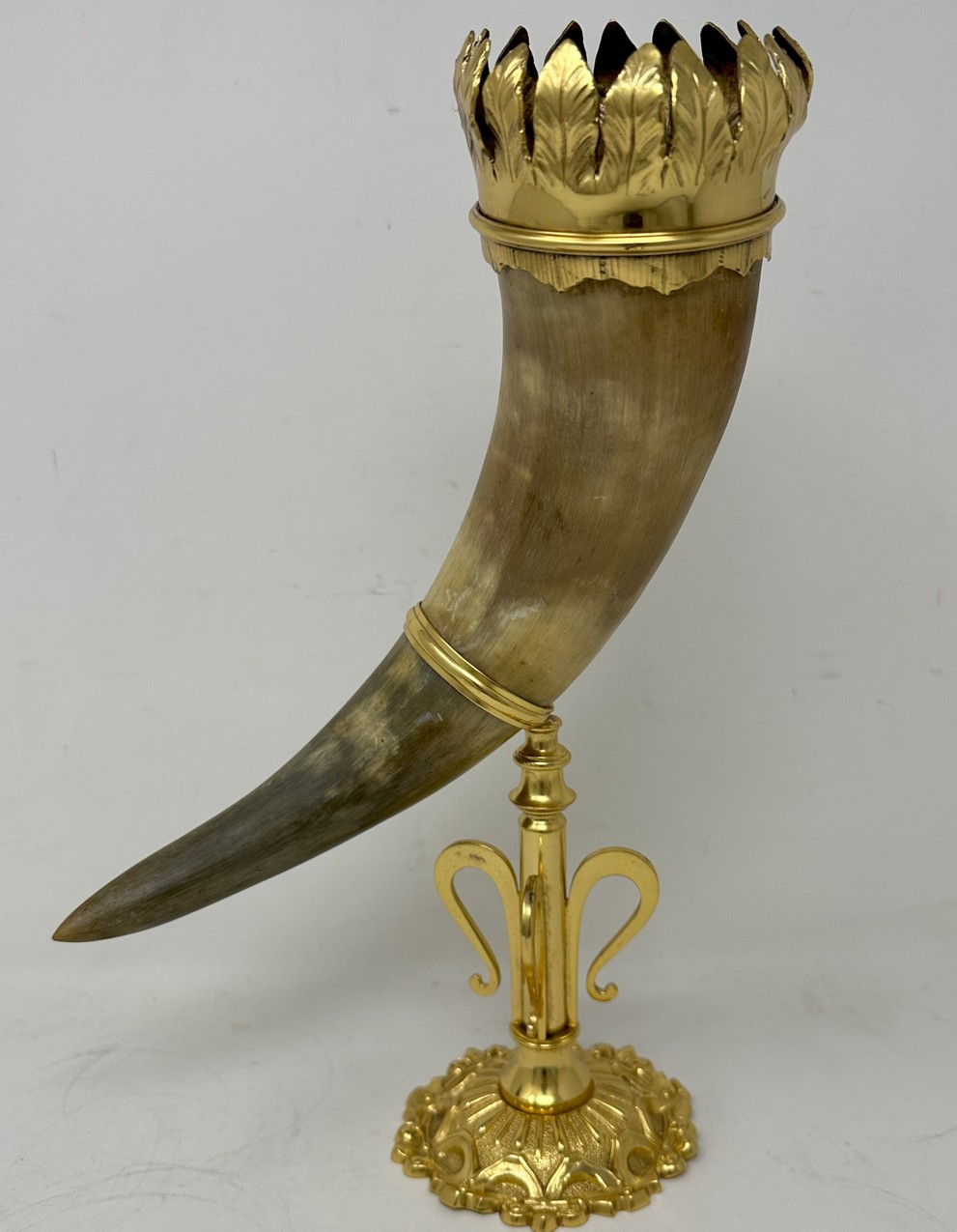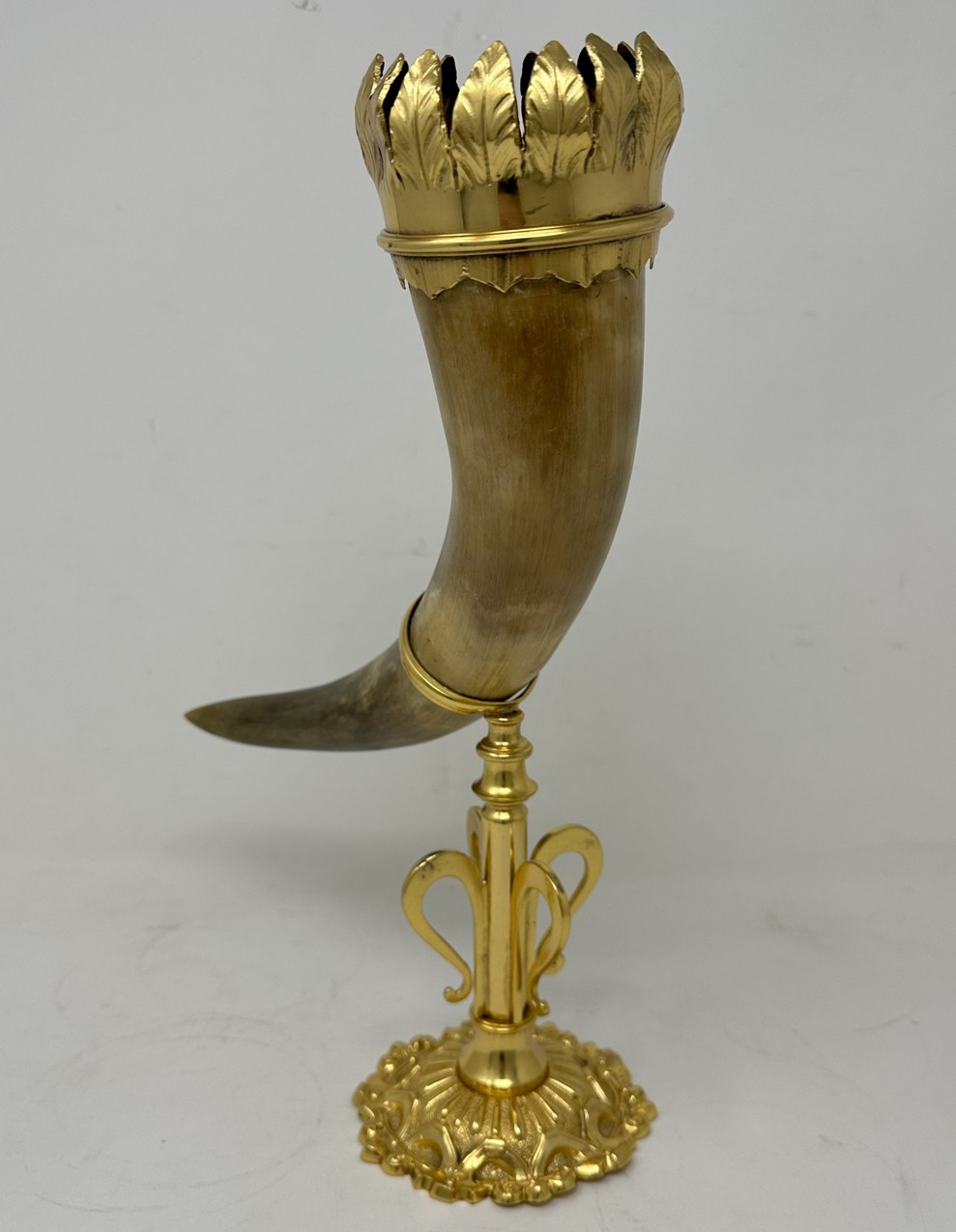 The unusually large horn with a wide ormolu band with leaf decoration, mounted on a very ornate stand with a central slender stem ending on a circular spreading decorative base.
