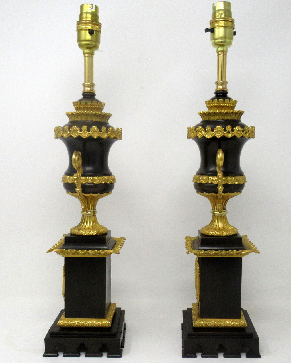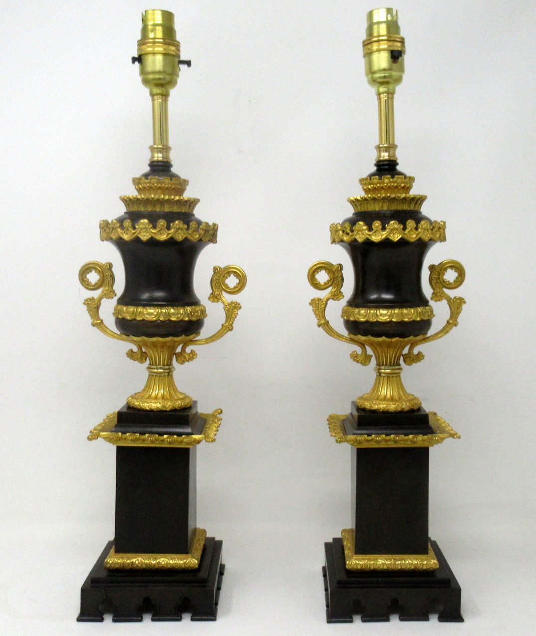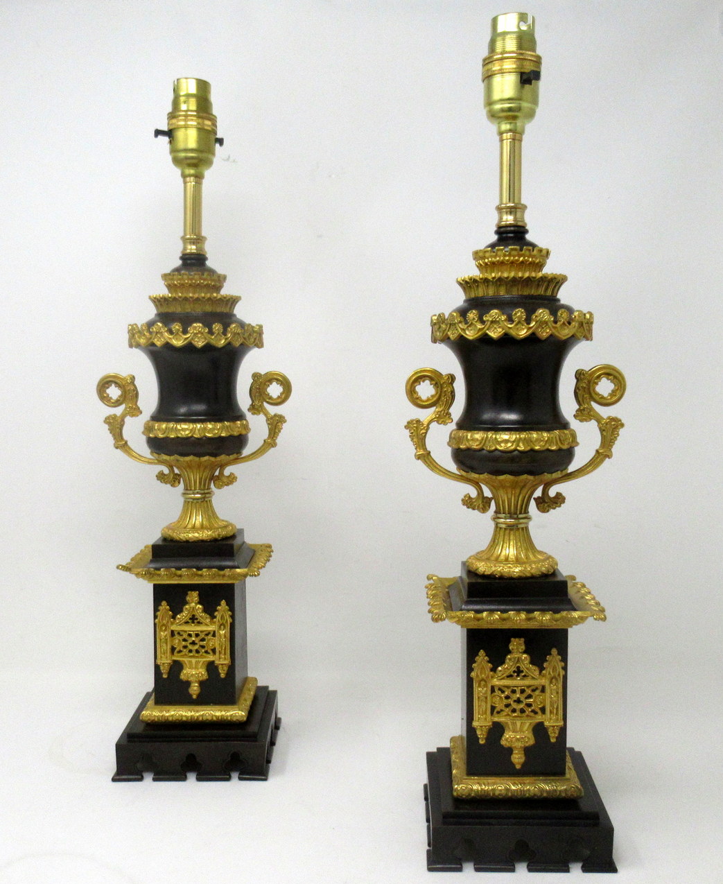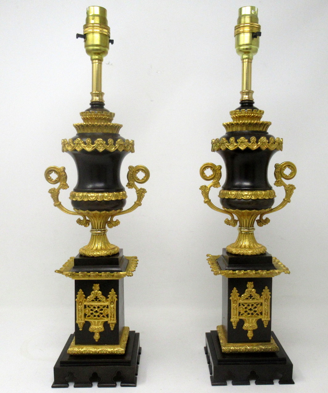 Stunning Pair French Heavy Gauge Ormolu and Bronze Grand Tour Gothic Style Campana formed Urns now converted to Electric Table Lamps, of outstanding quality of good size proportions,