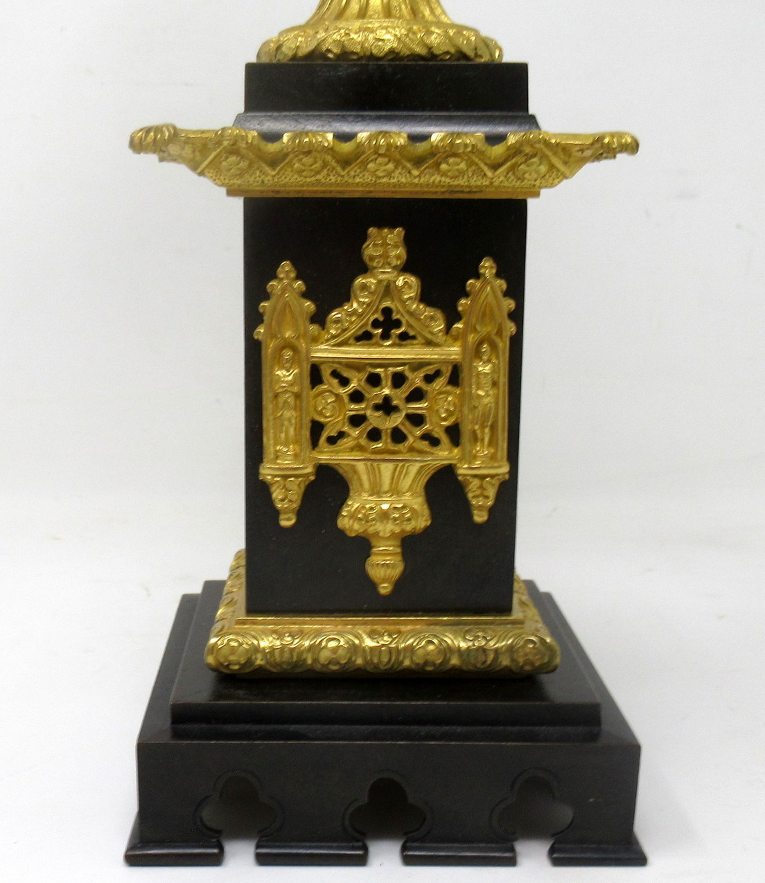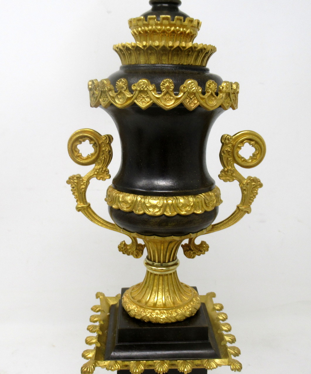 Each Urn with twin scrolling ormolu handles above a square plinth with a square central ormolu Classical Gothic insert, raised on ornate base with exquisite ormolu acanthus leaf castings, ending on bronze fret-cut platform base. Mid to late Nineteenth Century.