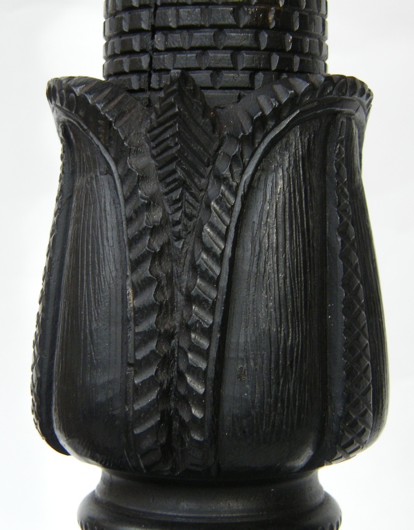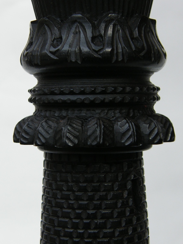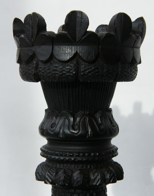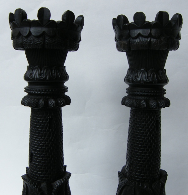 Superb Pair of Nineteenth Century Hand Carved Irish Bog Oak Single Light Candlesticks of unusually large proportions, possibly the work of Cornelius Goggin.