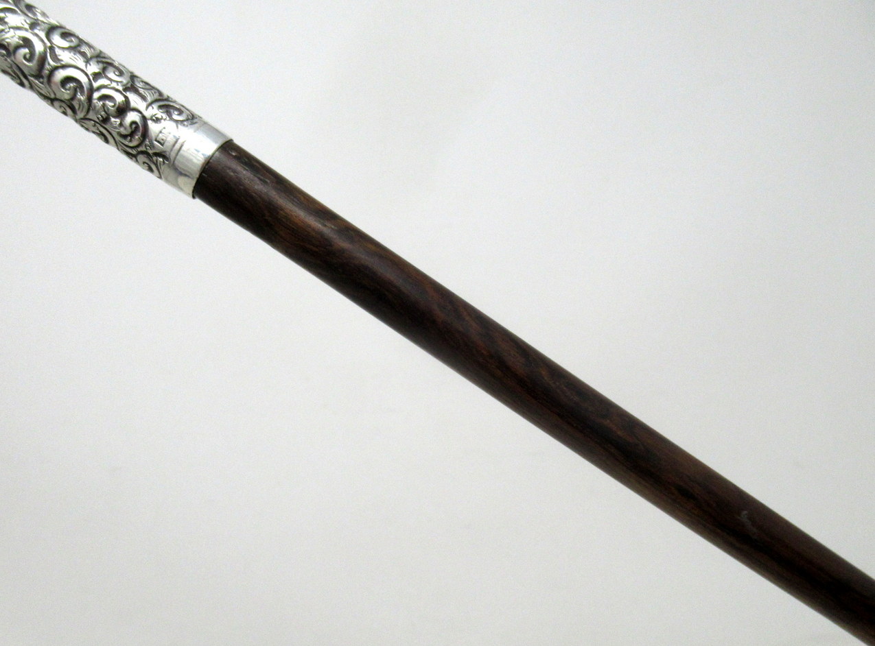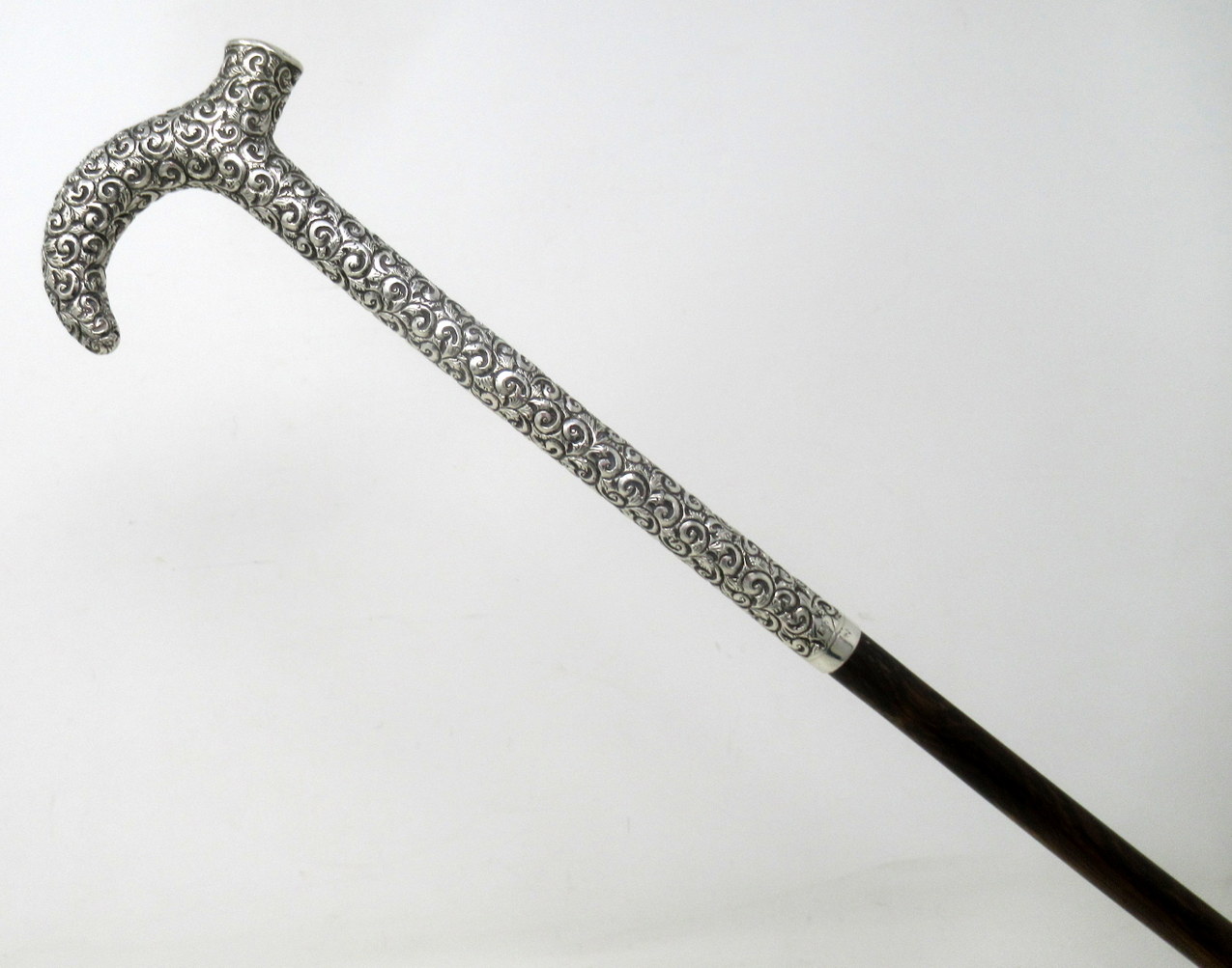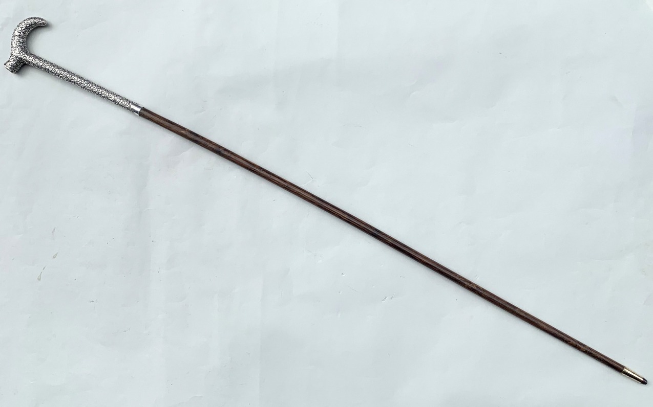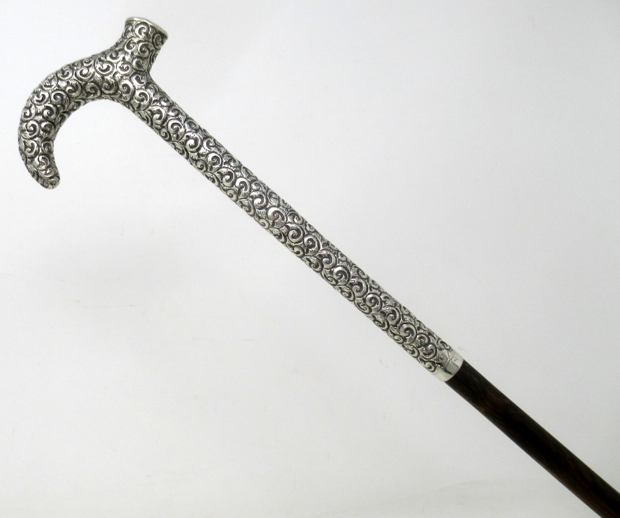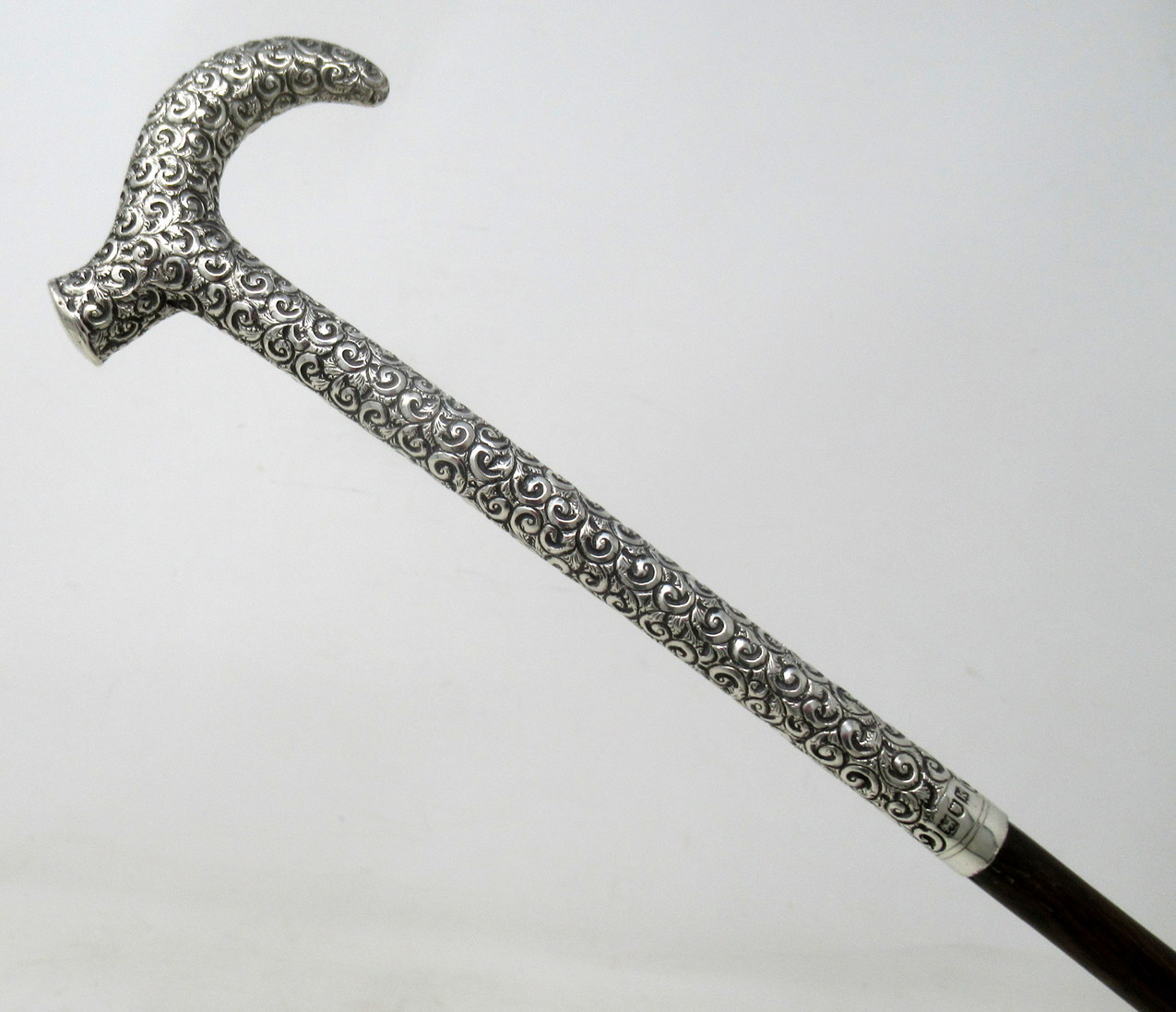 Stylish Solid Polished Rosewood Embossed Sterling Silver Lady’s Walking Stick with Traditional Crook shaped handle, complete with its original bi-metal polished brass and steel ferrule, which is not worn from use.