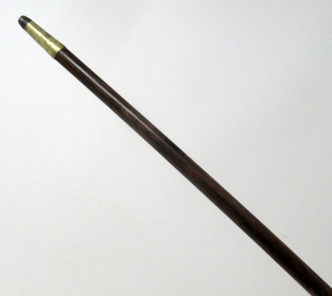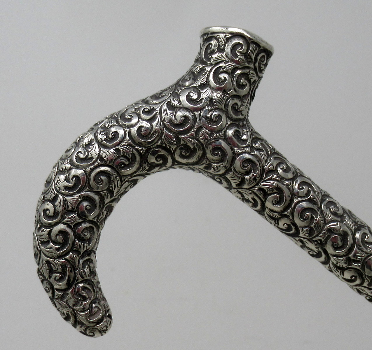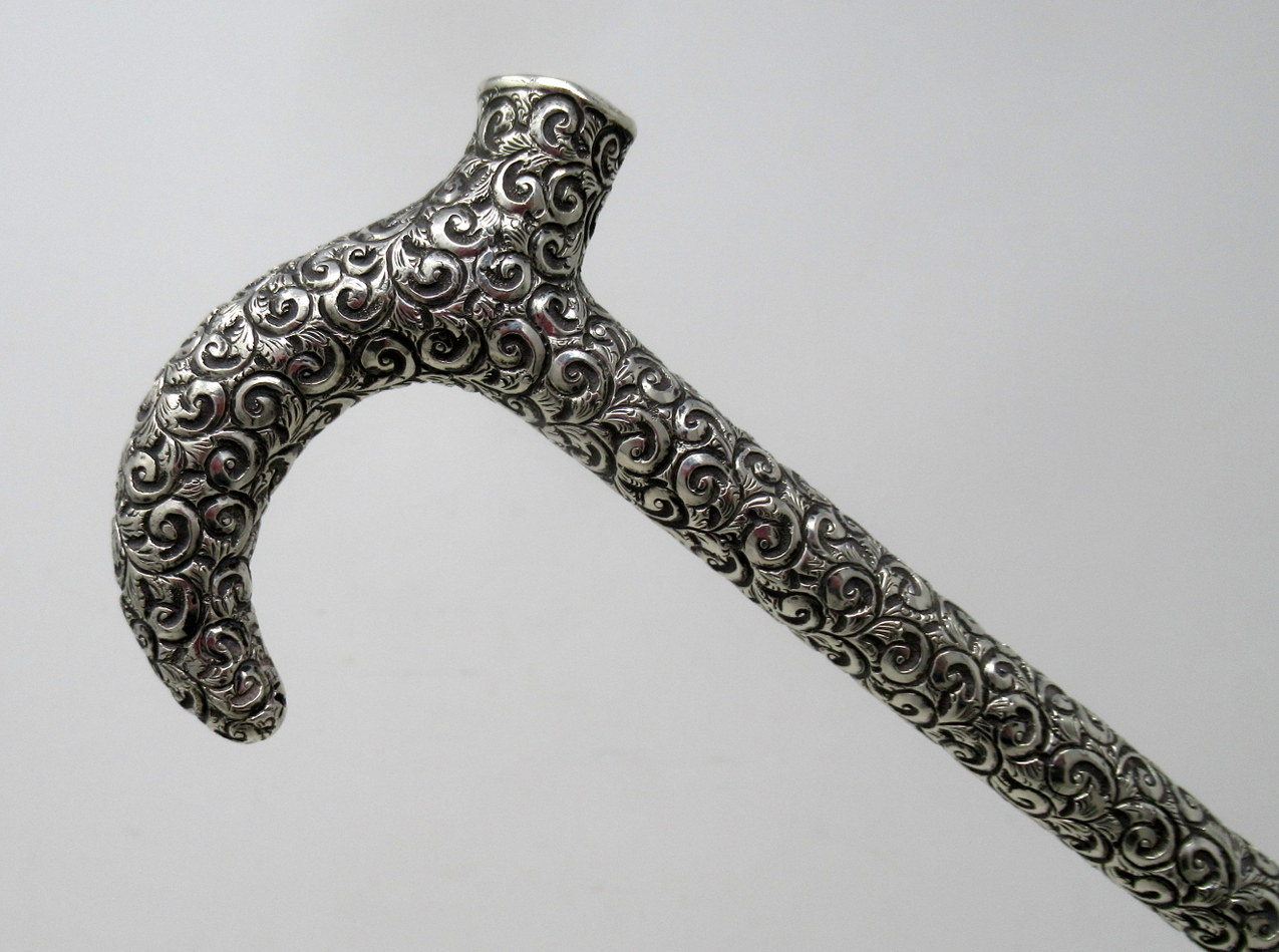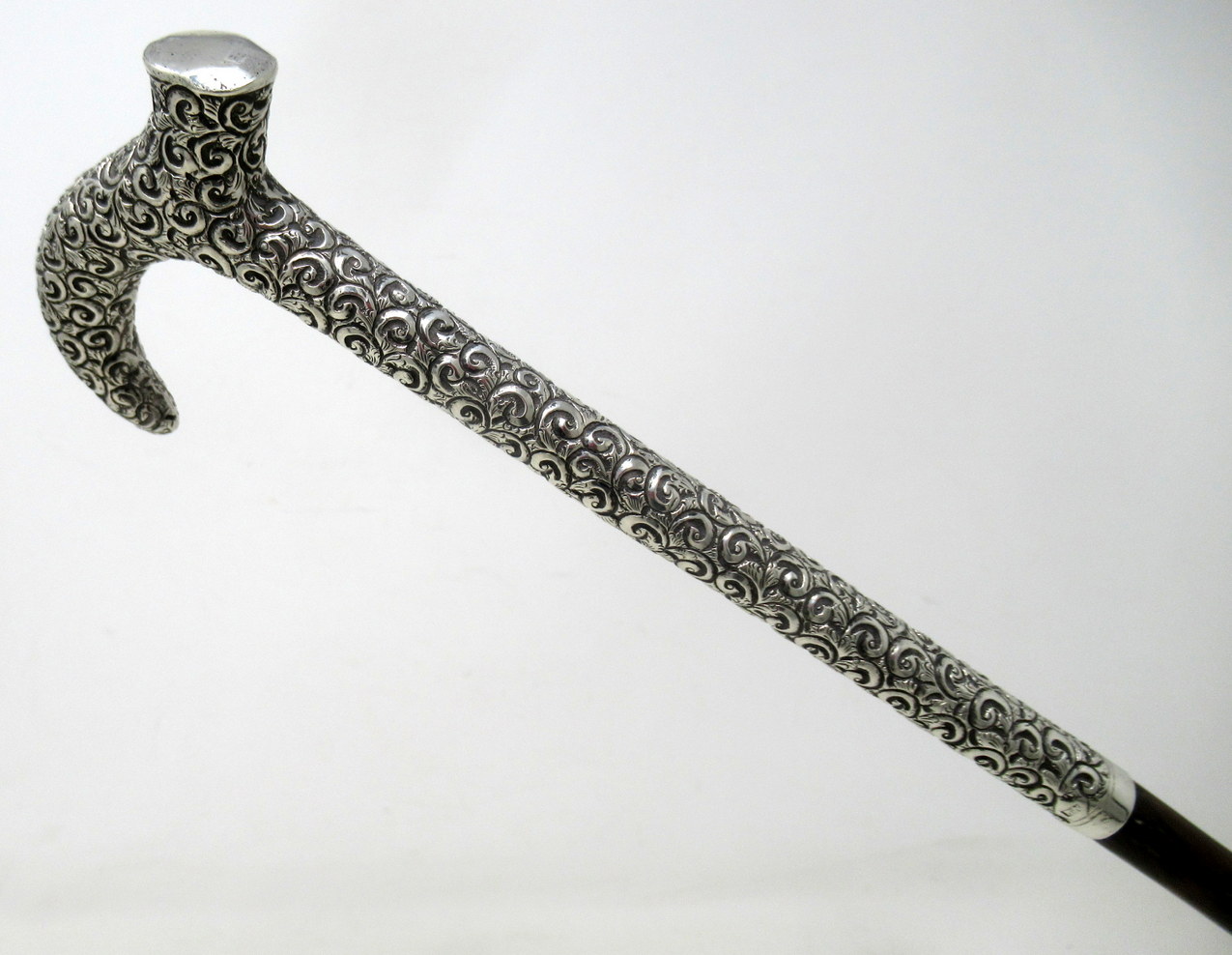 Stylish Solid Polished Rosewood Embossed Sterling Silver Lady’s Walking Stick with Traditional Crook shaped handle, complete with its original bi-metal polished brass and steel ferrule, which is not worn from use.