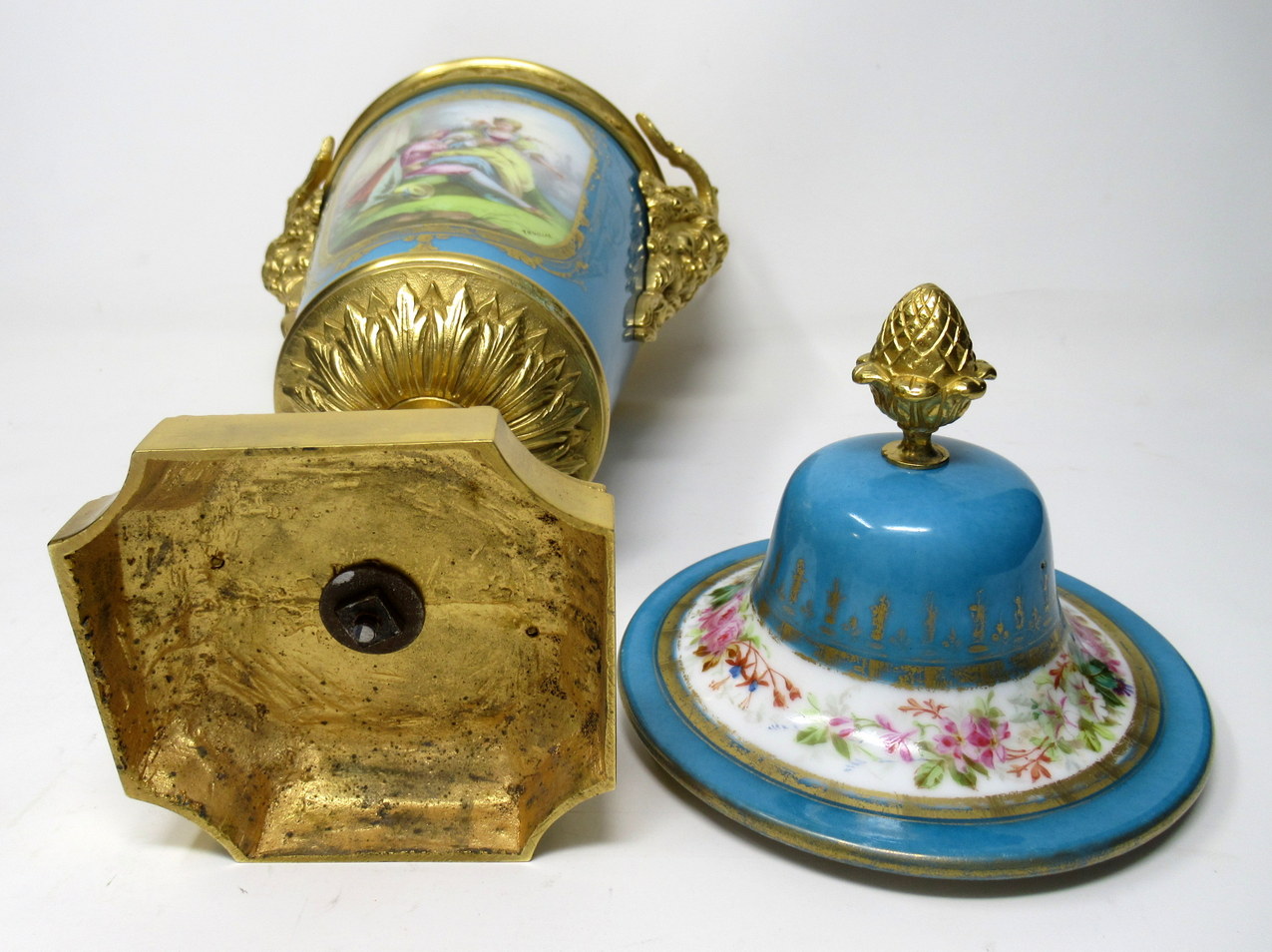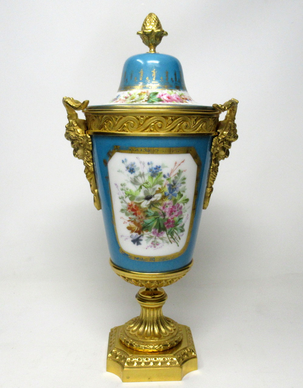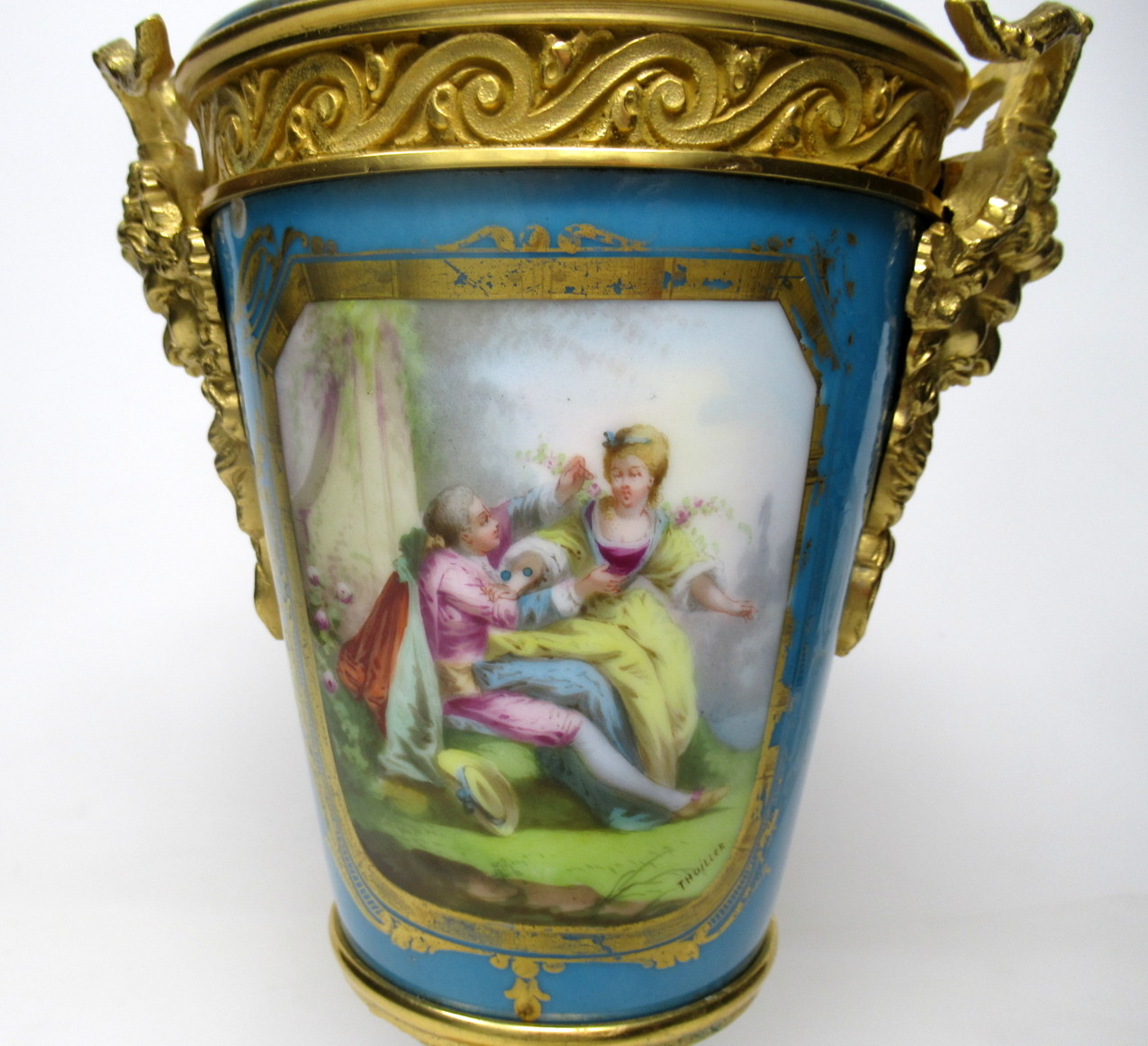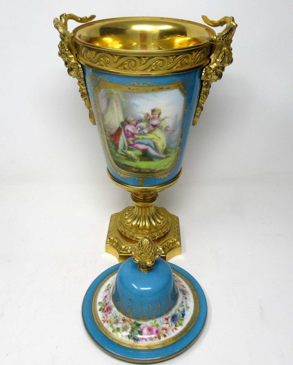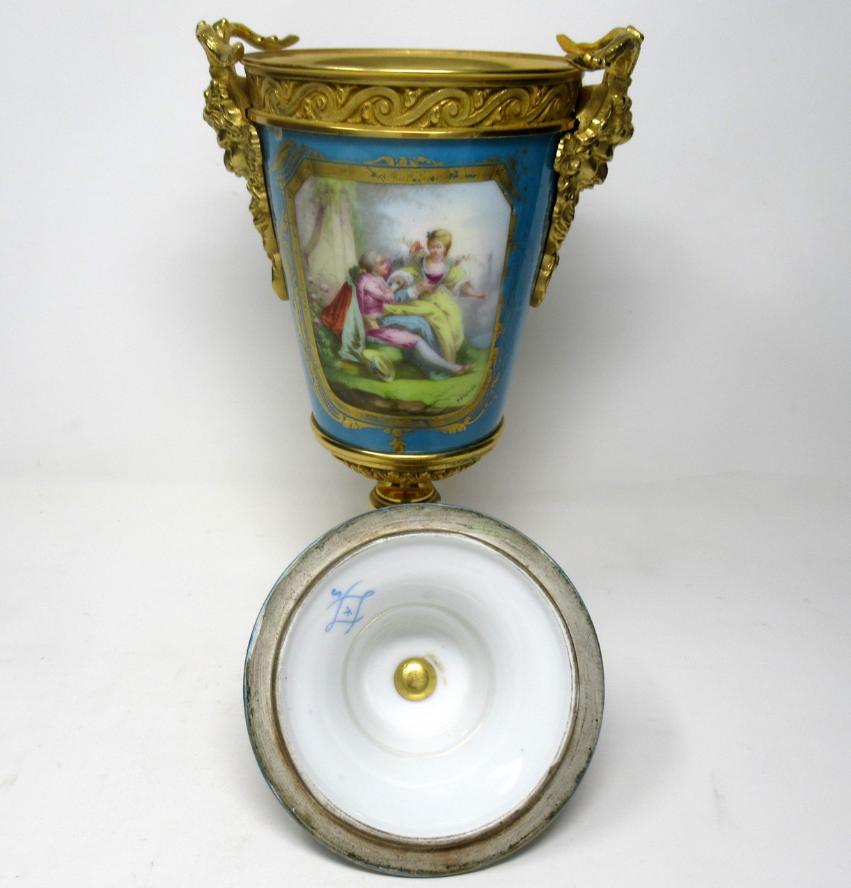 The twin handles exquisitely modelled as Satyrs. The central front reserve depicting a Courting Couple in Eighteenth Century dress in landscape, back view with still life scene of Summer Flowers on a rich celiste blue ground. The original firm fitting cover with Acorn finial.