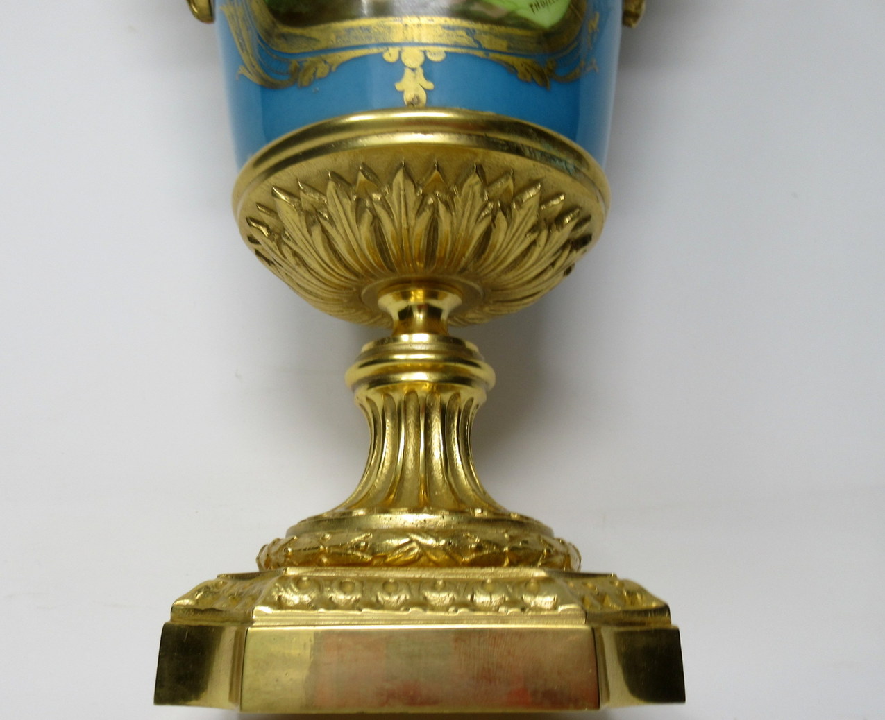 Stunning French Sevres Soft Paste Porcelain and Ormolu Twin Handle Table or Mantle Urn of traditional form and of outstanding quality, and good size proportions, raised on a square stepped base with canted corners.