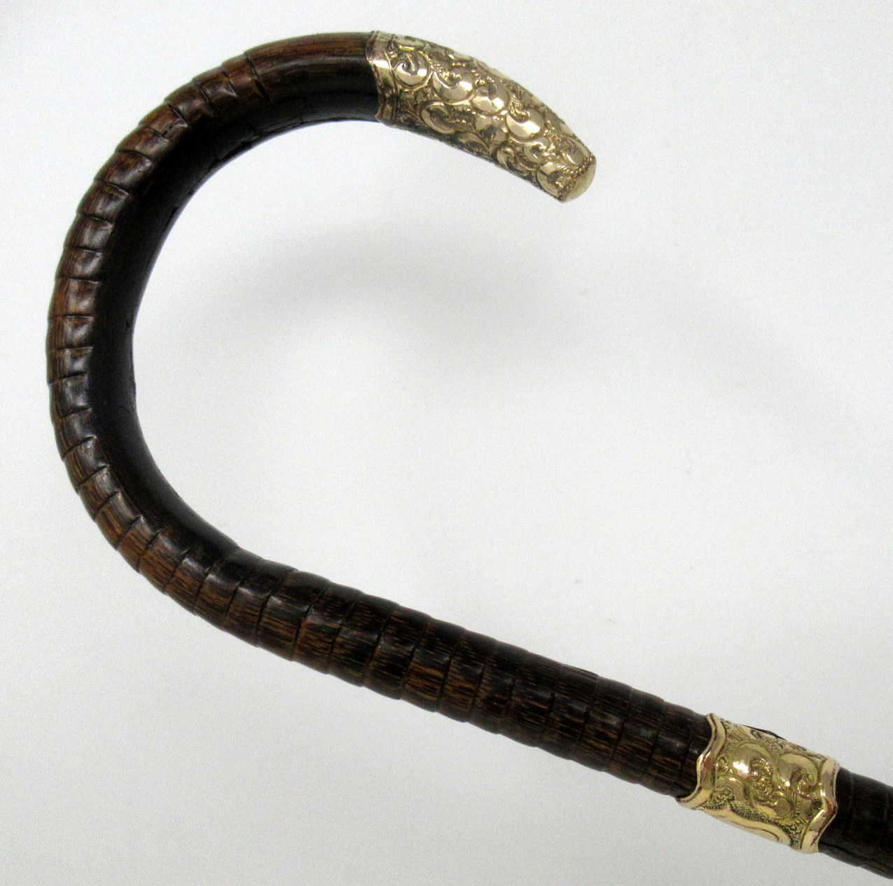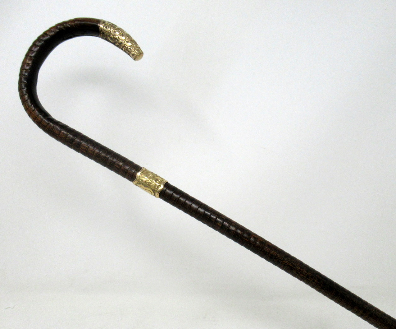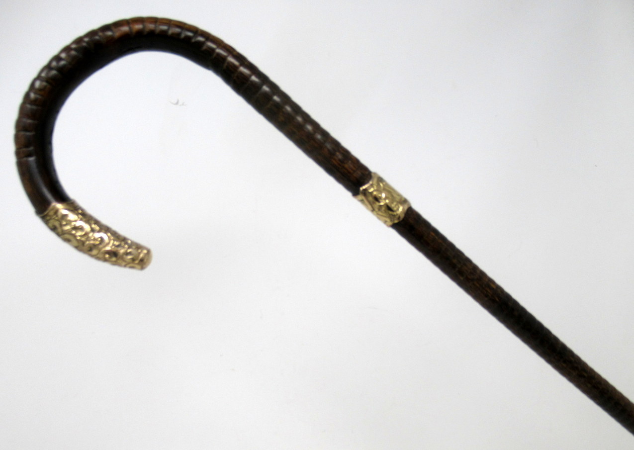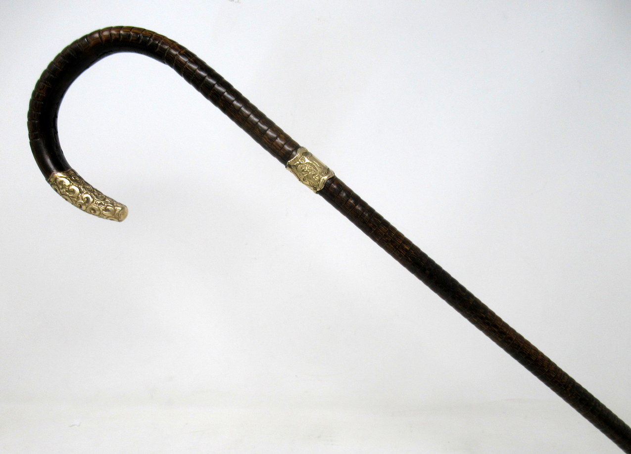 Fine Quality Polished Stepped Partridge Wood Traditional Crook Handled Lady’s or Gentleman’s Walking Cane with Highly Decorative embossed Eighteen Carat Gold Plated Mount and matching collar with a shield shaped cartouche, last quarter of the Nineteenth Century.