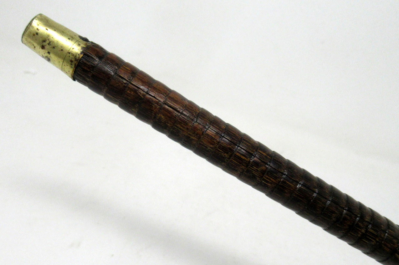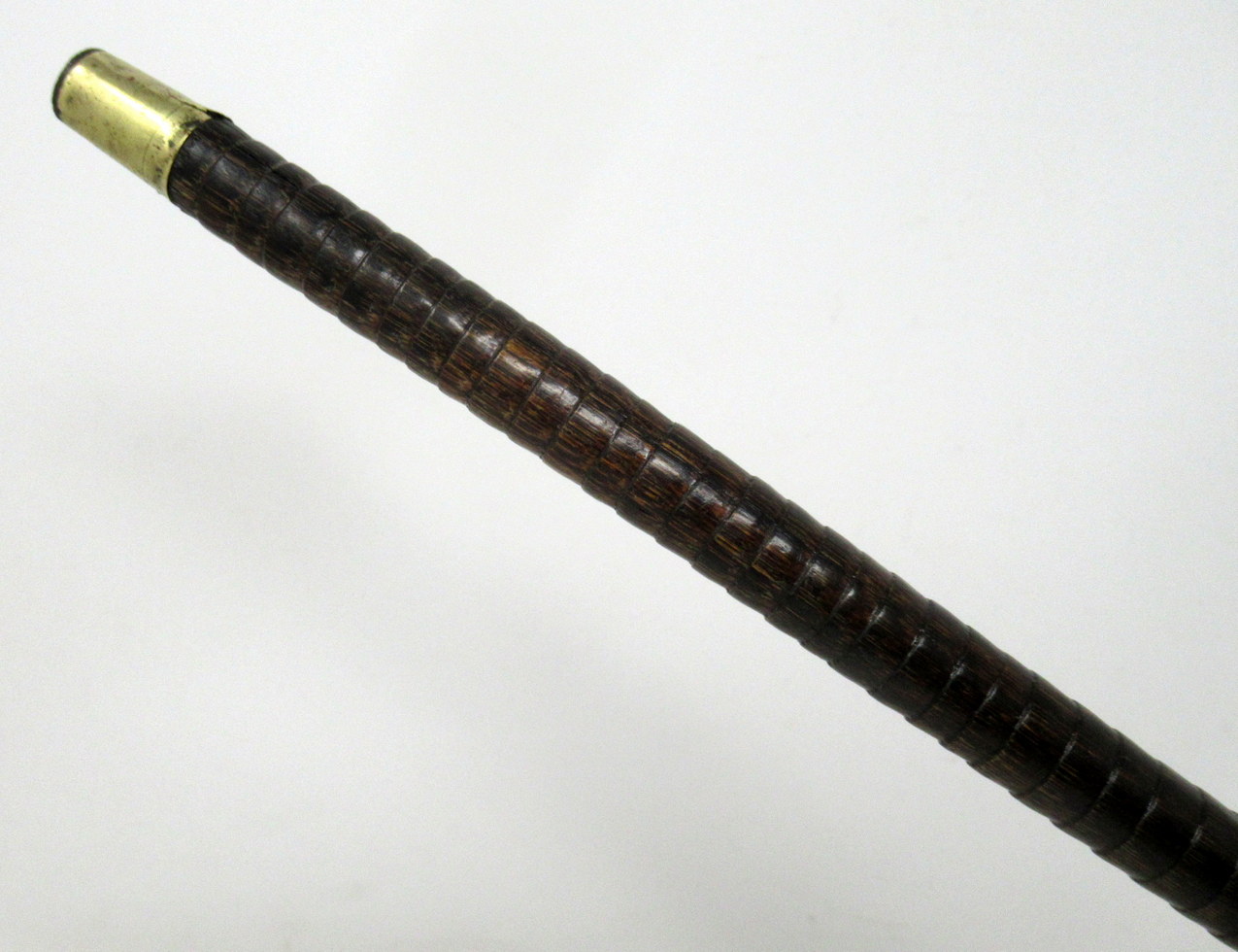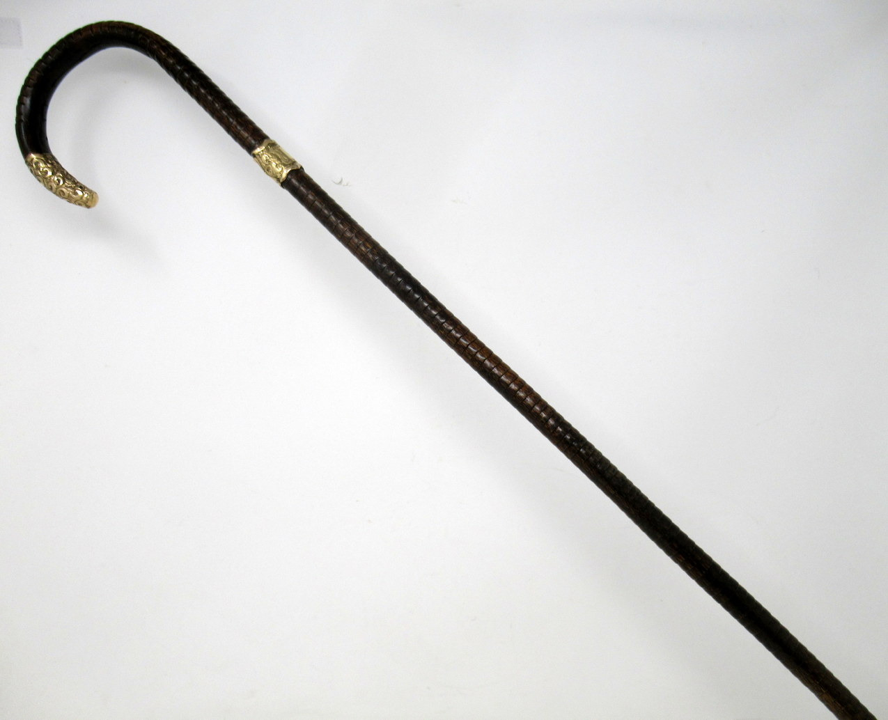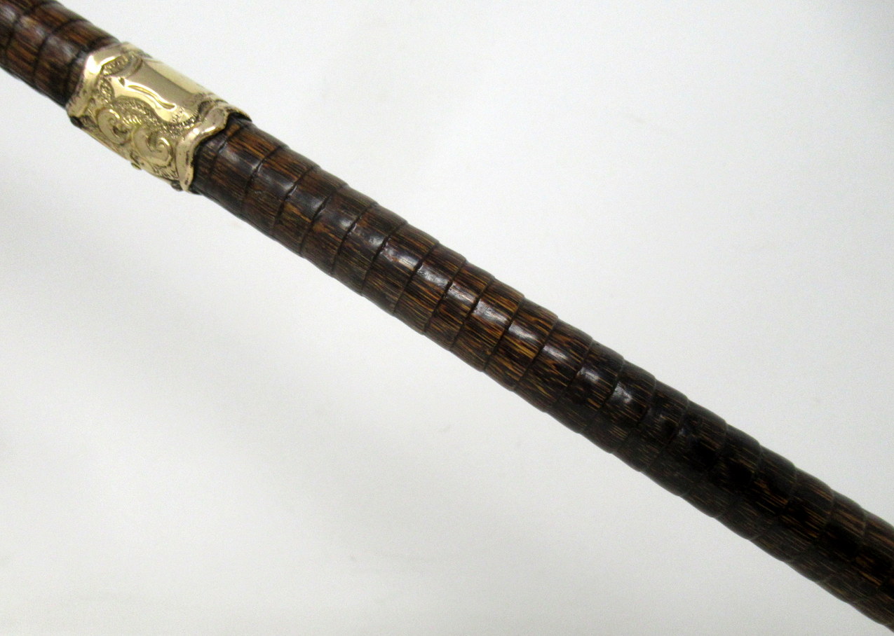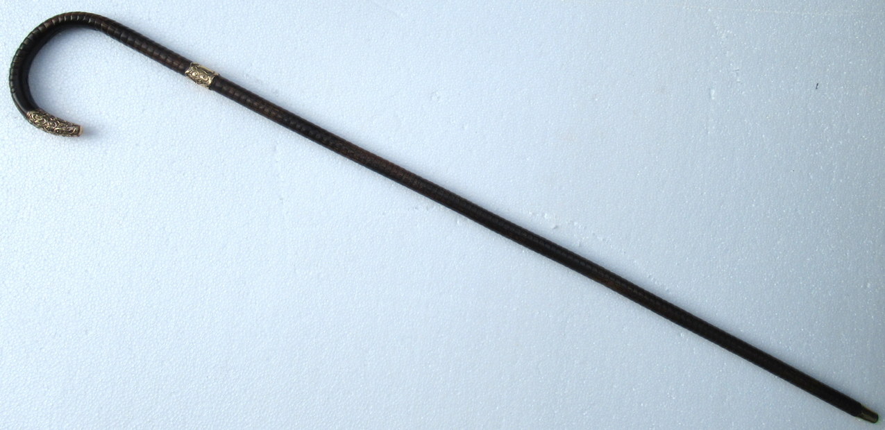 Fine Quality Polished Stepped Partridge Wood Traditional Crook Handled Lady’s or Gentleman’s Walking Cane with Highly Decorative embossed Eighteen Carat Gold Plated Mount and matching collar with a shield shaped cartouche, last quarter of the Nineteenth Century.