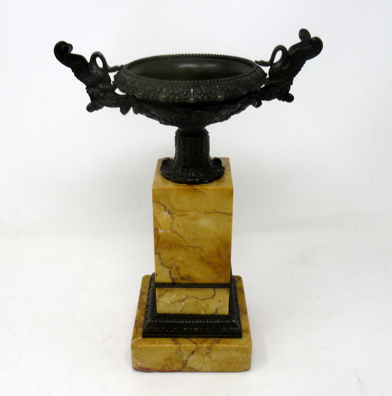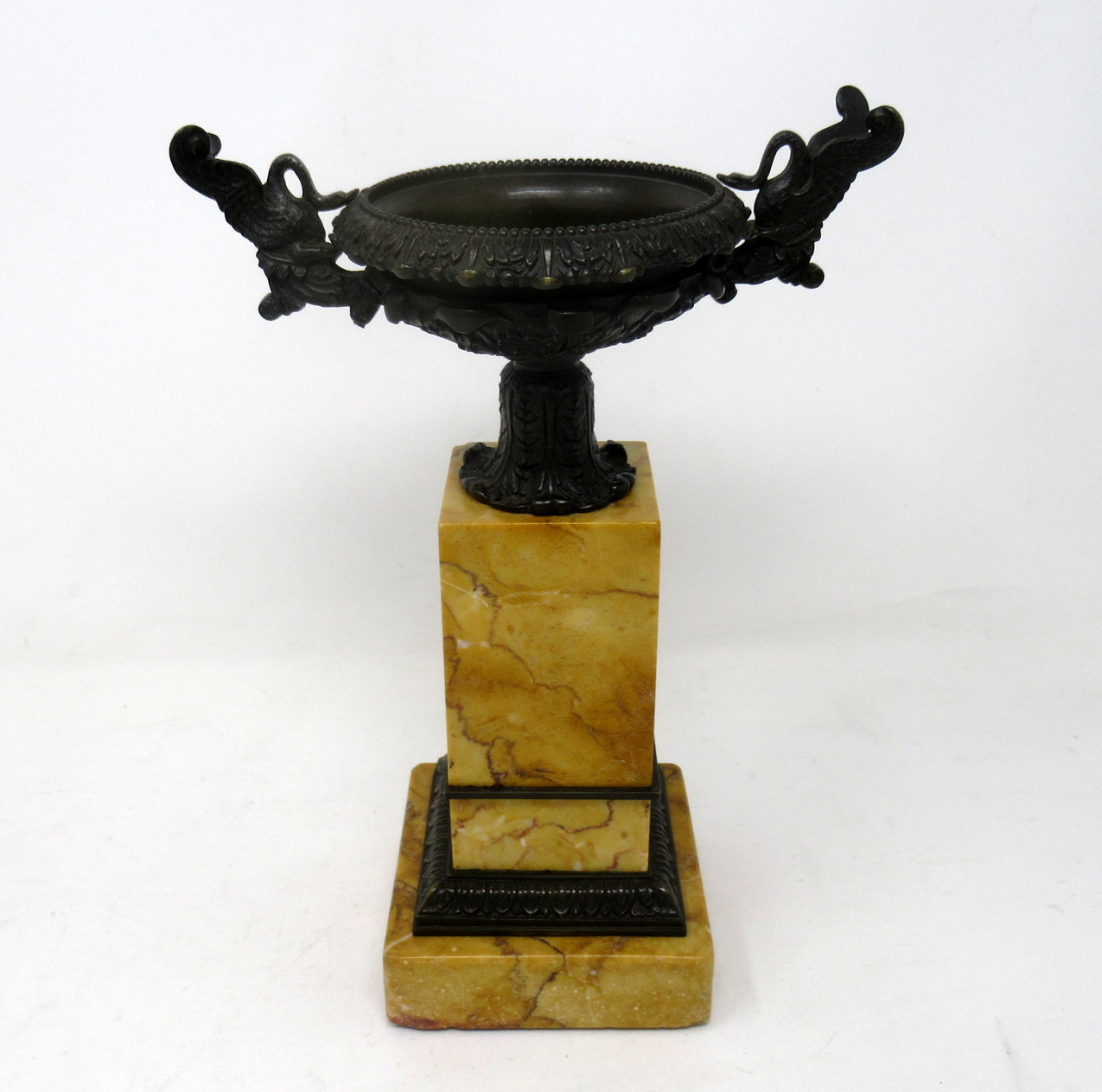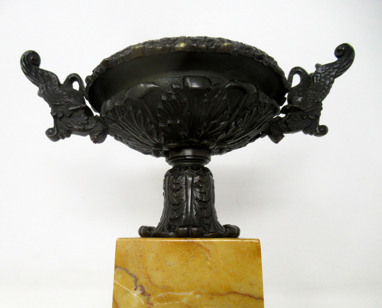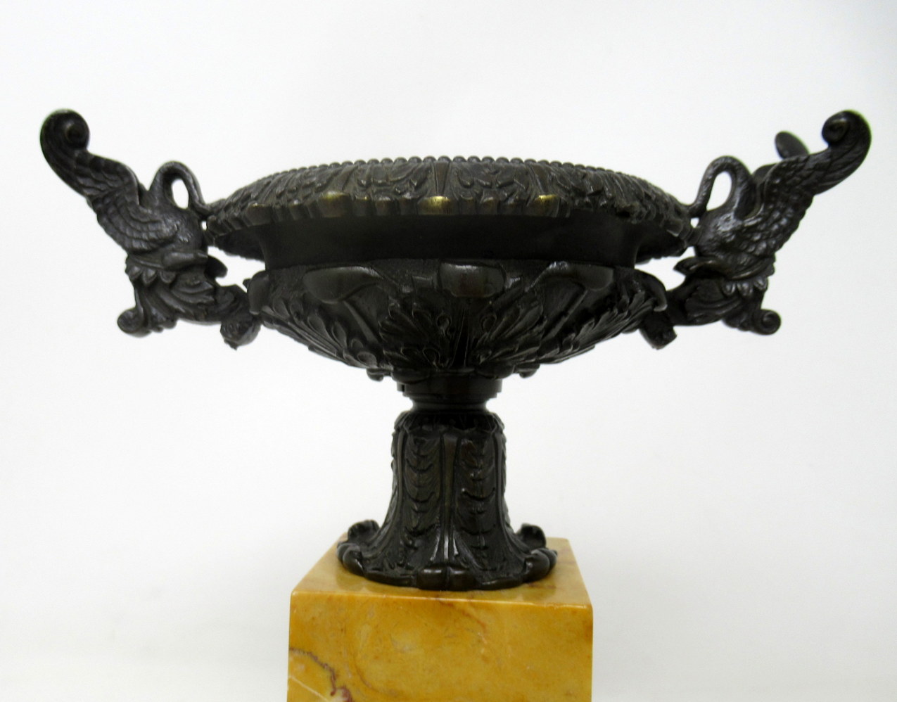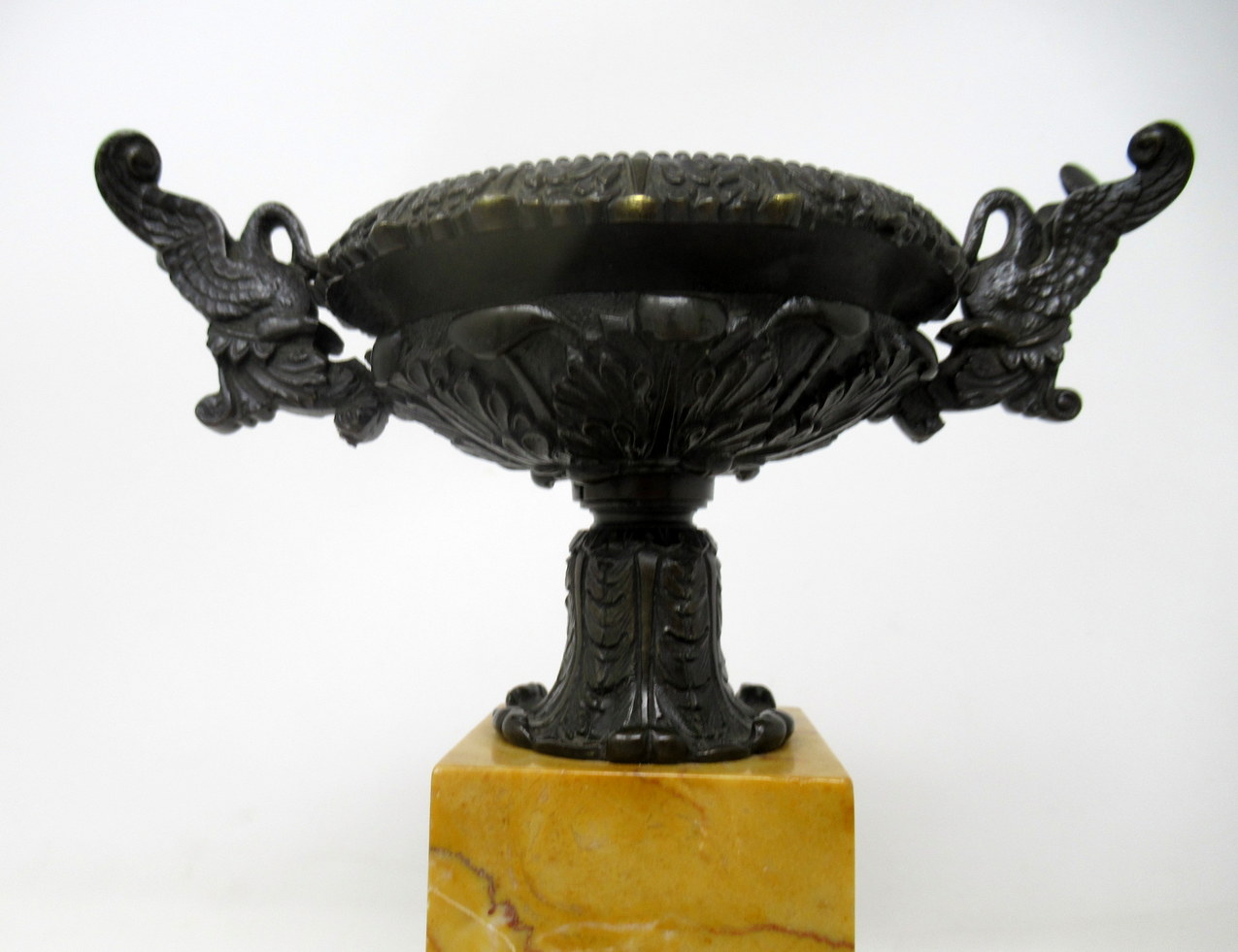 A Very Fine Pair of French Late Empire Patinated Bronze & Well Grained Sienna Marble Grand Tour Twin Handle Tazza of compact and heavy proportions. First quarter of the Nineteenth Century, possibly Regency period.