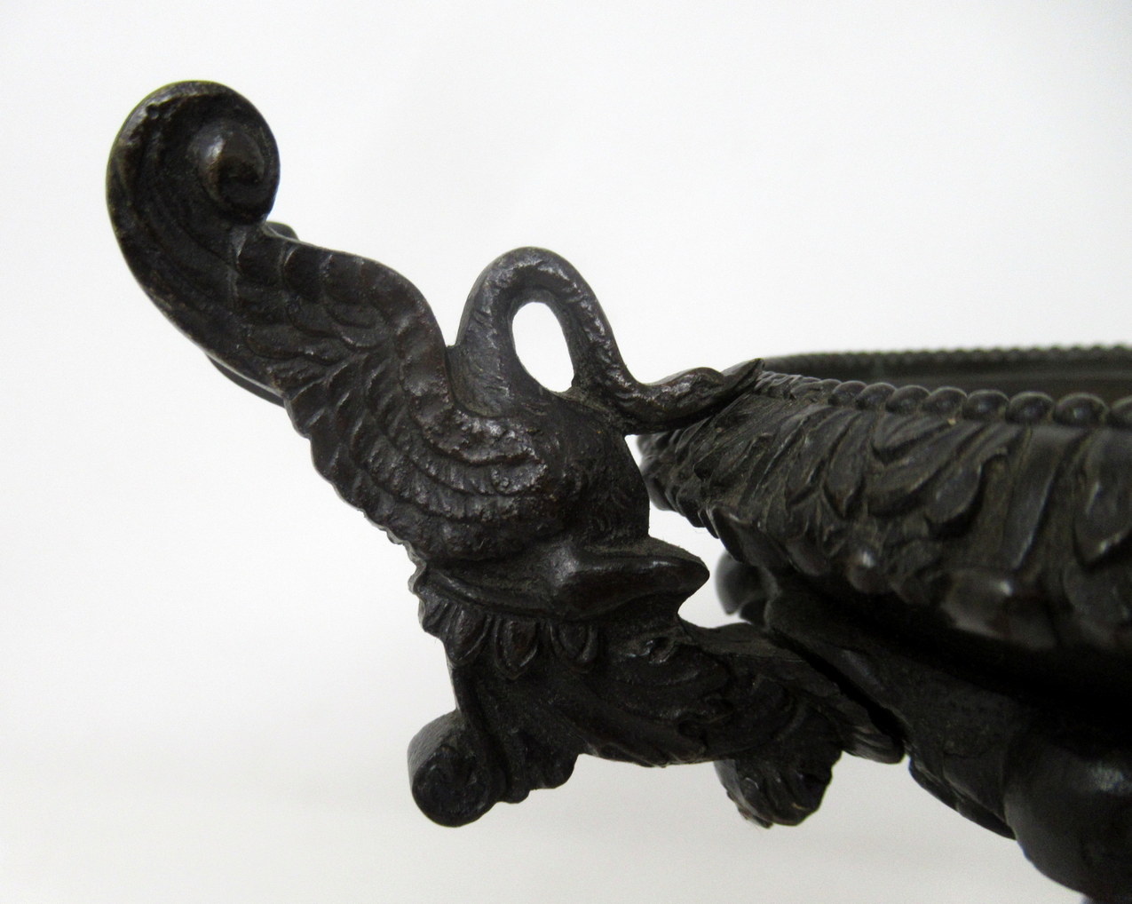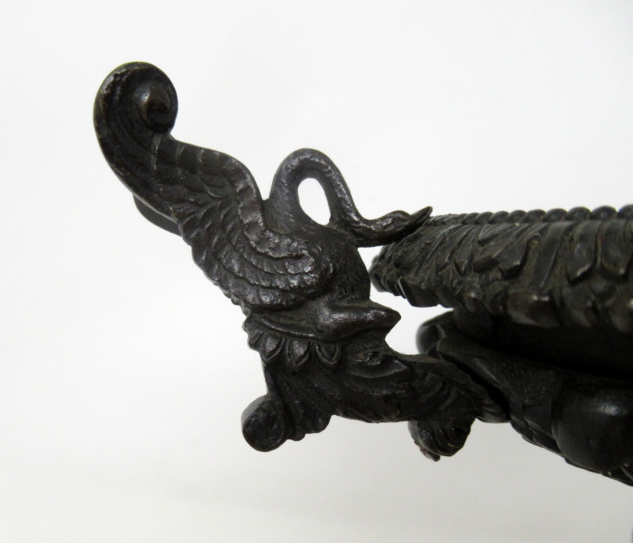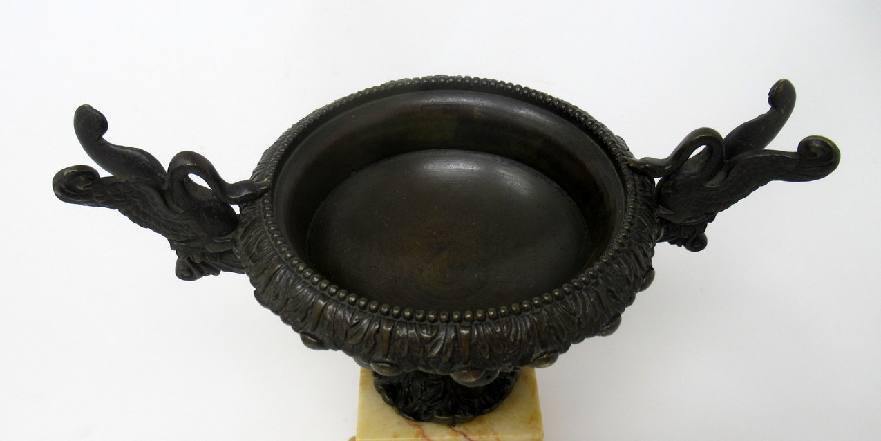 Each circular bowl with Acanthus Leaf cast body and decorative moulded beaded detail rims and twin bronze handles modelled as flying Swans perched on an ornate scrolling support, ending on a central socle base above a square two-piece marble central support with plinth base, with a band of acanthus leaf bronze mount.