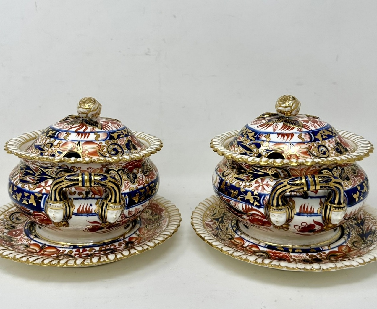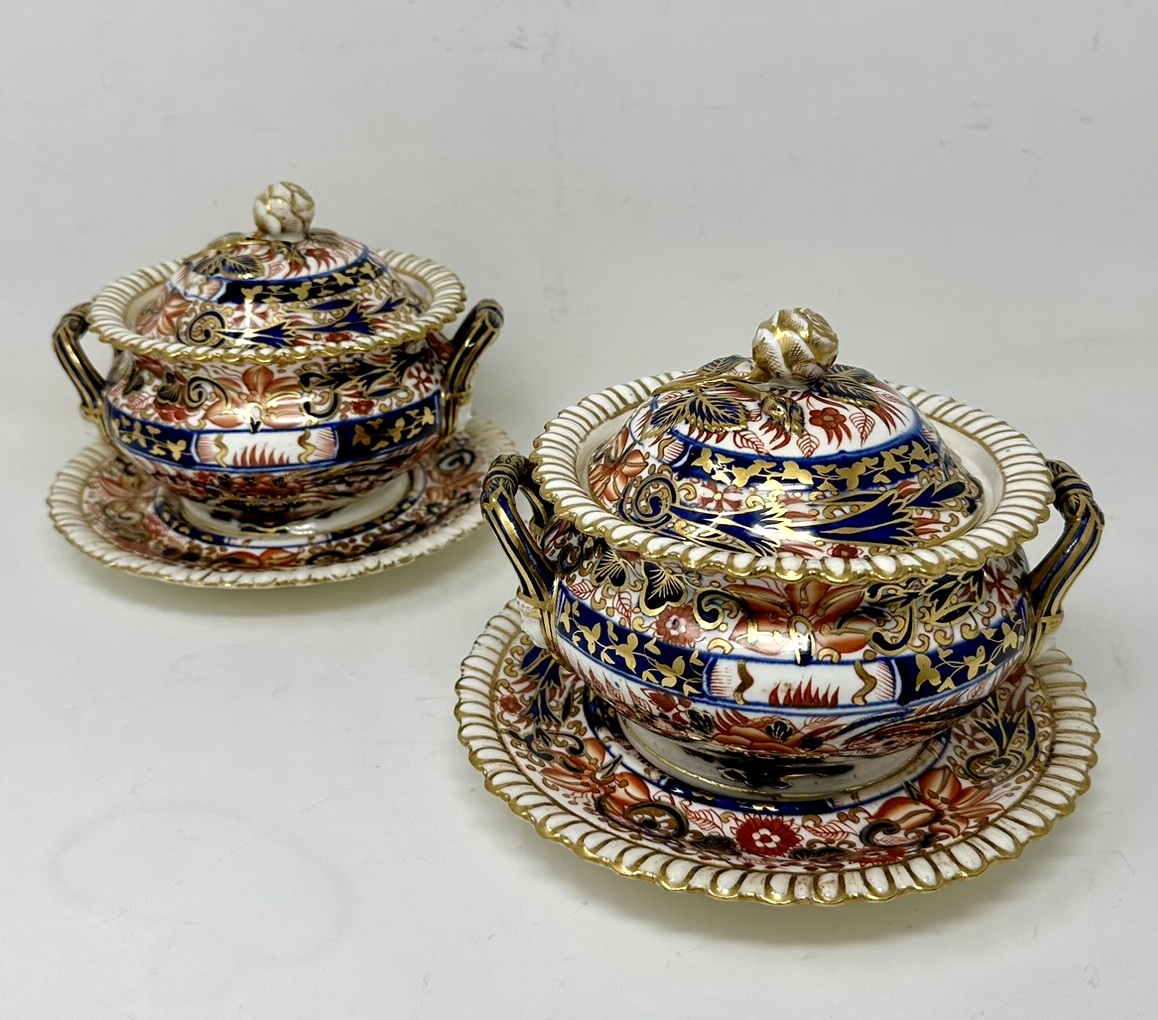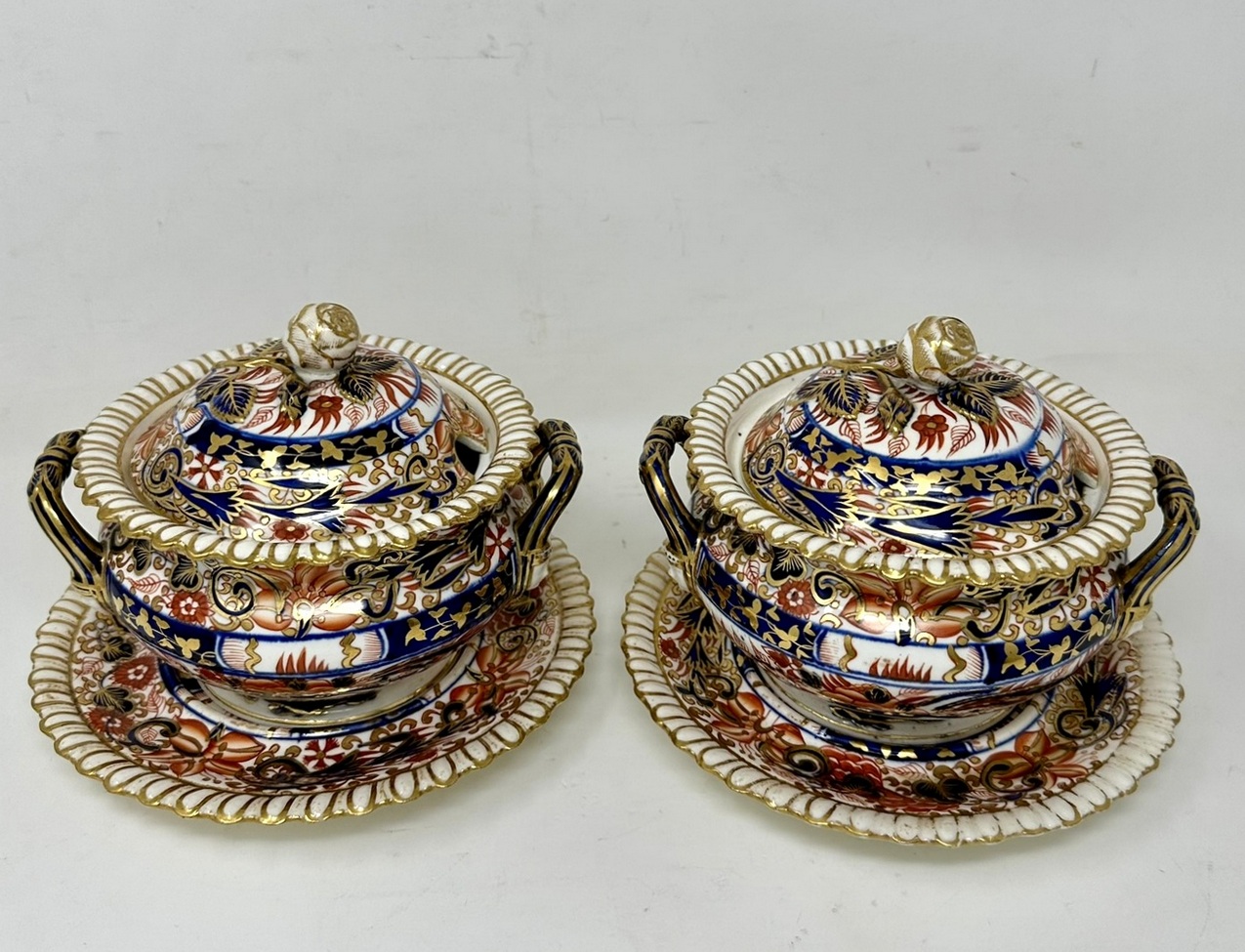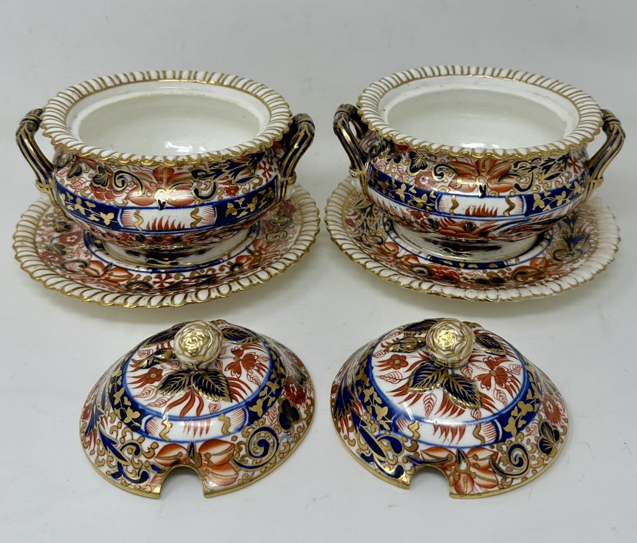 Lavishly hand decorated in Imari palette with colours of Iron Red and Cobalt Blue with gilt on an off-white ground, each rim with gadrooned decoration, each cover with a rose bud and leaves.