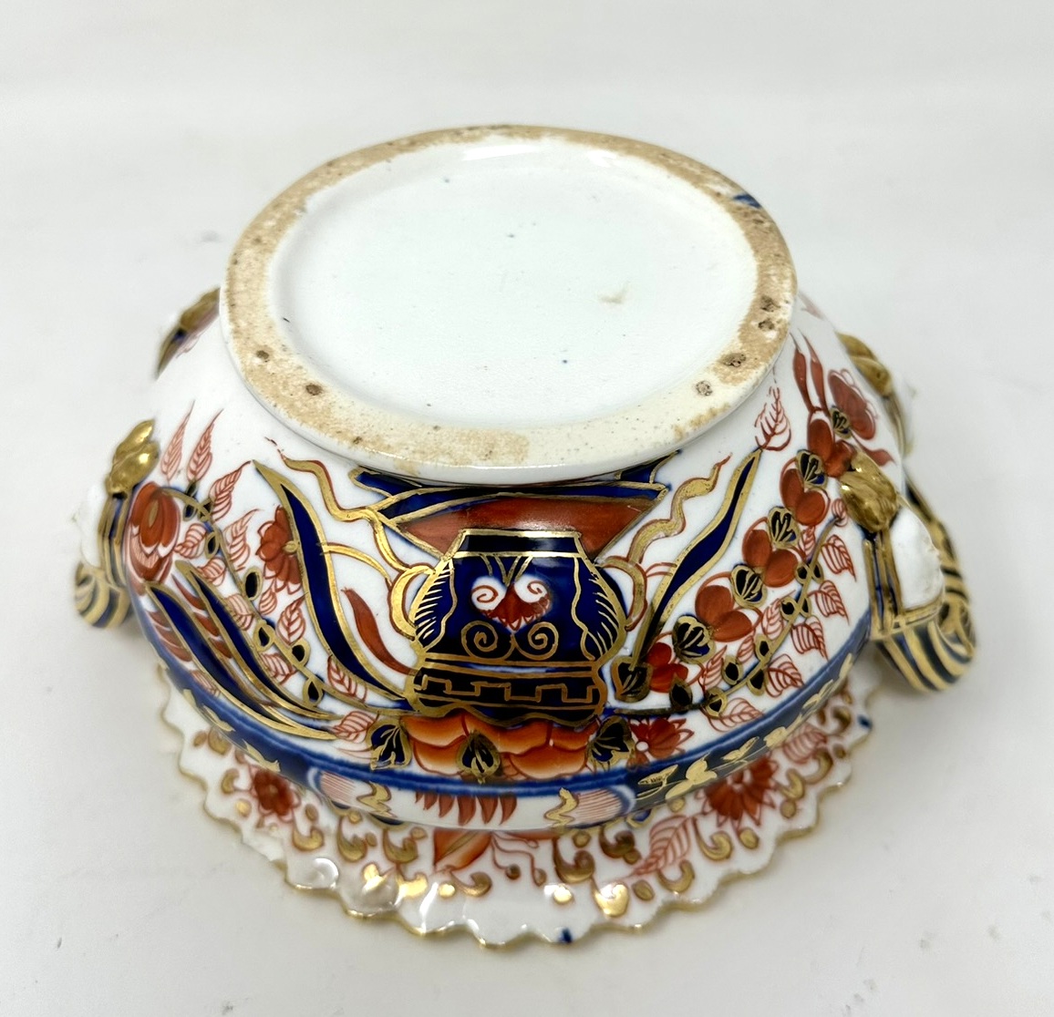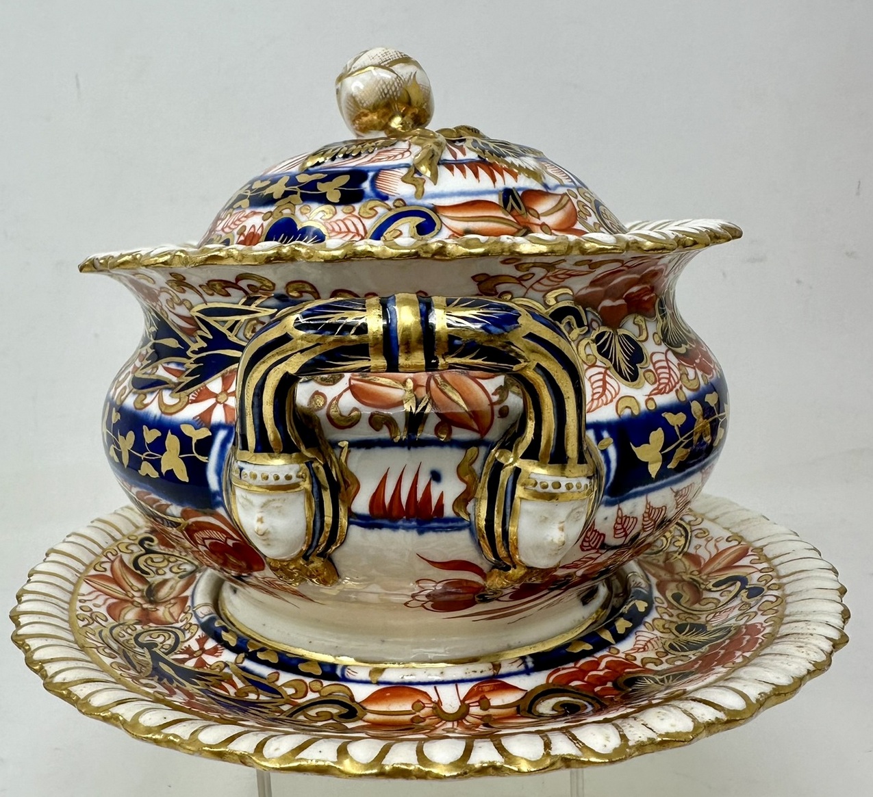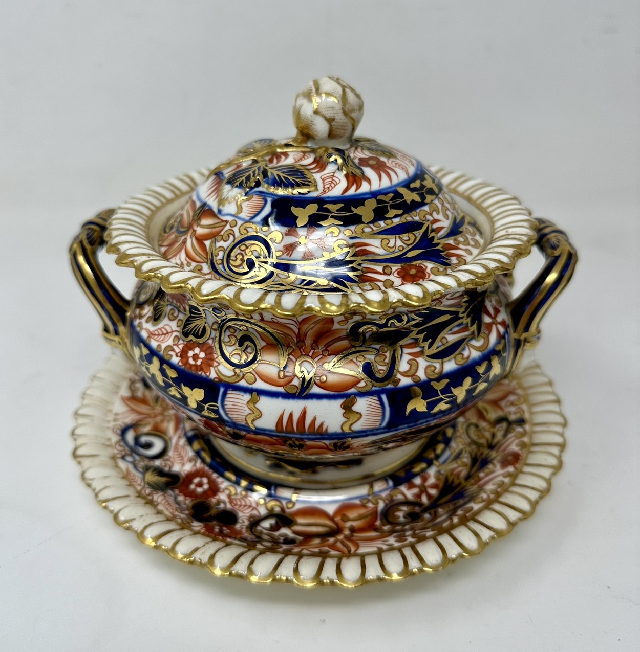 Lavishly hand decorated in Imari palette with colours of Iron Red and Cobalt Blue with gilt on an off-white ground, each rim with gadrooned decoration, each cover with a rose bud and leaves.