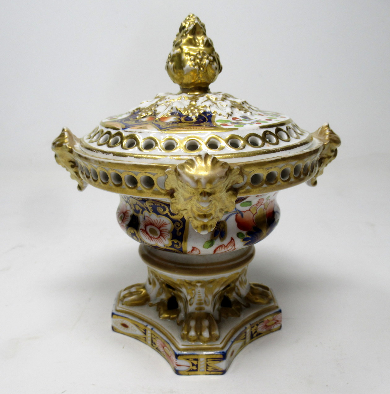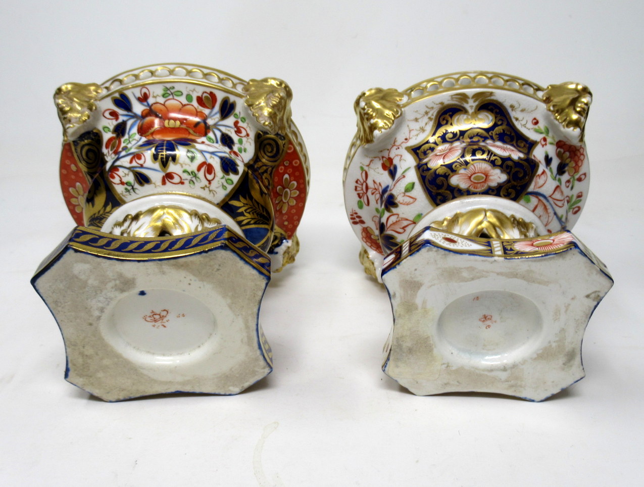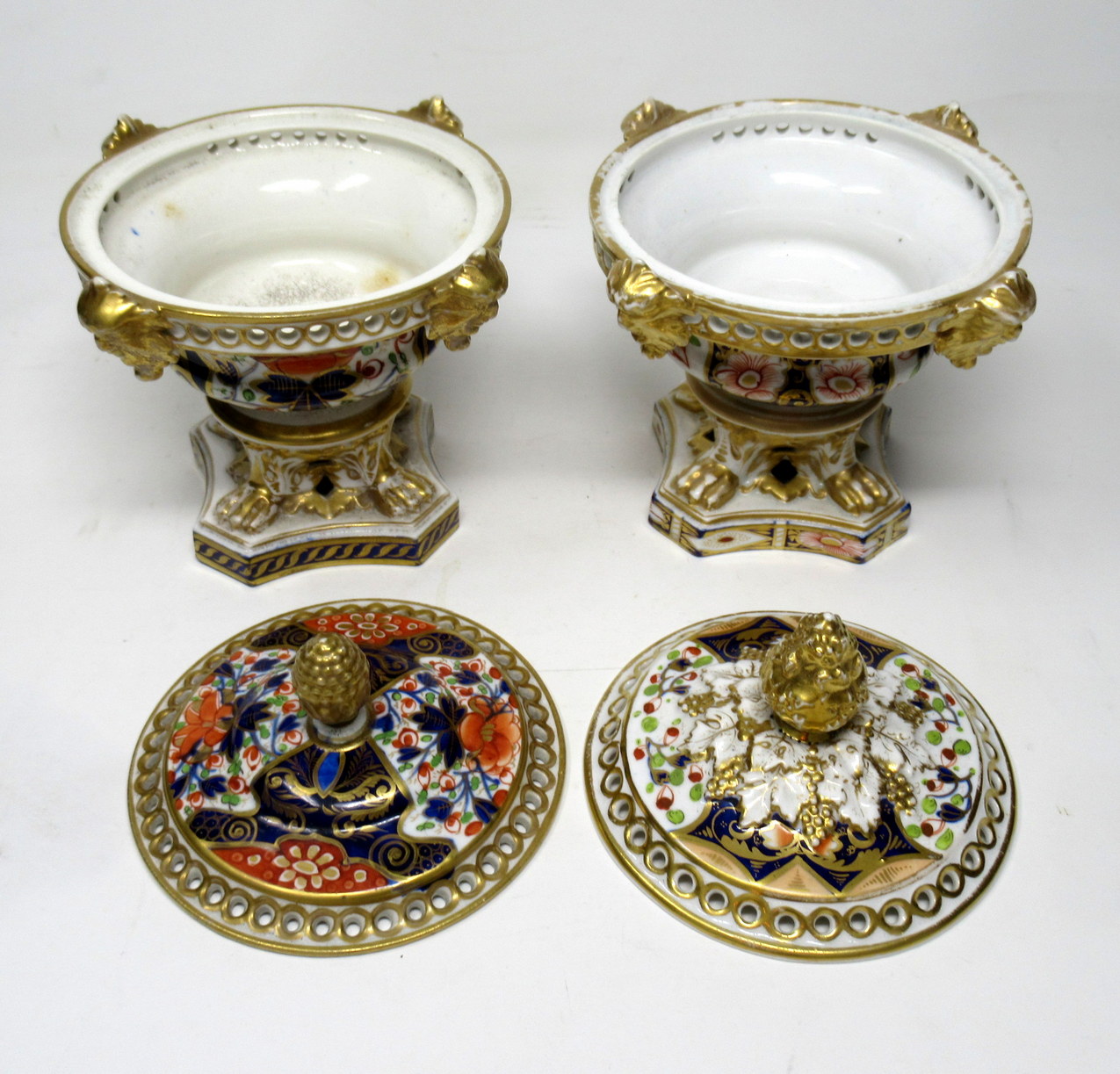 Lavishly hand decorated in Imari palette with colours of Iron Red and Cobalt Blue with gilt on an off white ground, each rim with four projecting Lion’s heads ending on four paw feet on a shaped base.