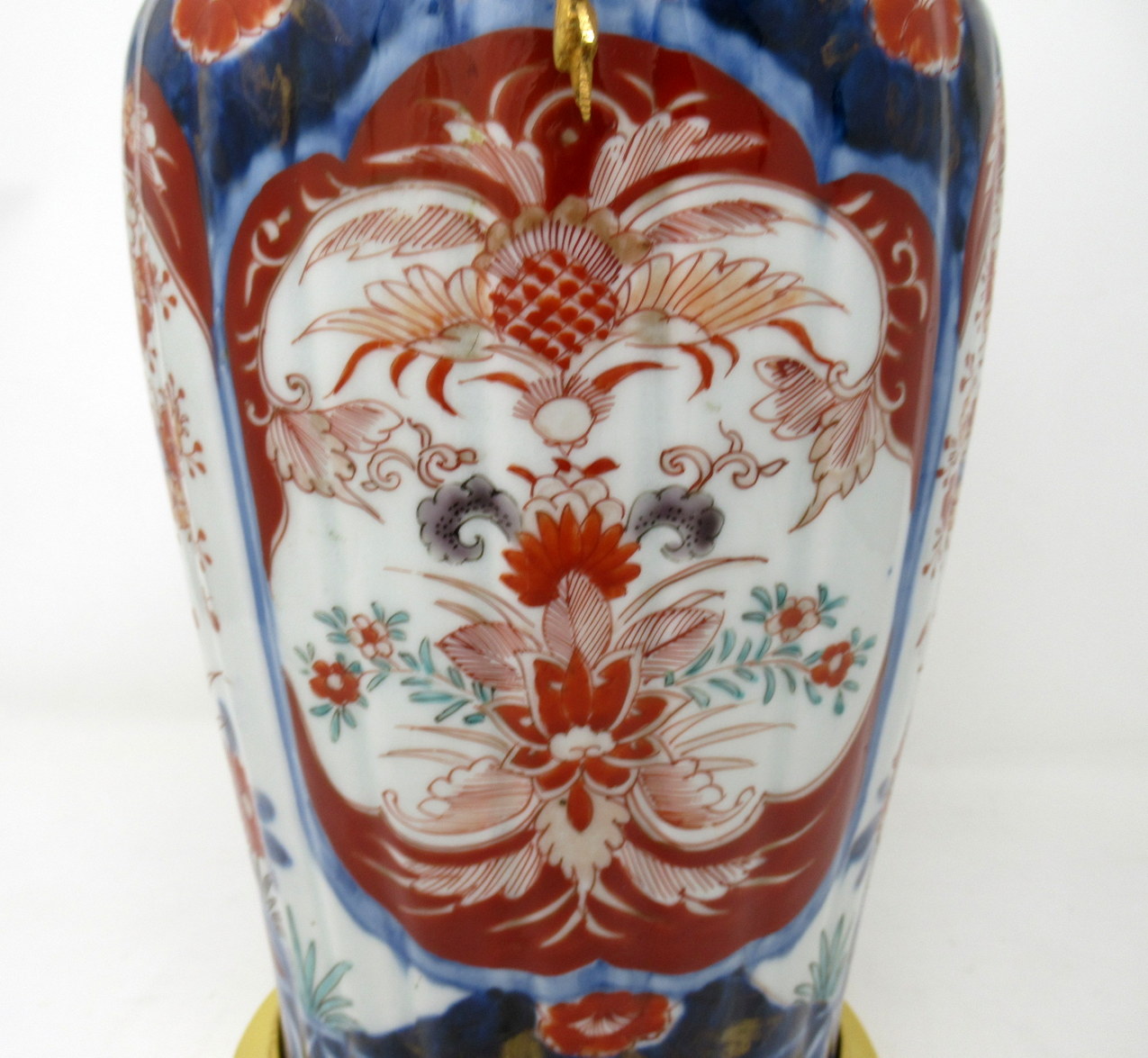 Stunning Single Traditional Imari Ribbed Porcelain Vase of generous proportions, now converted to an electric Table Lamp with stylish decorative ormolu pierced gallery and twin handle mount and plain circular ormolu base. Mid to late Nineteenth Century.