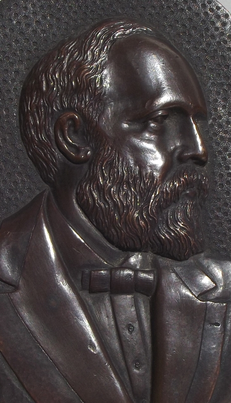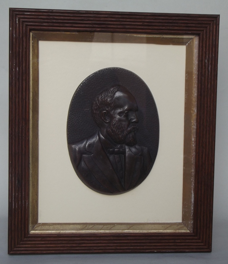 Superb Bronze Oval Portrait Plaque of James Abram Garfield modelled in relief in formal dress, later framed and glazed in a carved reeded walnut frame of similar period.