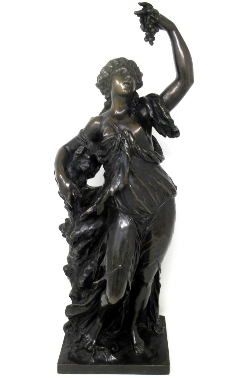 An exceptionally well cast example of a Classical French patinated Bronze Figure of a young woman holding a bunch of grapes depicting “Allegory of the Vine” after Claude Michel Clodion (1738-1814) in nice dark patination. Mid Nineteenth Century.