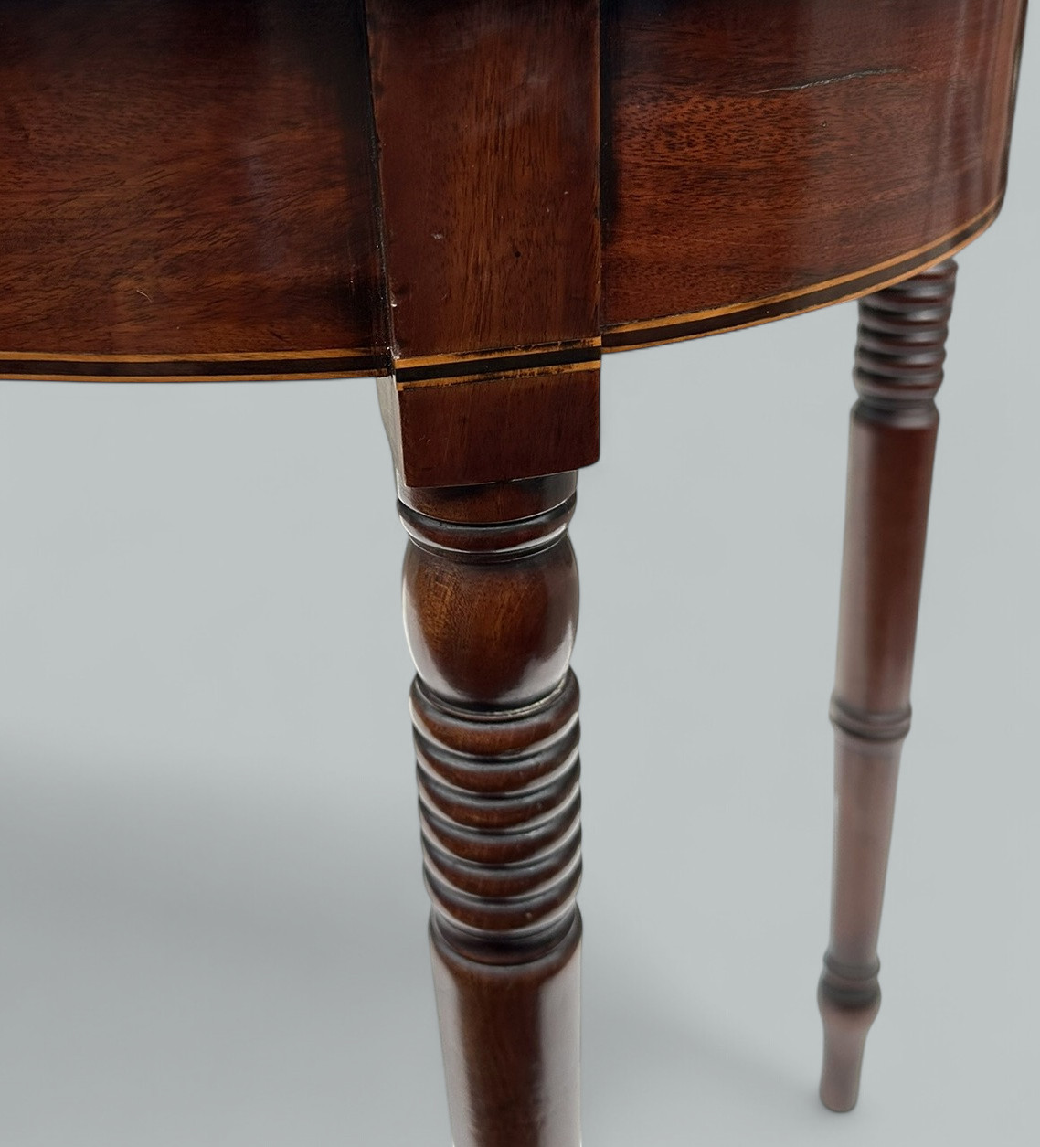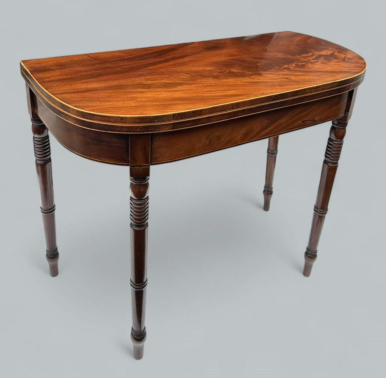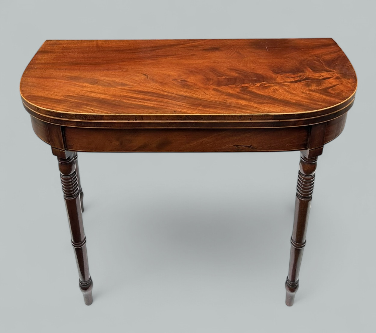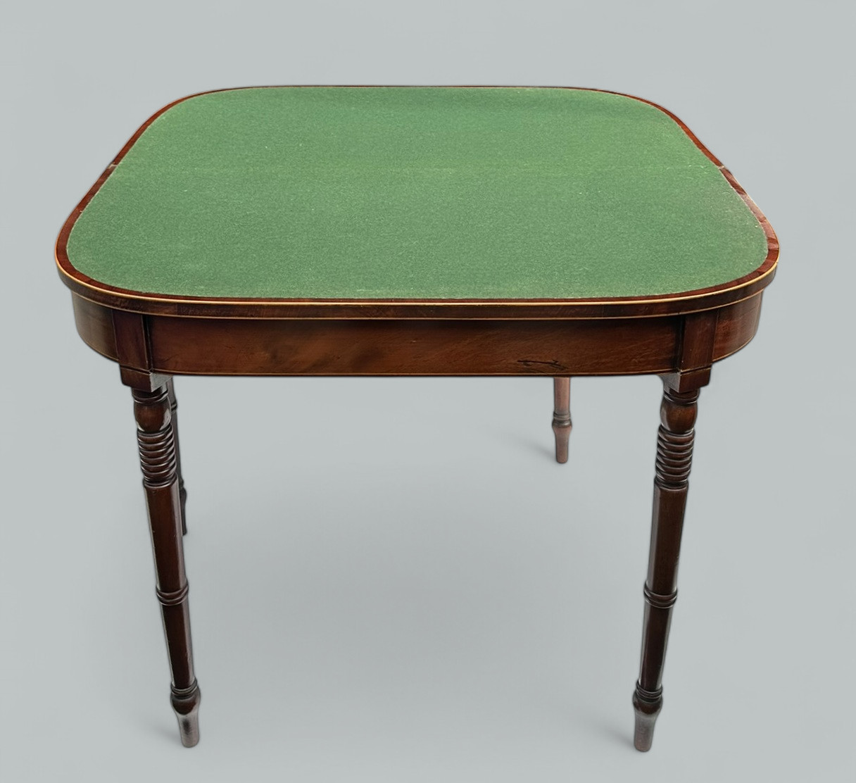 The crossbanded fold-over top of rectangular form with rounded front corners, raised on ring turned legs, the interior with green baise.
