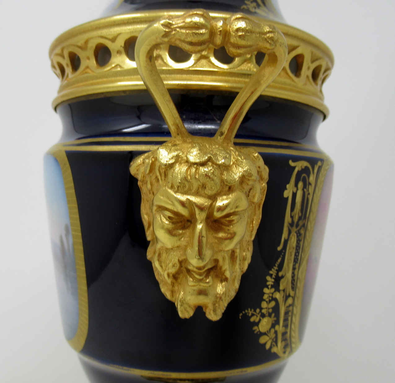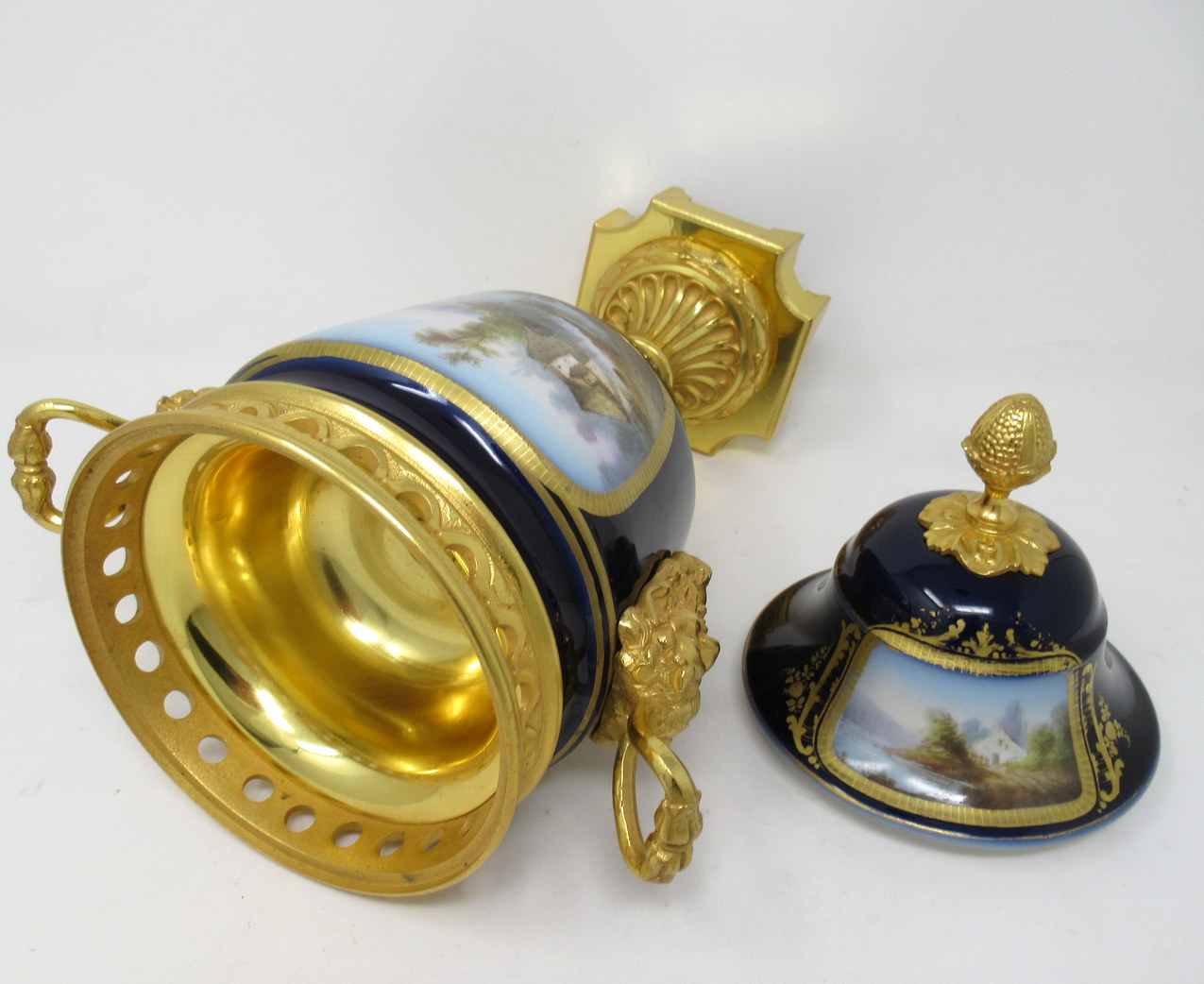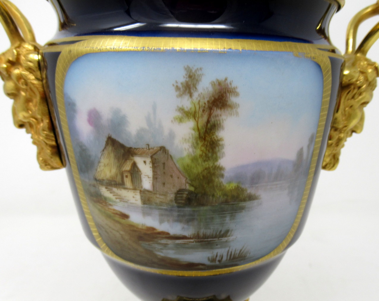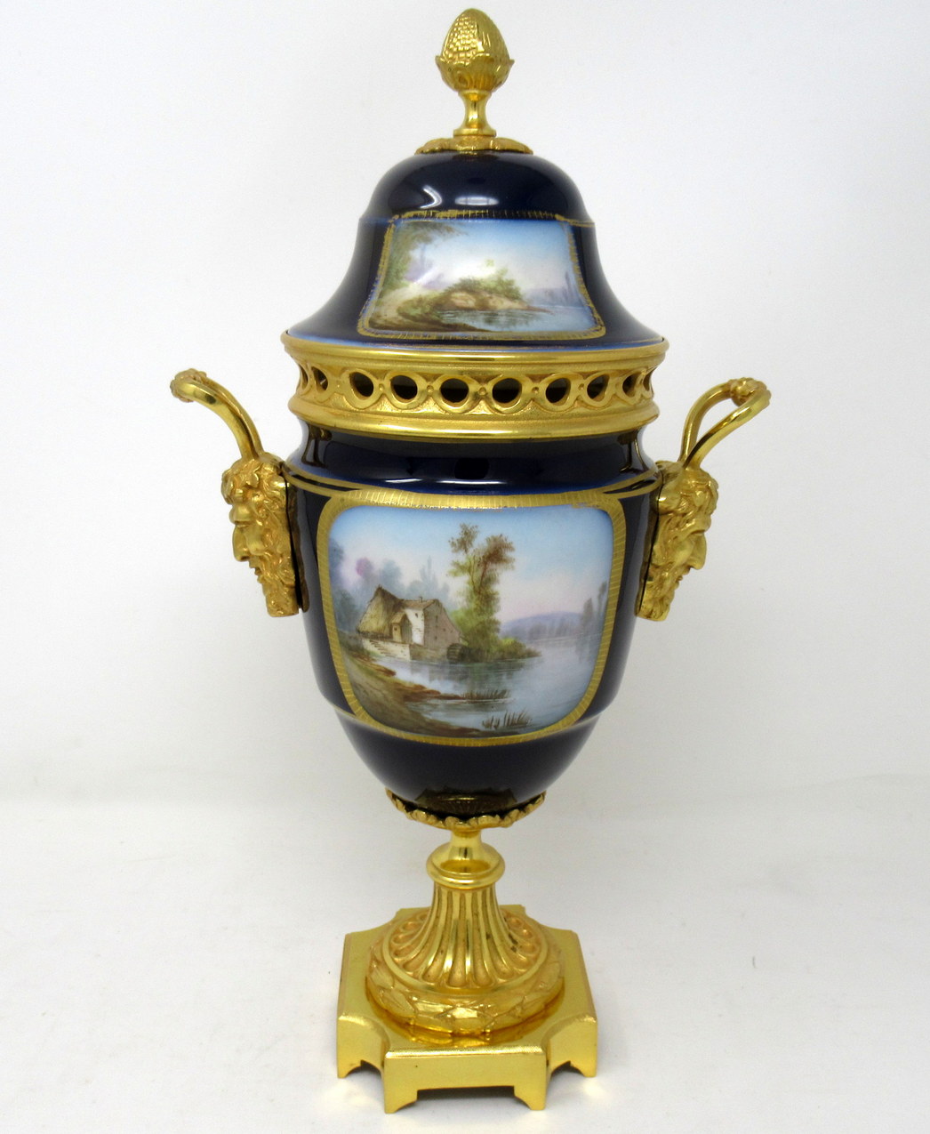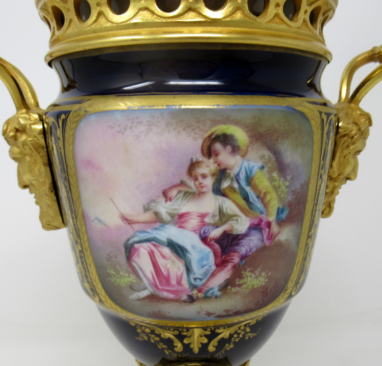 The twin handles exquisitely modelled as Satyrs. The central front reserve depicting a Courting Couple in Eighteenth Century dress in landscape, back view with a French Farmhouse beside a Lake on a rich cobalt blue ground. The firm fitting cover with Acanthus and Acorn finial and similar hand paintings.