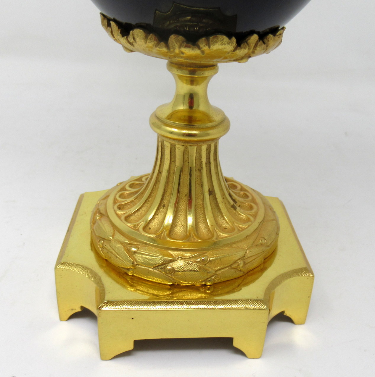 Stunning French Sevres Soft Paste Porcelain and Ormolu Twin Handle Table or Mantle Urn of traditional form and of outstanding quality, and good size proportions, raised on a square stepped base with canted corners.