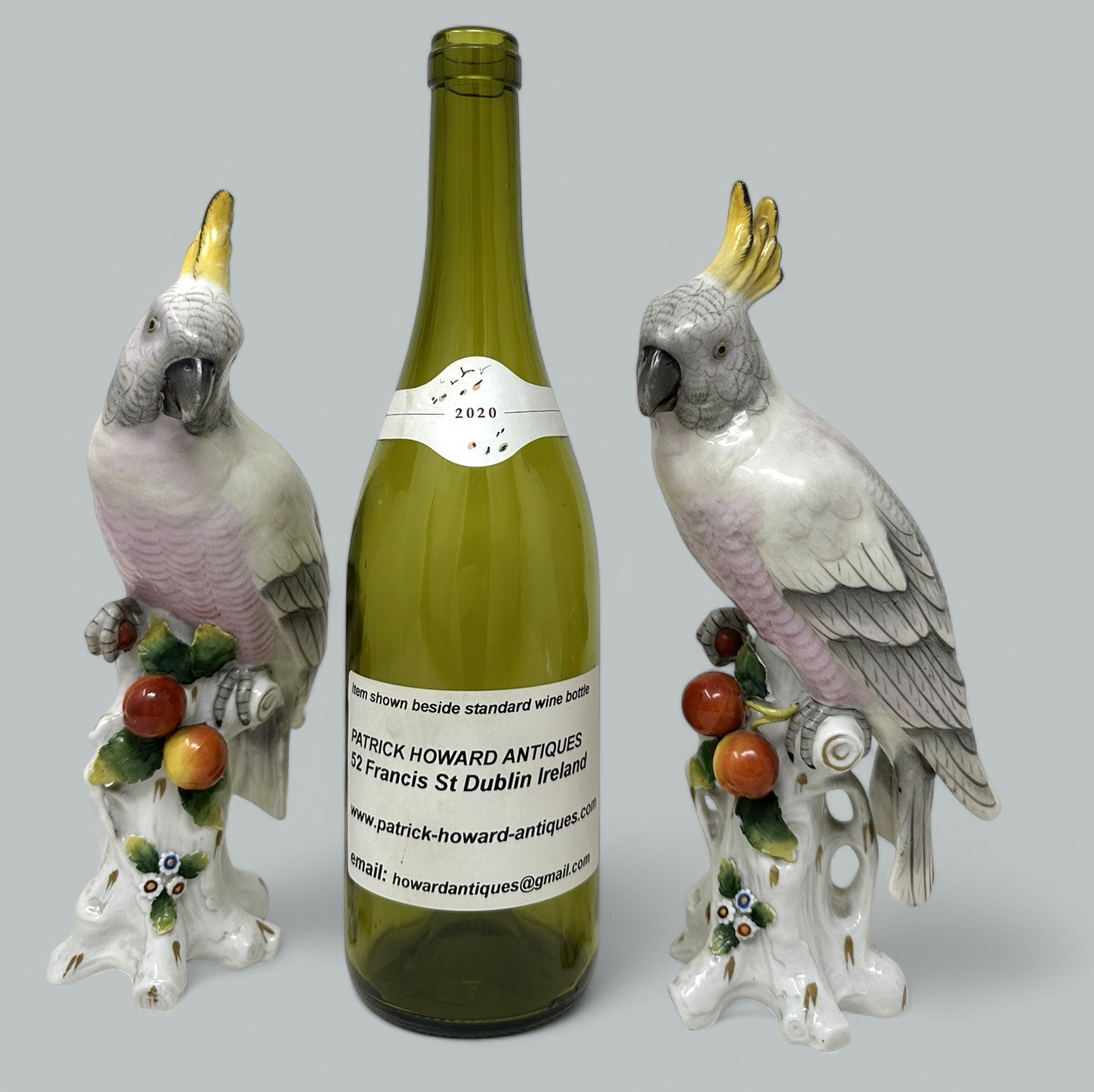 955. Pair Sitzendorf German Porcelain Birds Parakeets Cockrels Cockatoos Parrots 19Ct