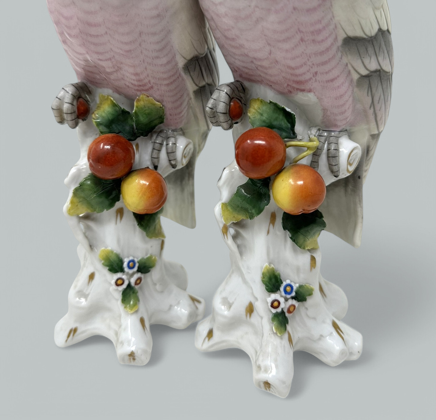 Modelled in opposing positions, firmly perched on decorative tree stumps with fruit, flowers and foliage and gilt highlights. Each with exquisite colourful glaze in colours of light greens and pale pink.