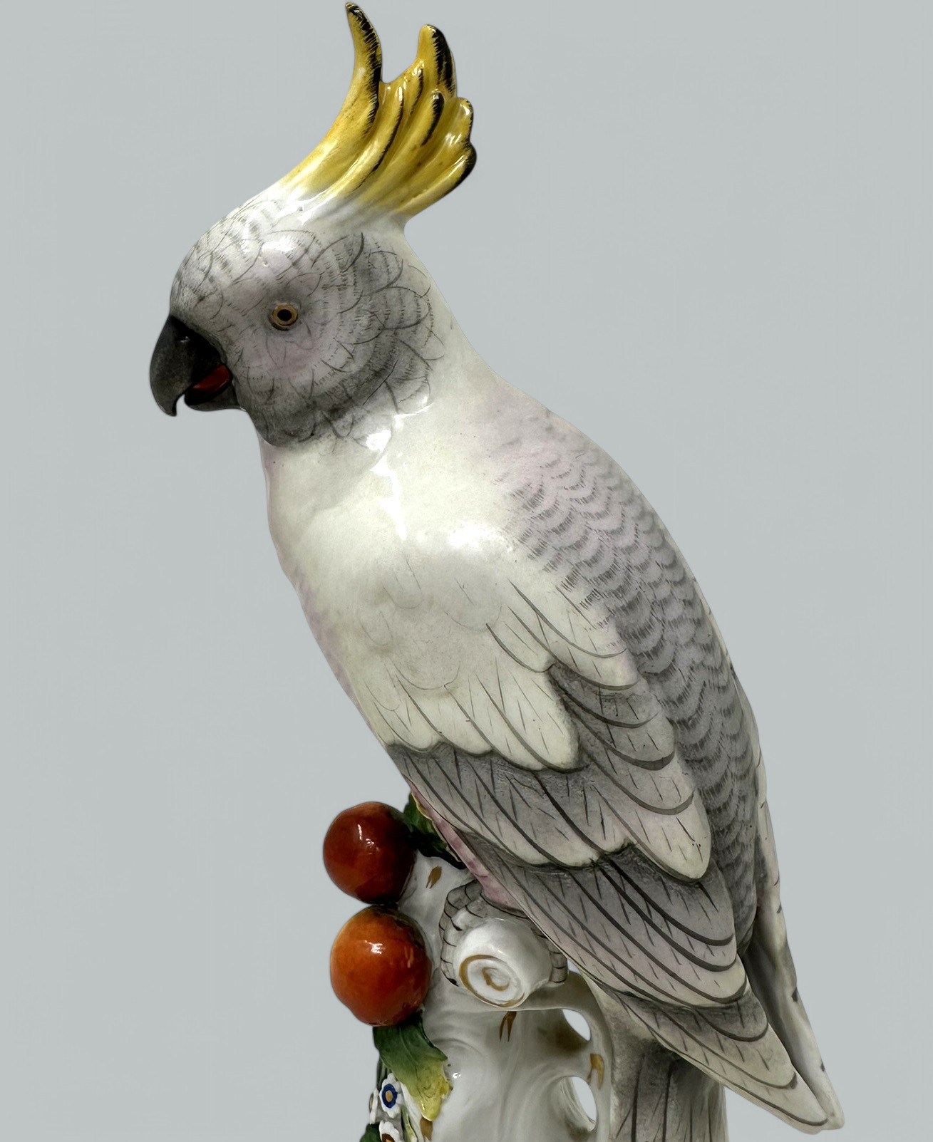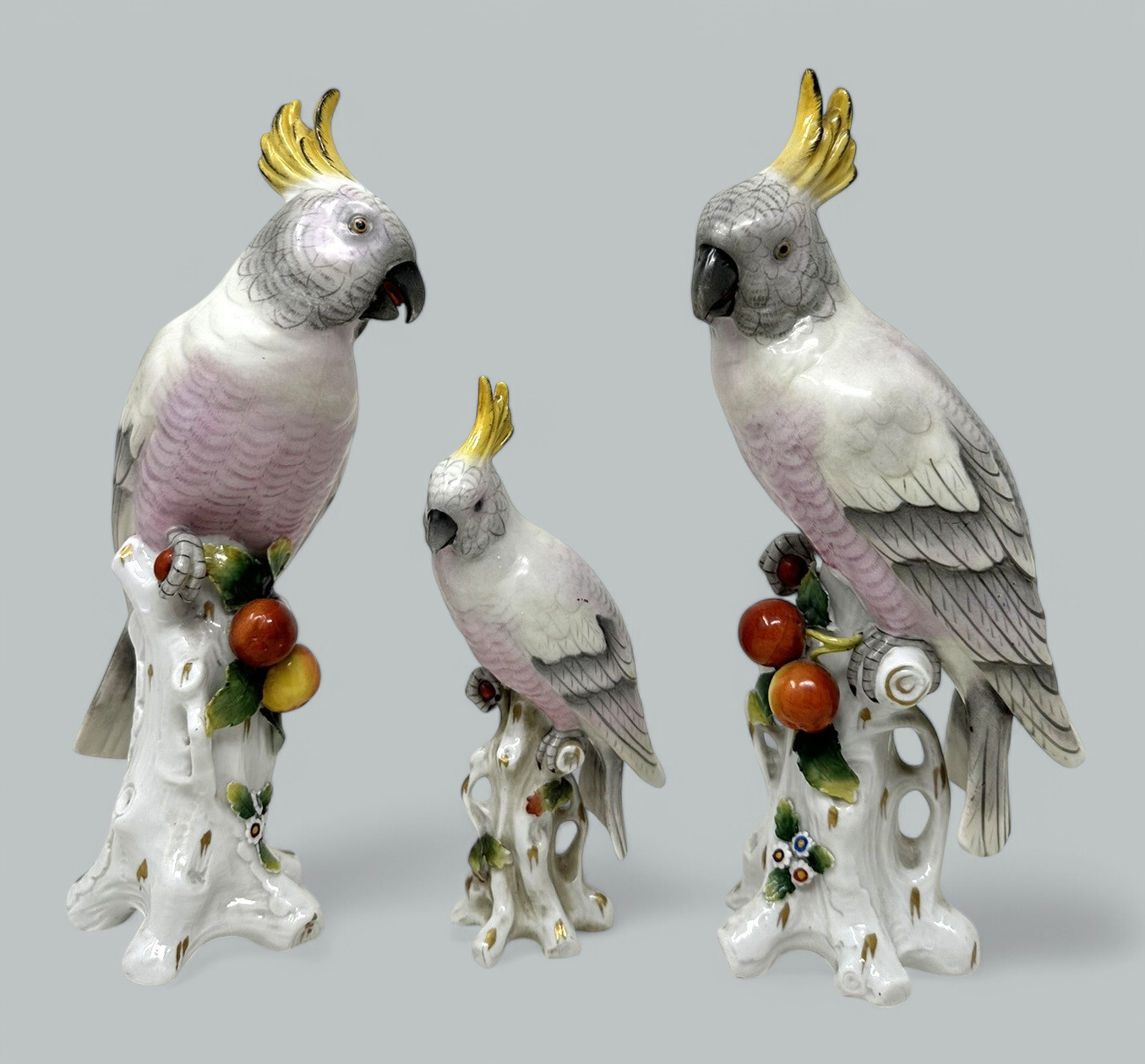 An exceptionally fine quality highly detailed pair of German Sitzendorf pottery porcelain Parrots Feathered Figures of quite generous size, together with another single example, late Nineteenth, early Twentieth Century.