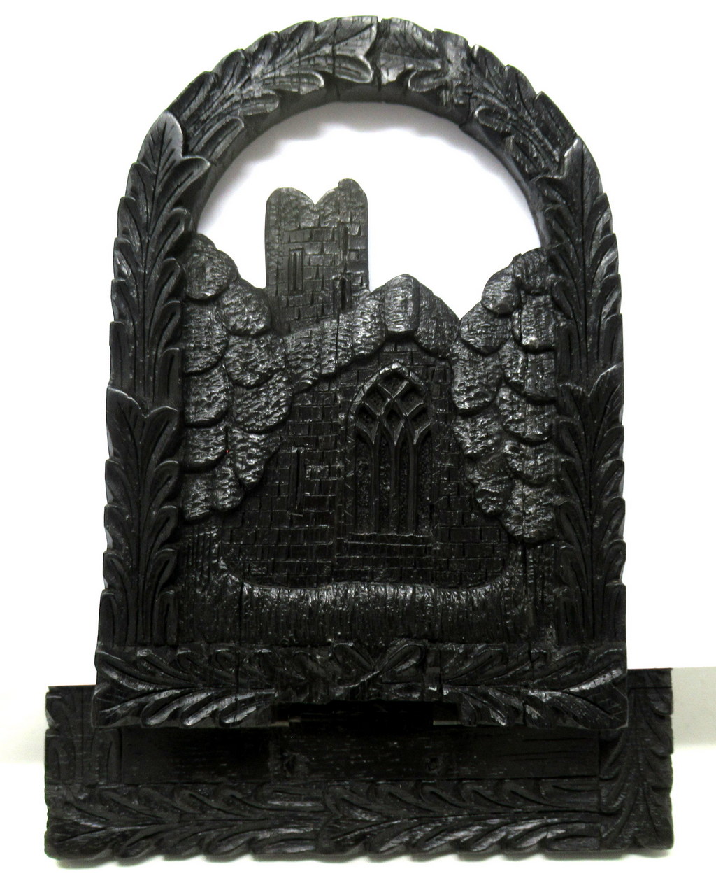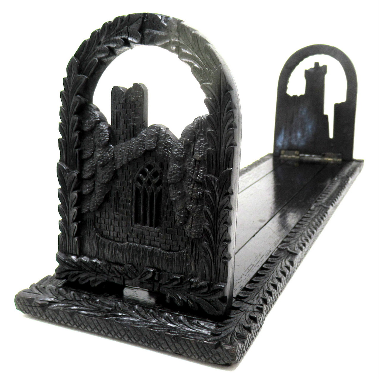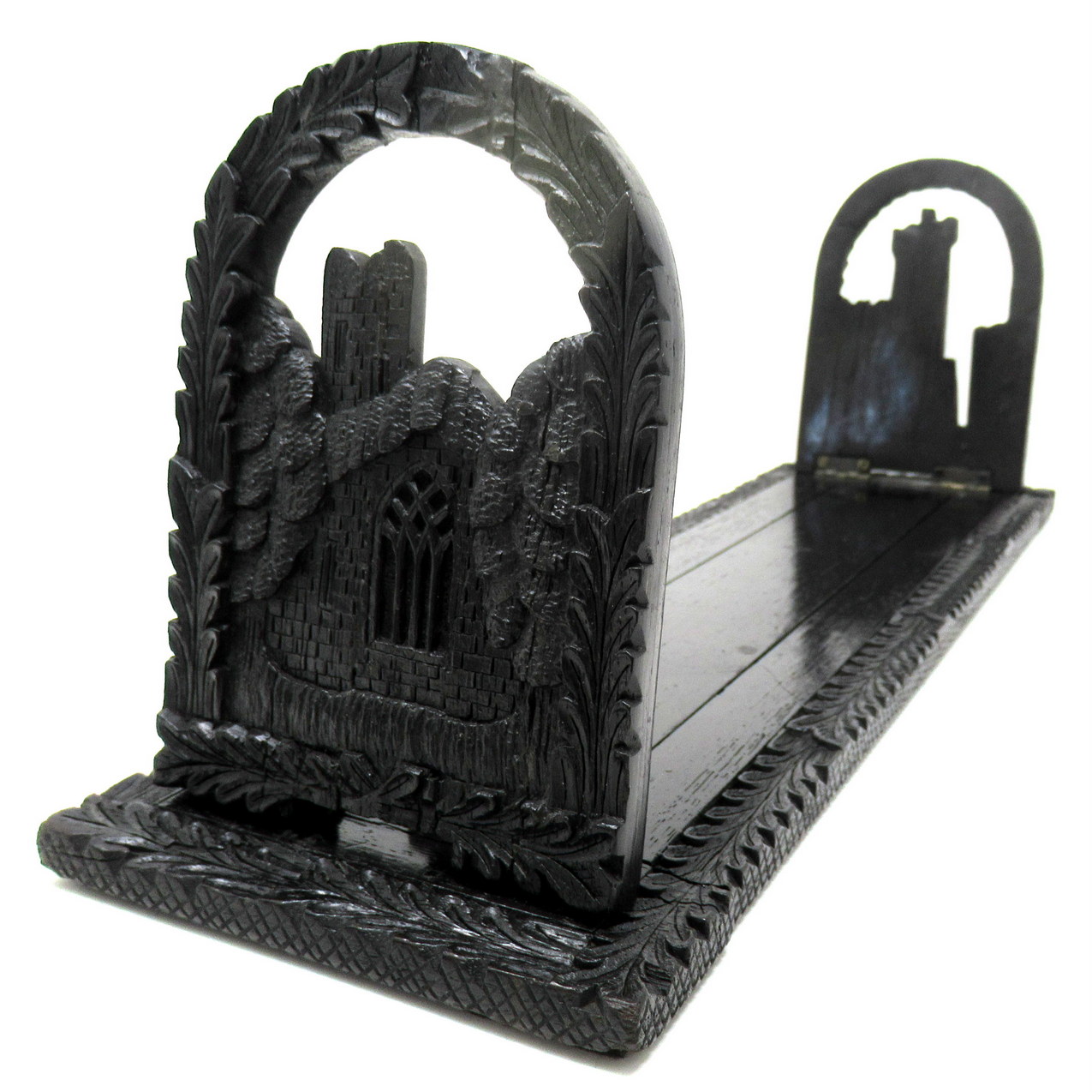 Each hinged folding bookends, one carved depicting an ancient view of Muckross Abbey, the other a view of Blarney Castle ruin, both flanked by an arched laurel leaf carved surround.