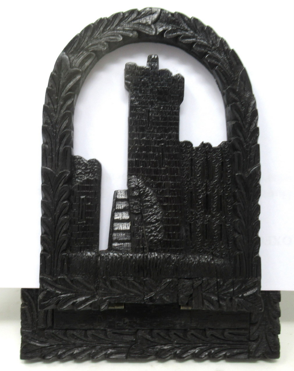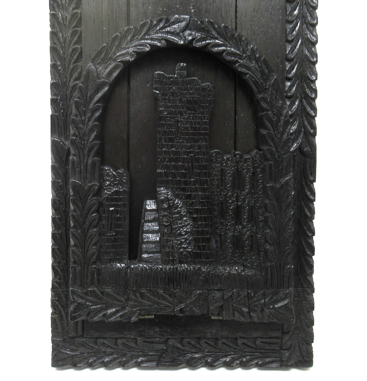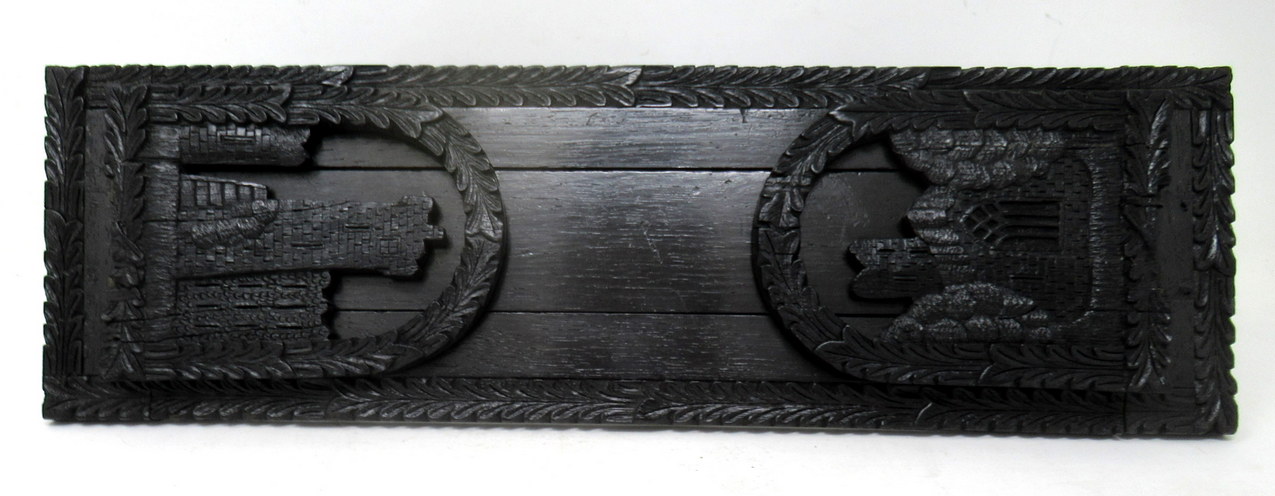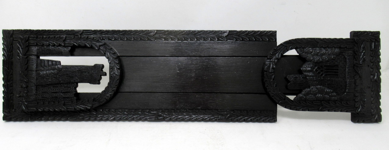 Each hinged folding bookends, one carved depicting an ancient view of Muckross Abbey, the other a view of Blarney Castle ruin, both flanked by an arched laurel leaf carved surround.