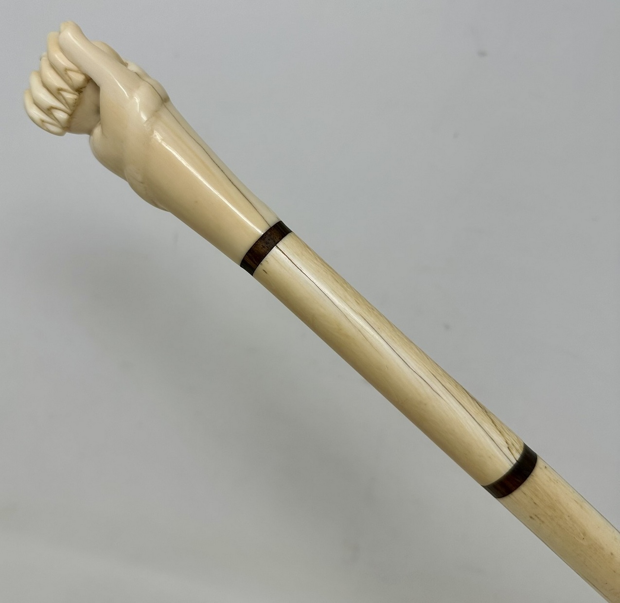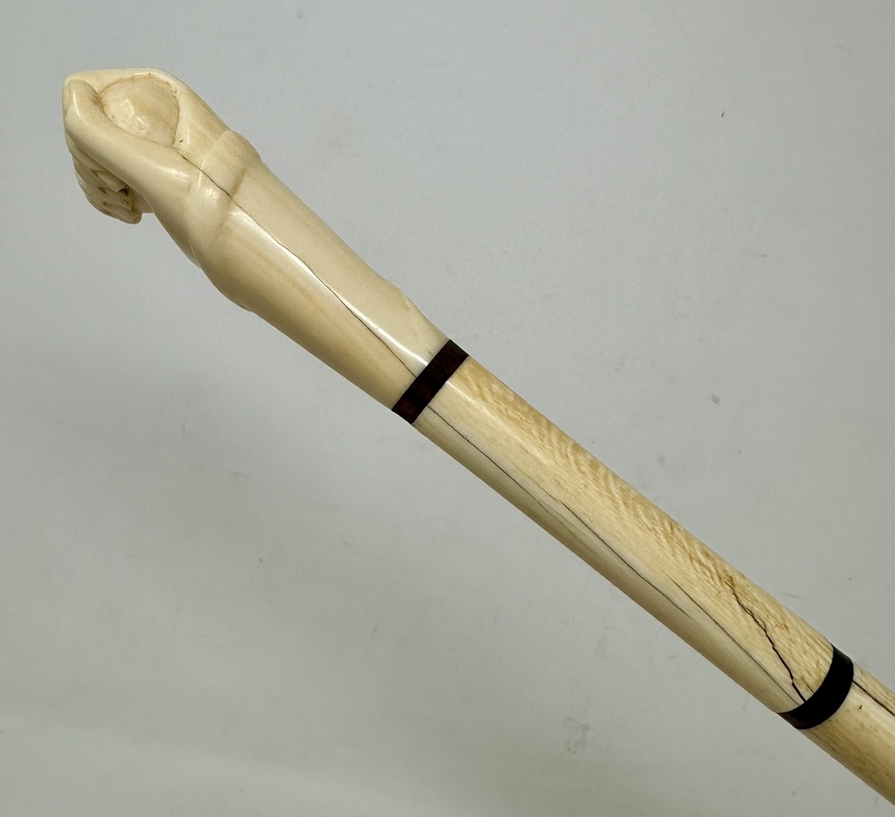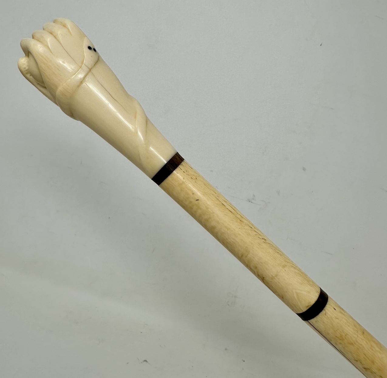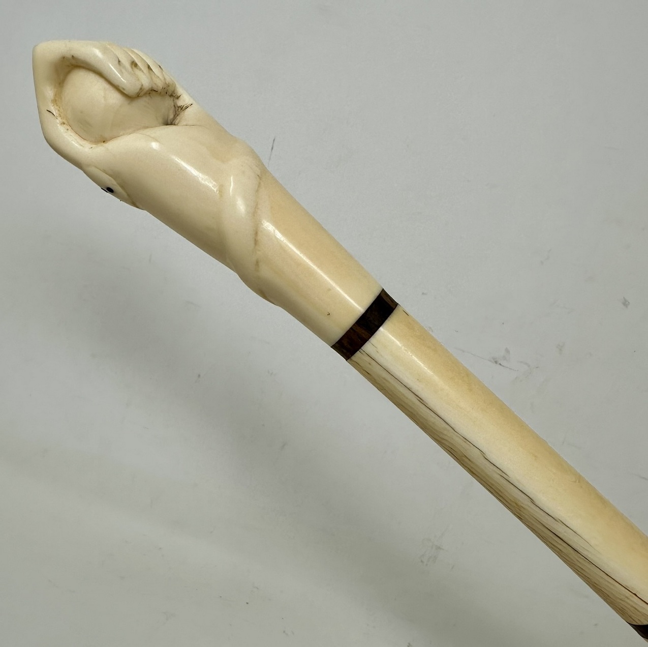 The hand carved decorative grip modelled as closed fist holding a ball with a carving of a snake outside above a plain tapering shaft, complete with its original metal ferrule