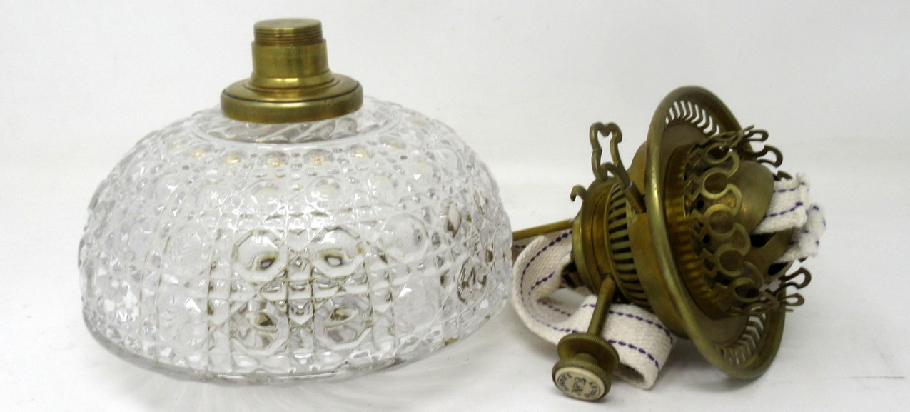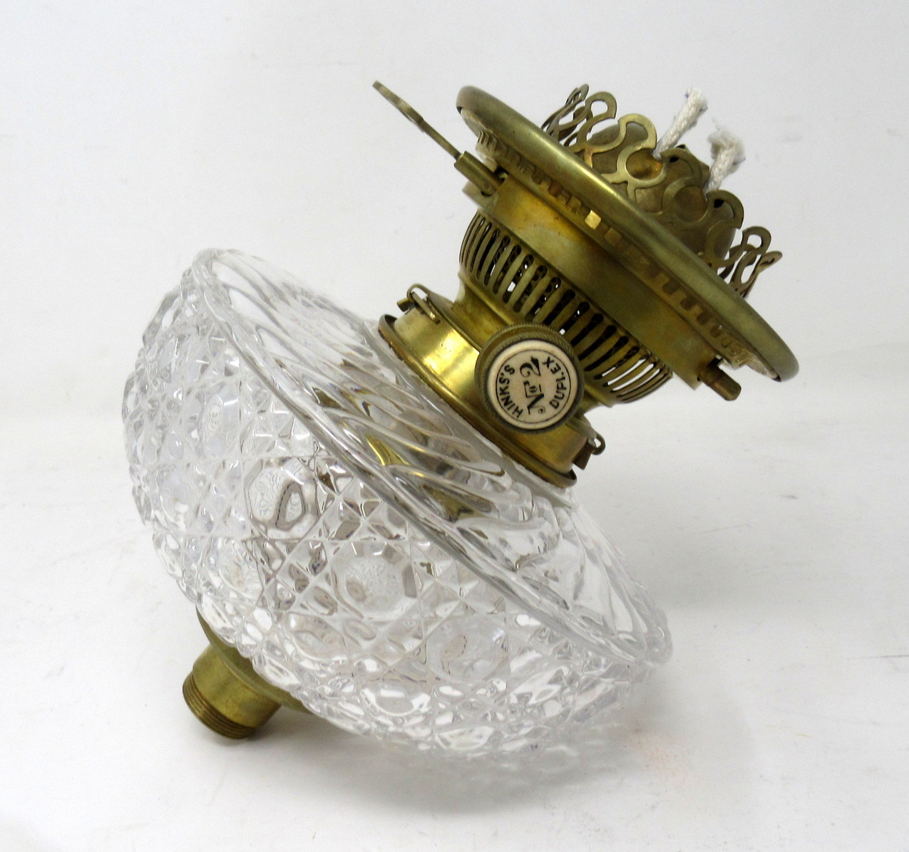 The original circular glass reservoir with strawberry cut pattern below its original double wick polished brass bayonet burner which is marked HINKS No 2 DUPLEX.