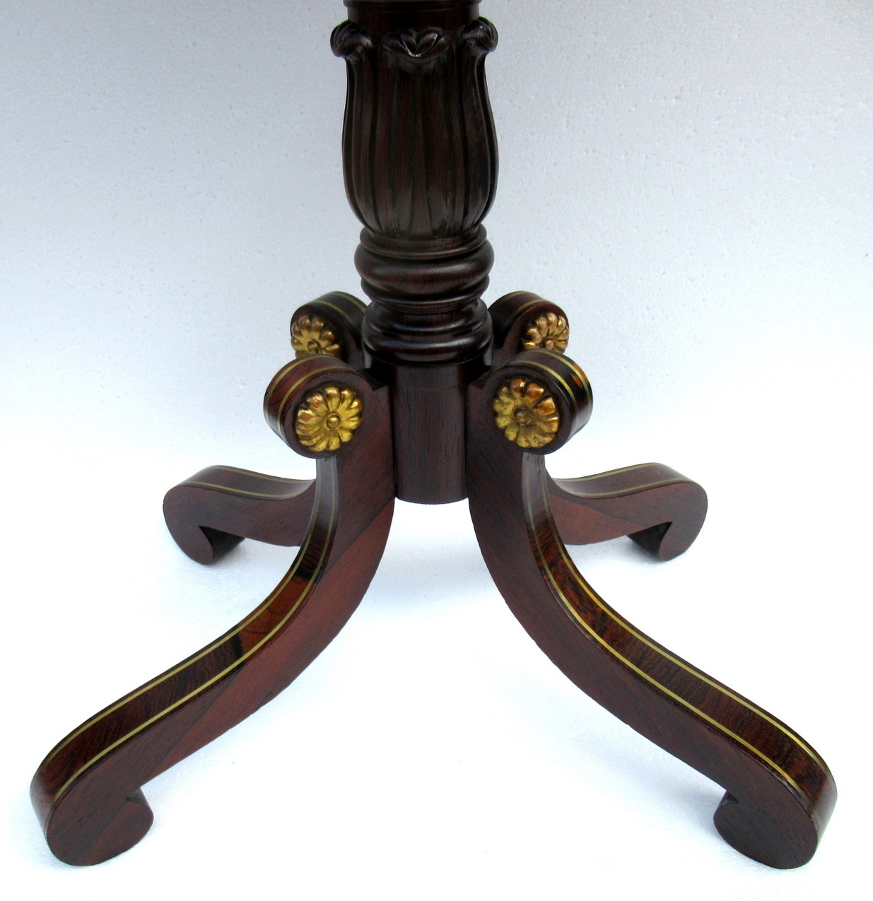 The rectangular top with rounded corners, raised on a plain ring turned column with Acanthus Leaf carvings ending on four downswept brass inlaid legs.