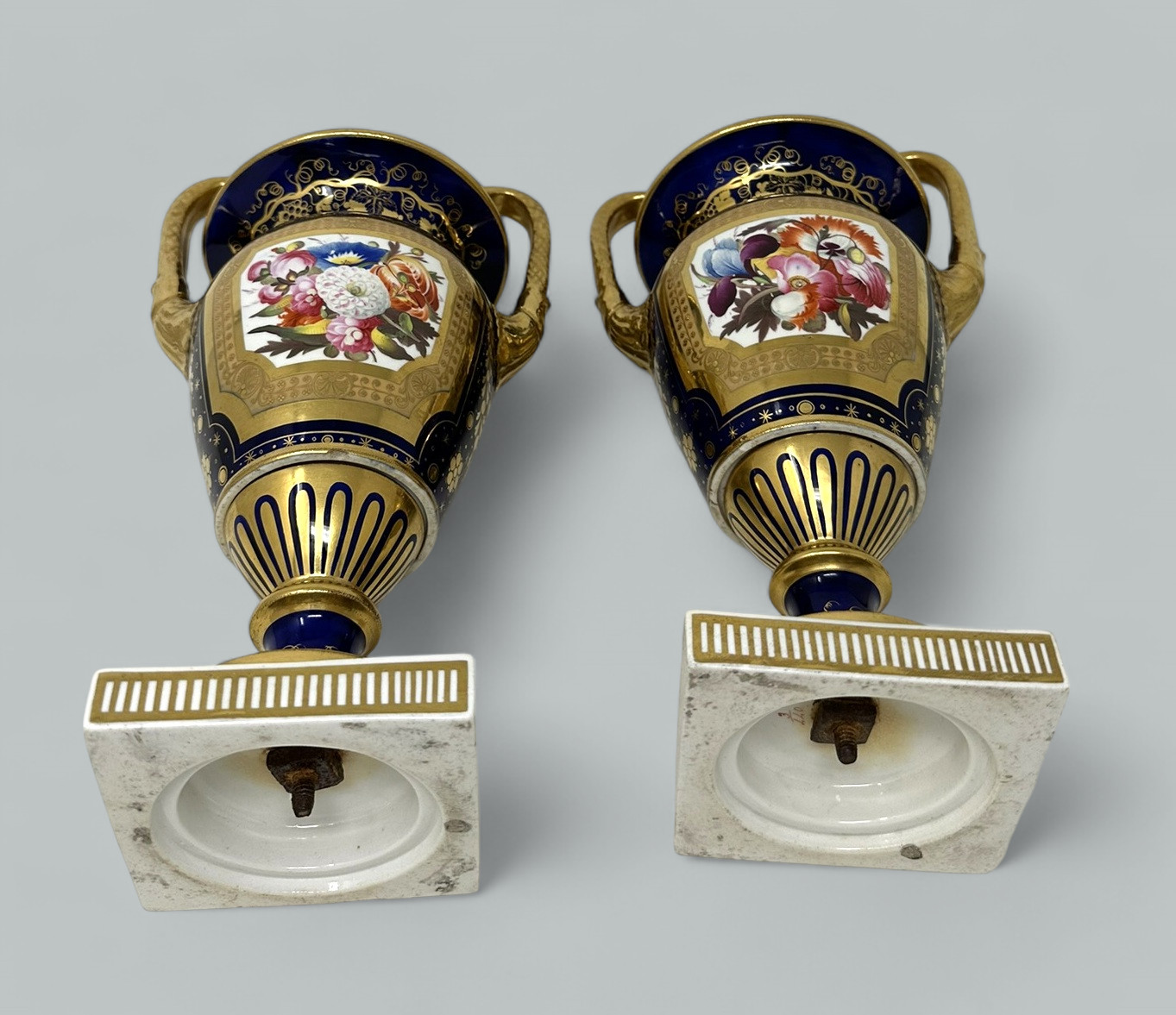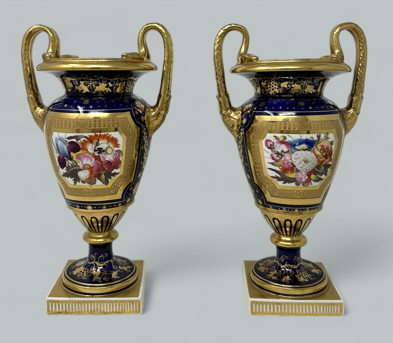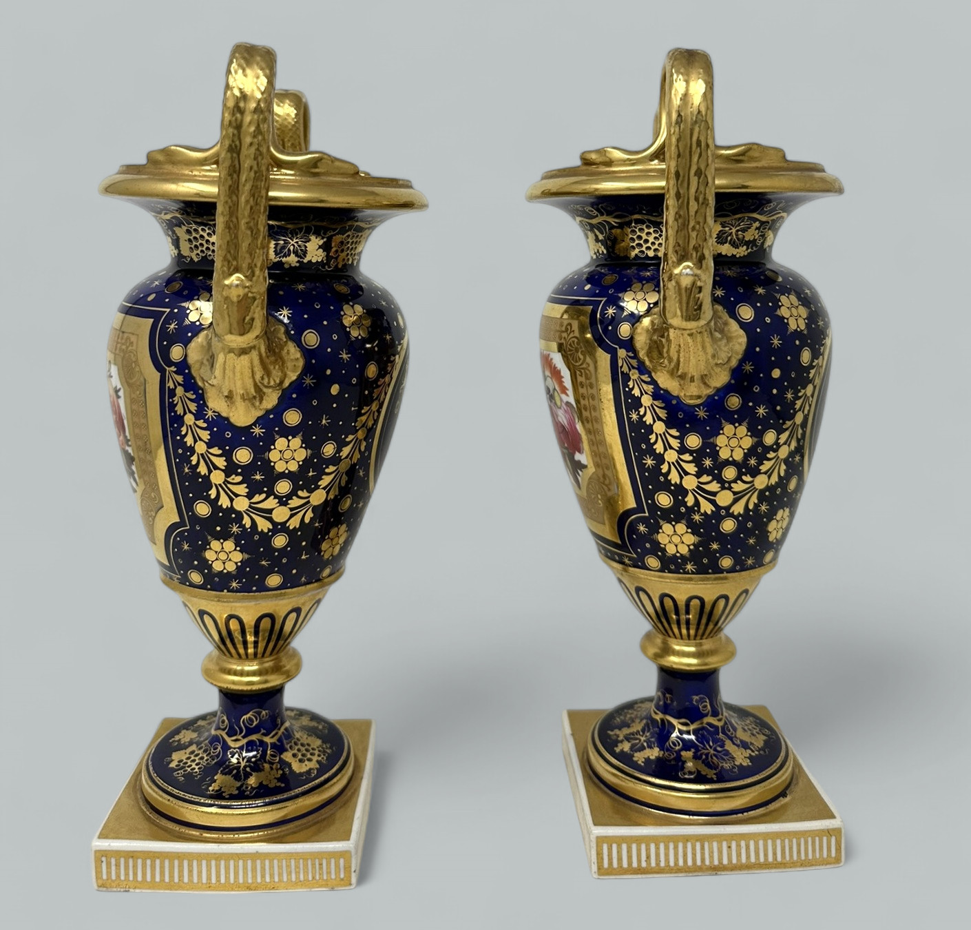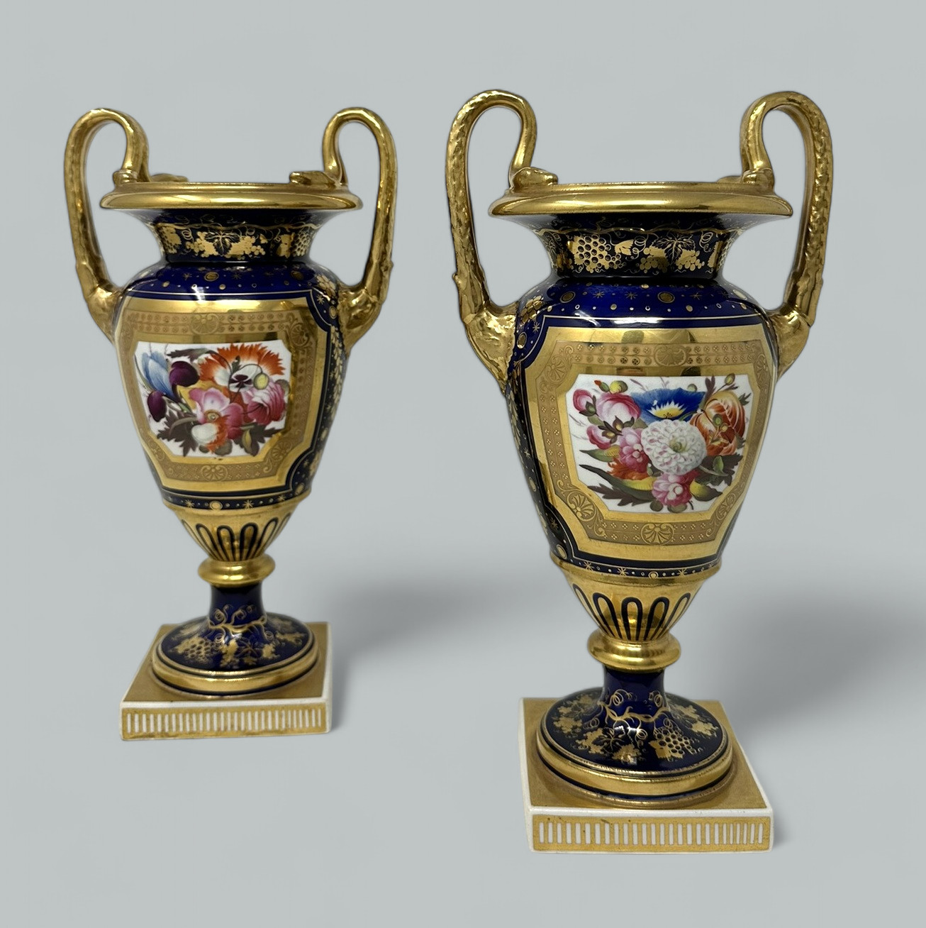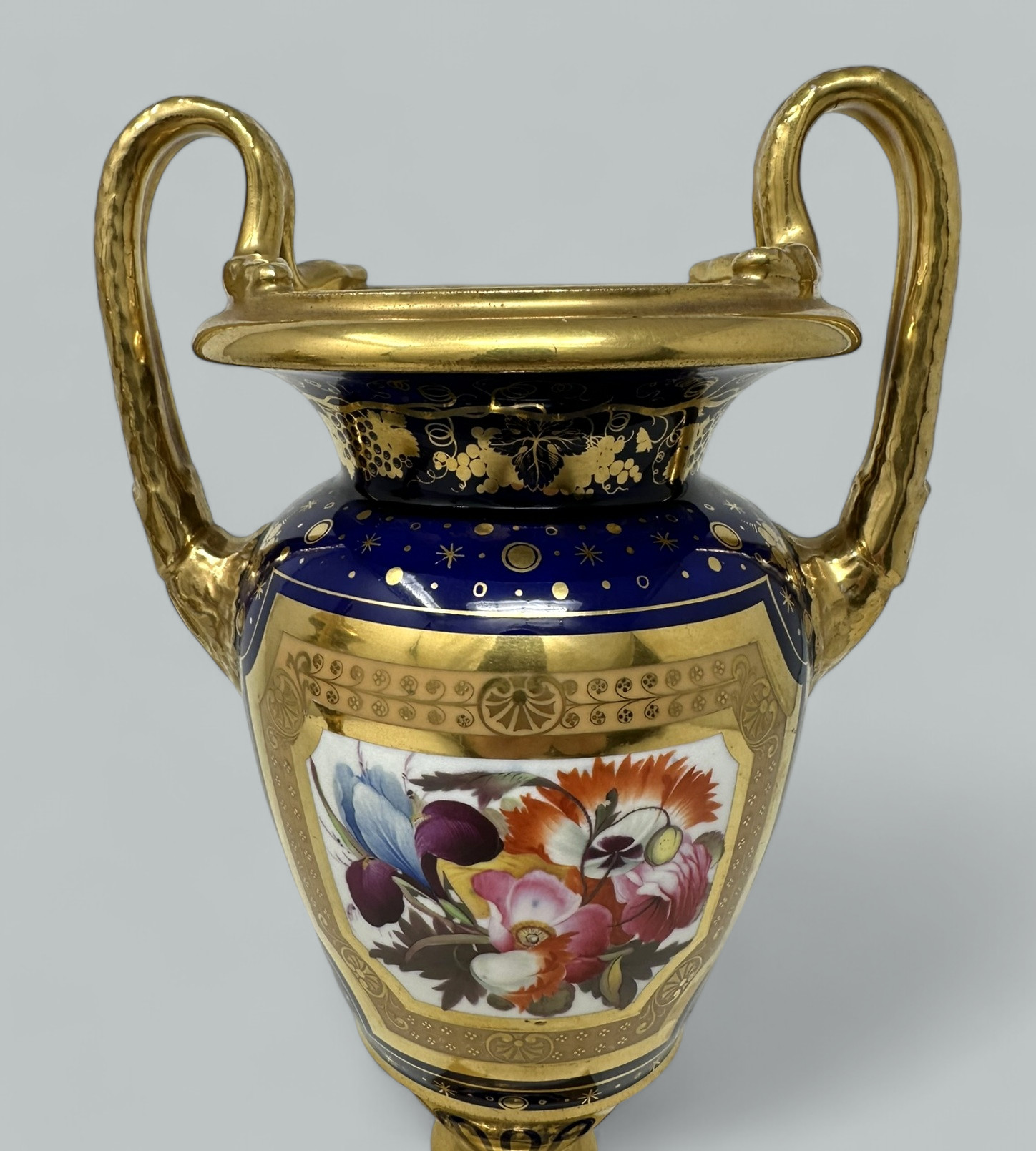 Each central reserve exquisitely hand painted depicting Summer Flowers within an elaborate gilt surround, above a circular support with foliate gilding on cobalt blue ground. The twin gilt handles modelled as snakes above acanthus leaf molding