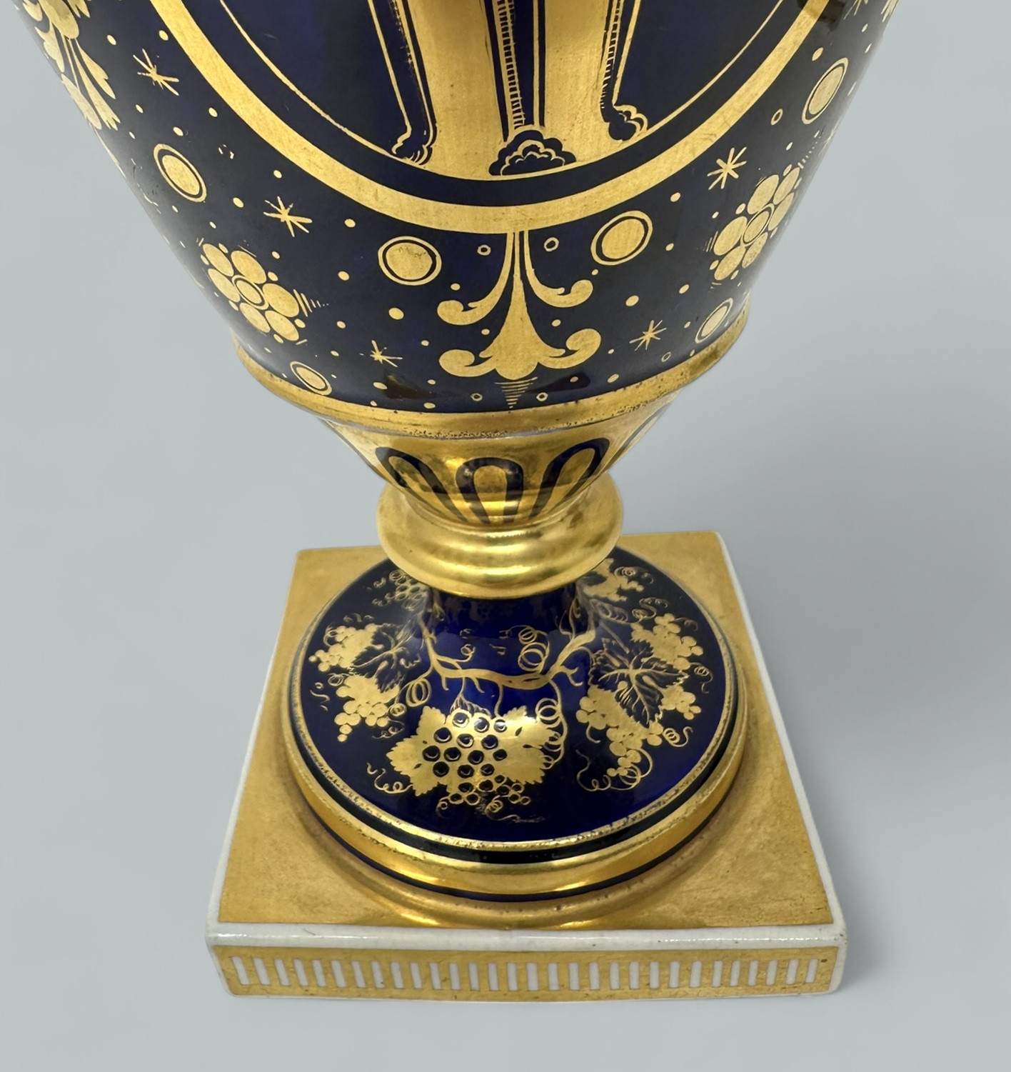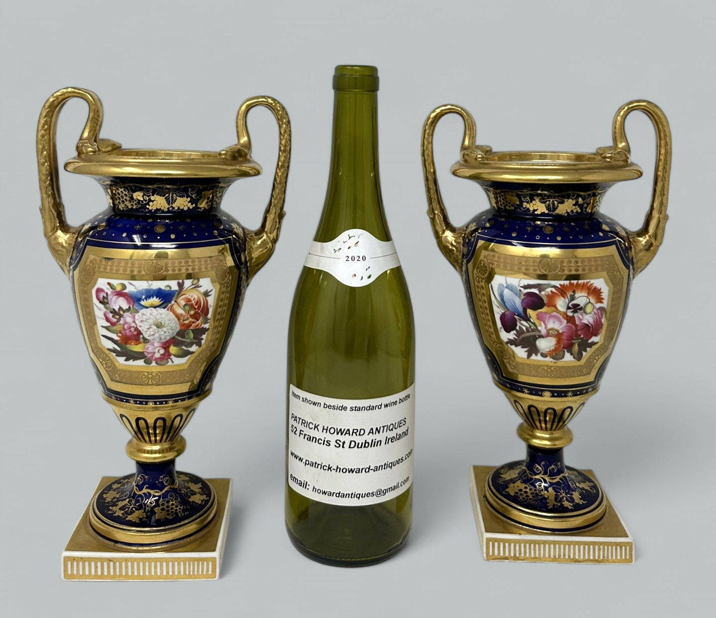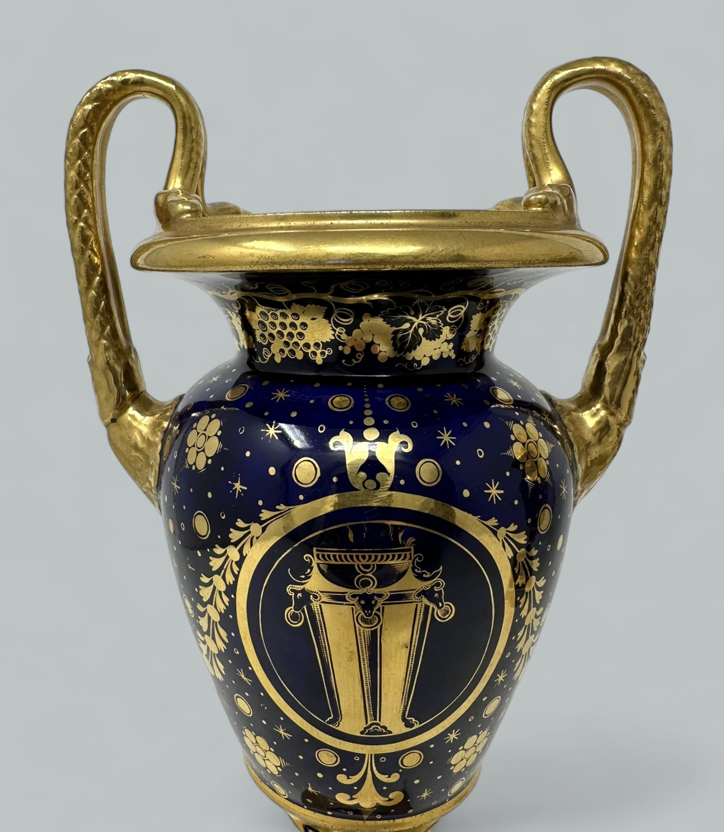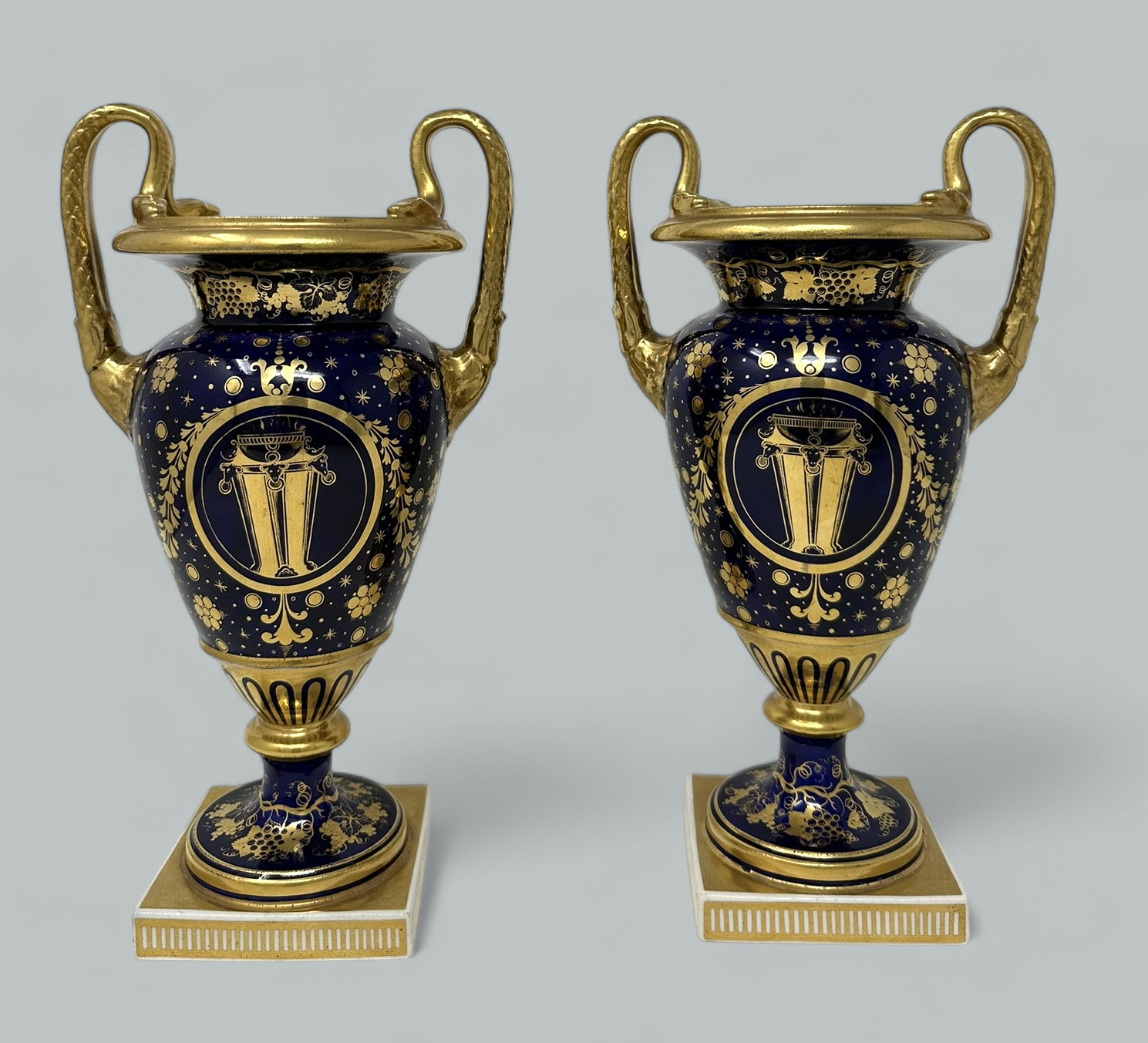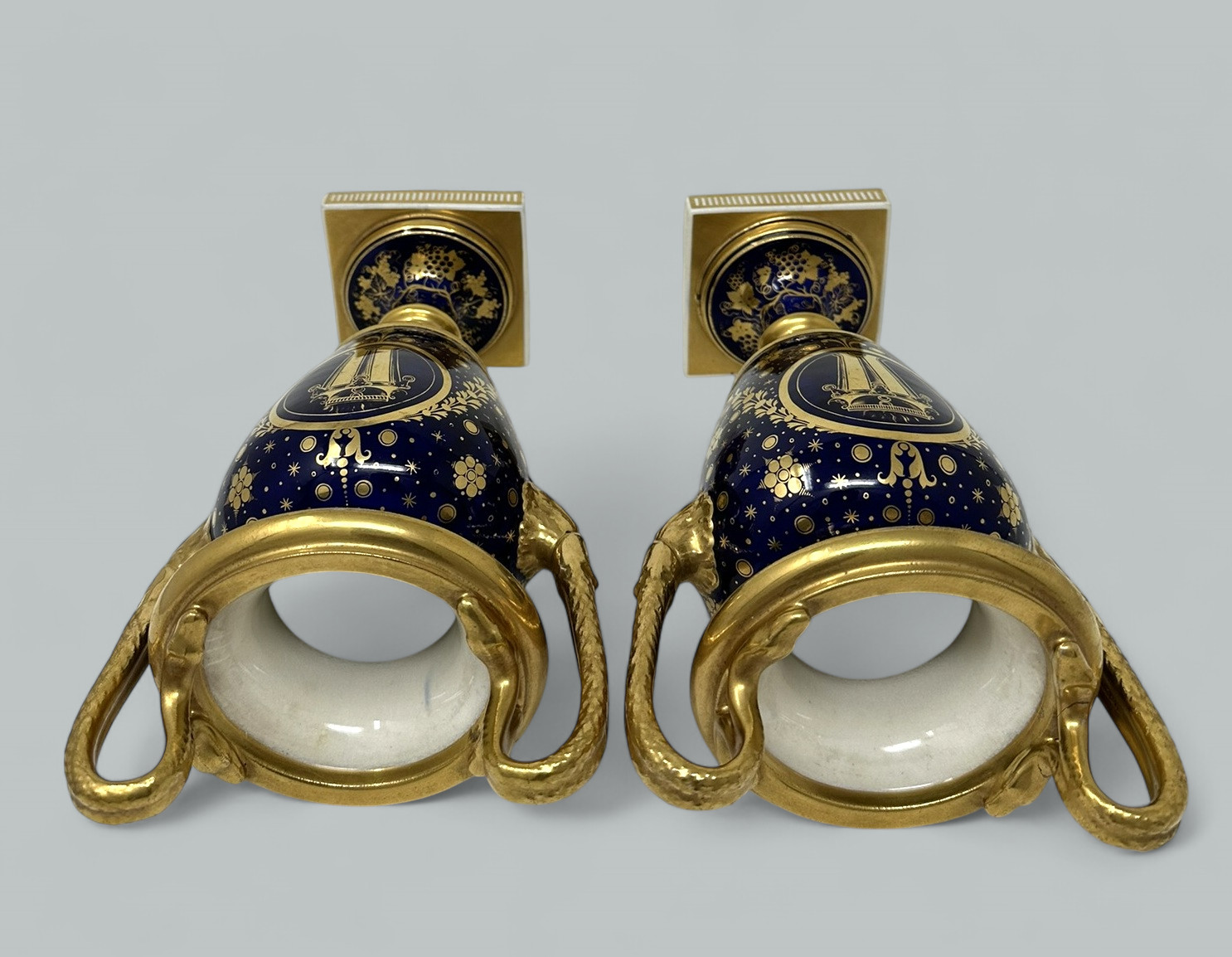 Each central reserve exquisitely hand painted depicting Summer Flowers within an elaborate gilt surround, above a circular support with foliate gilding on cobalt blue ground. The twin gilt handles modelled as snakes above acanthus leaf molding