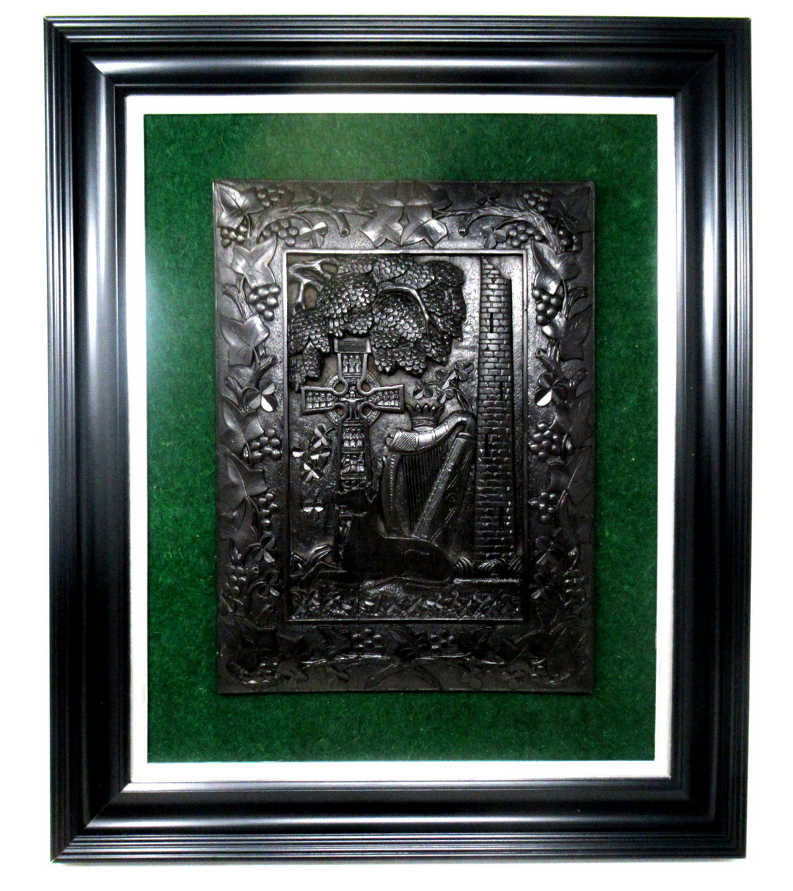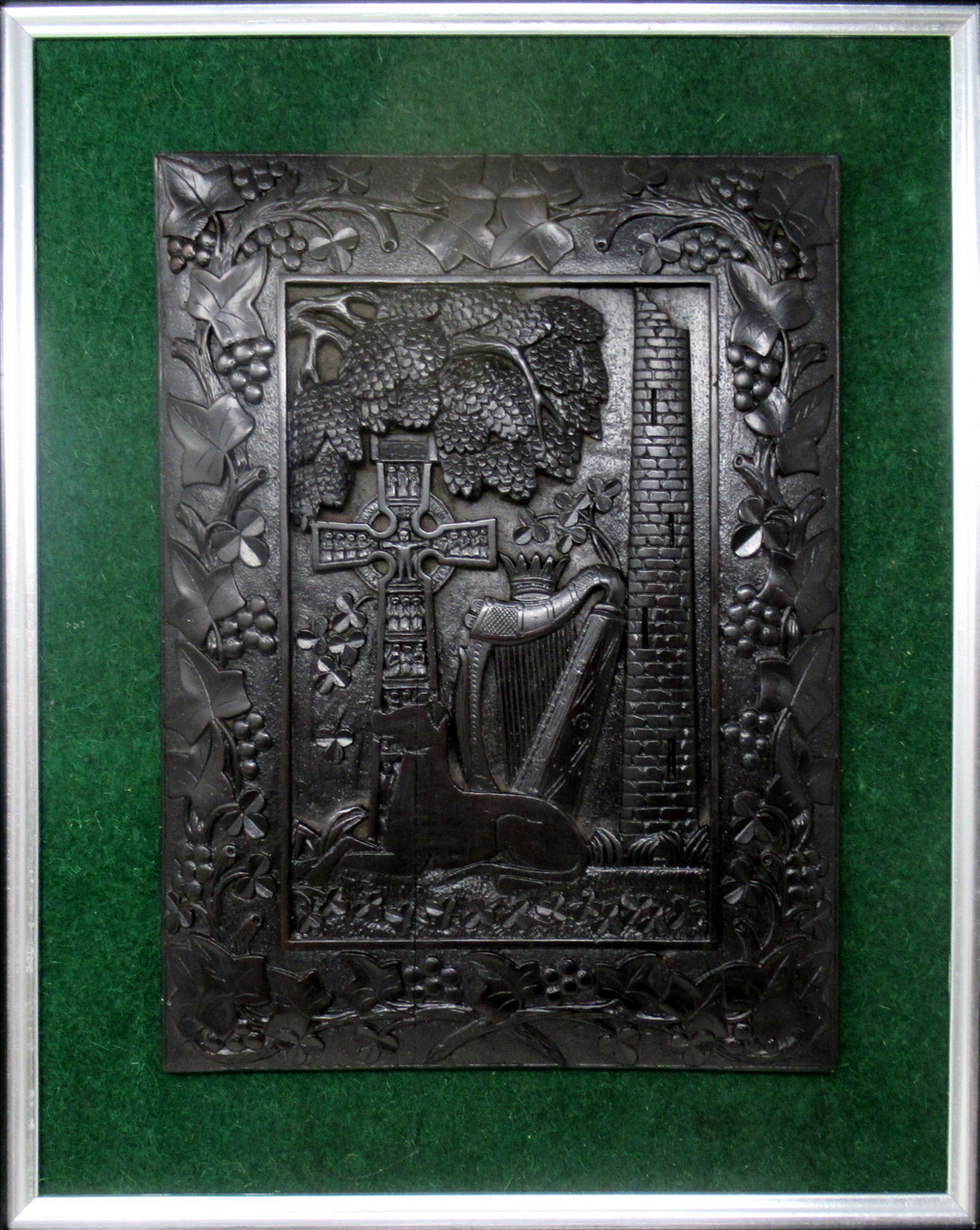The central reserve depicting carvings of an Irish Wolfhound, Celtic Cross, a Round Tower and an Irish Hearp all within a surround of carvings depicting Shamrocks, leaves and berries. The plaque is attached to a green baise background and framed with an ebonised wooden frame with silver slip.