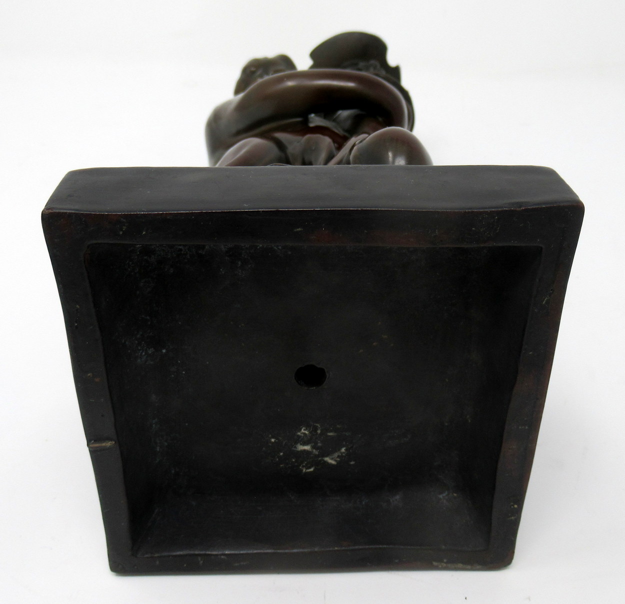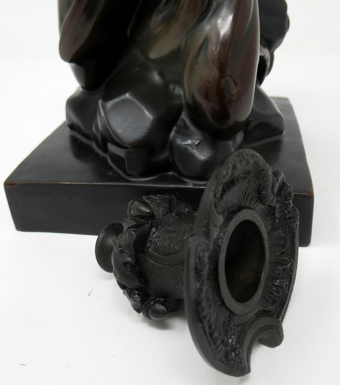 The figure is seated on a rocky outcrop holding a Cornucopia which is mounted with a decorative patinated bronze removable single candle holder.