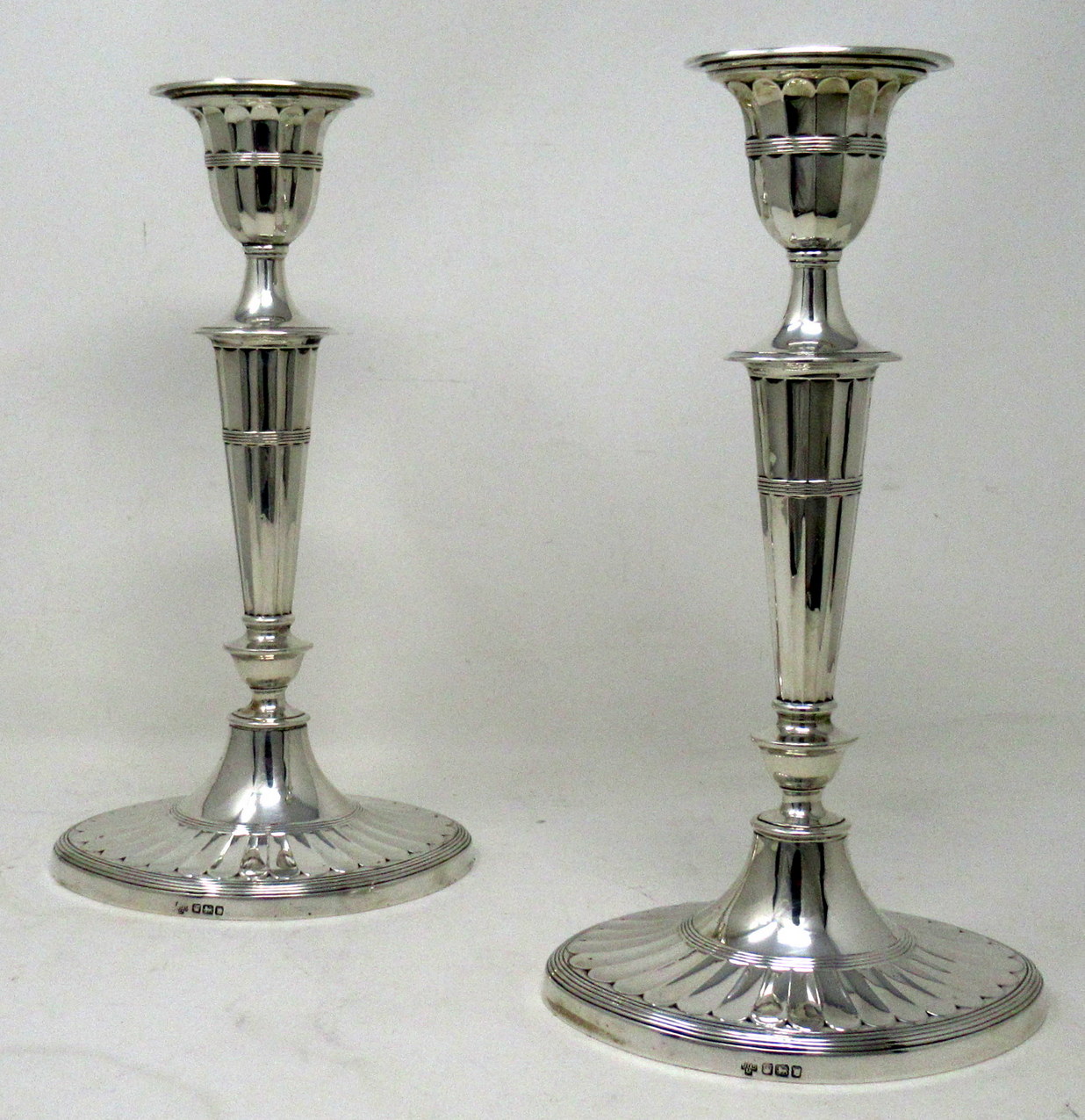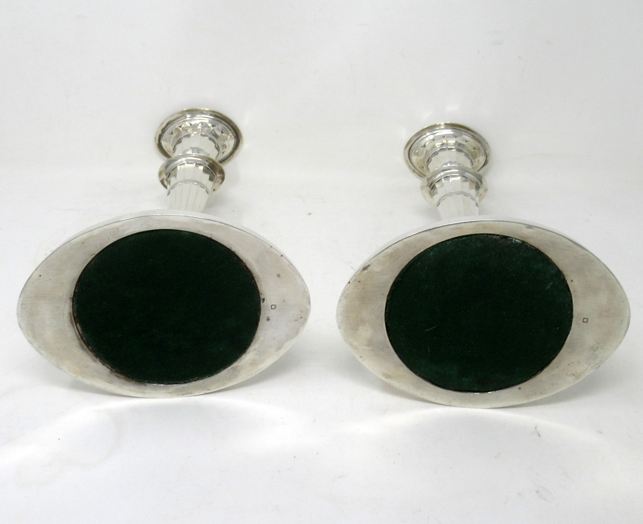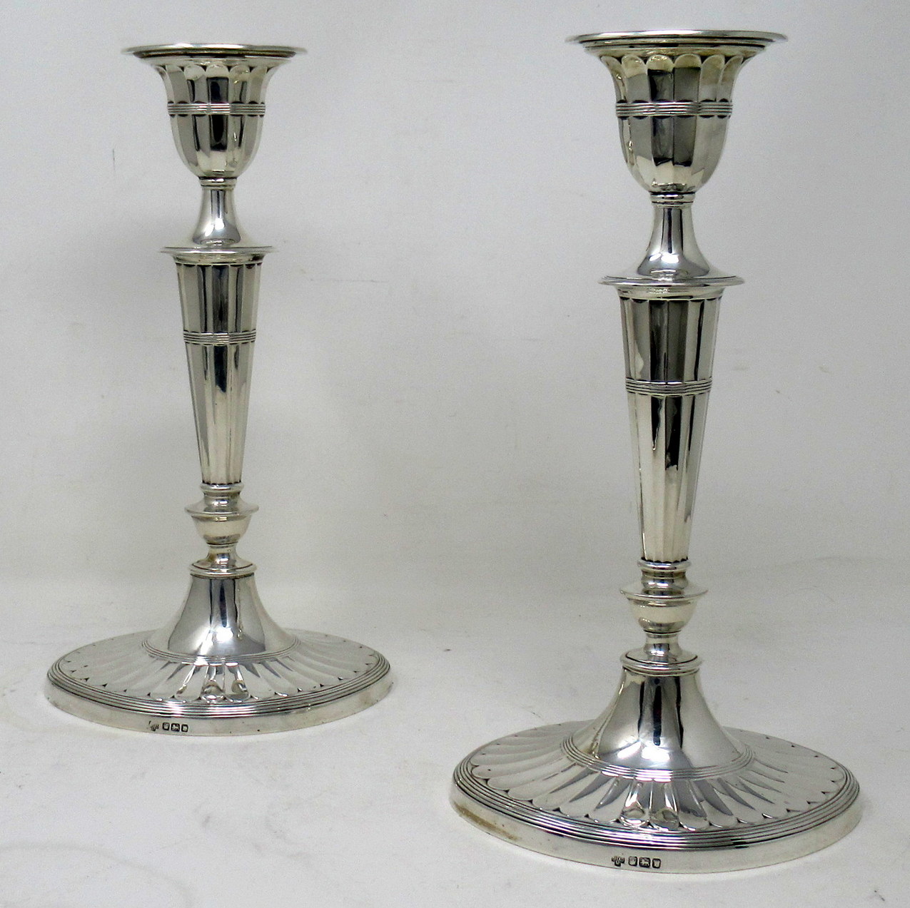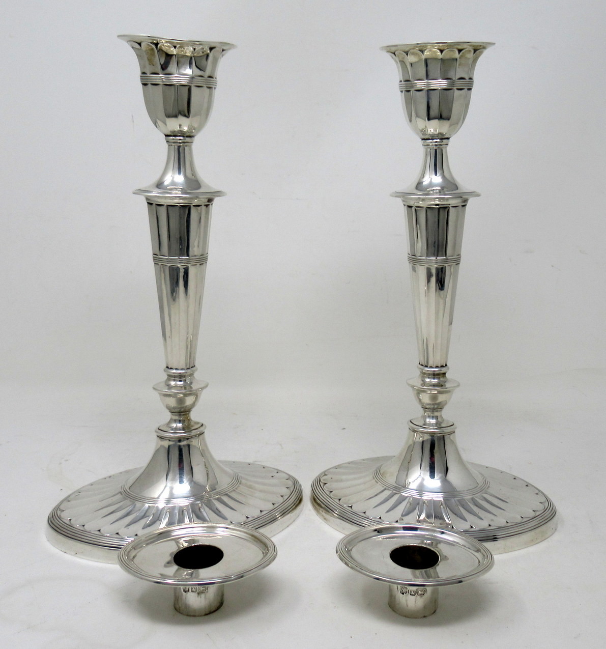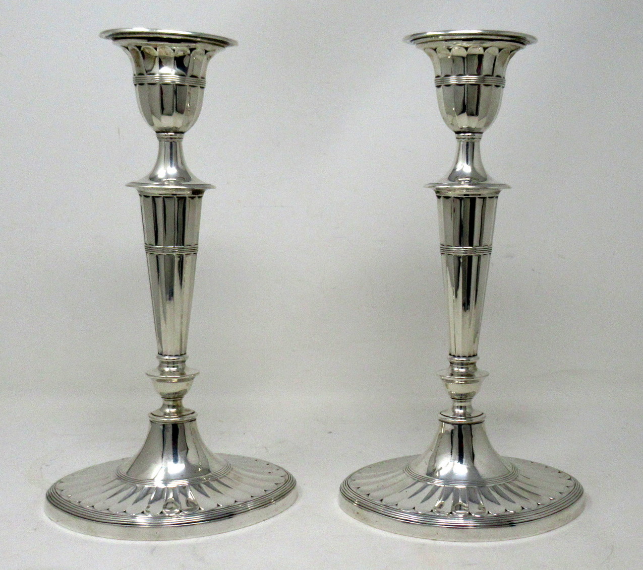 Each with stepped oval spreading decorative bases, the oval fluted tapered column stems with urn shaped sockets and detachable ornately cast reeded edged firm fitting nozzles.